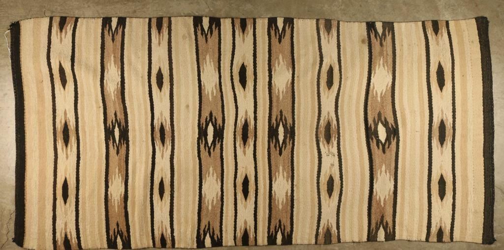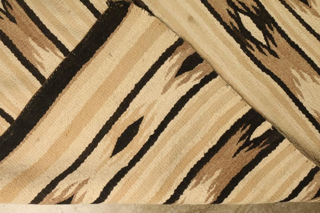 Snowflake pattern in all natural black and tan. Some holes, small stains and fraying to edges. Measures 74"x35" Circa 1940s-50s
