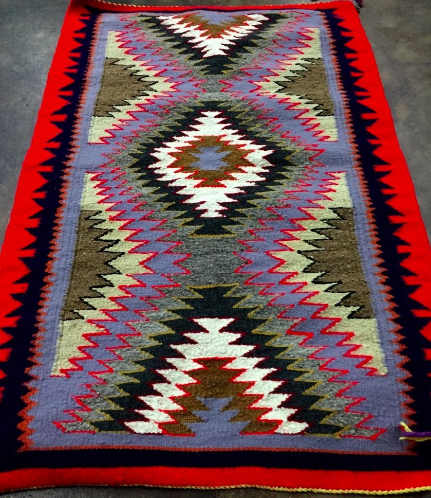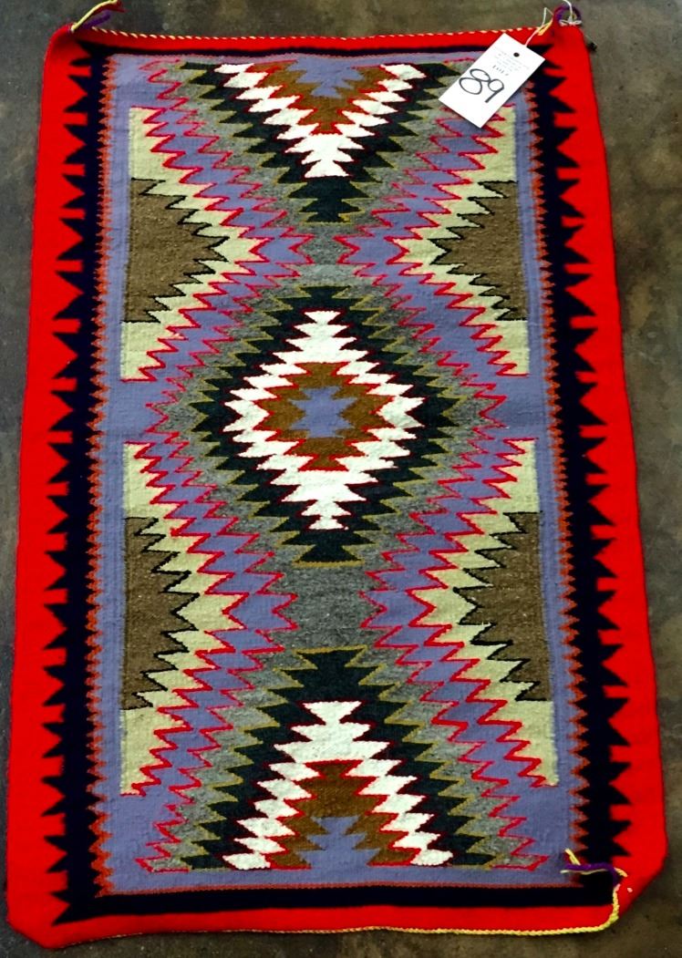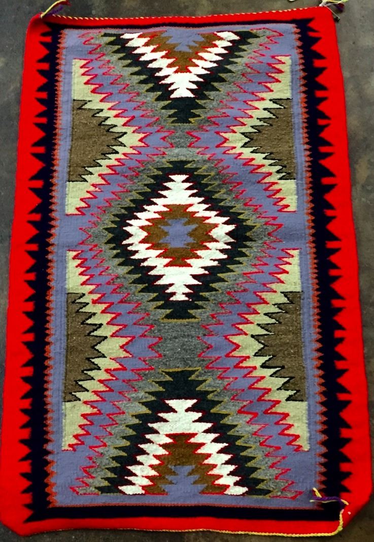 This vintage Navajo textile has a tag attached attributing it to Annie Wilson, Bloomfield, New Mexico. It measures 21.5” x 33". Very nice condition for its age.