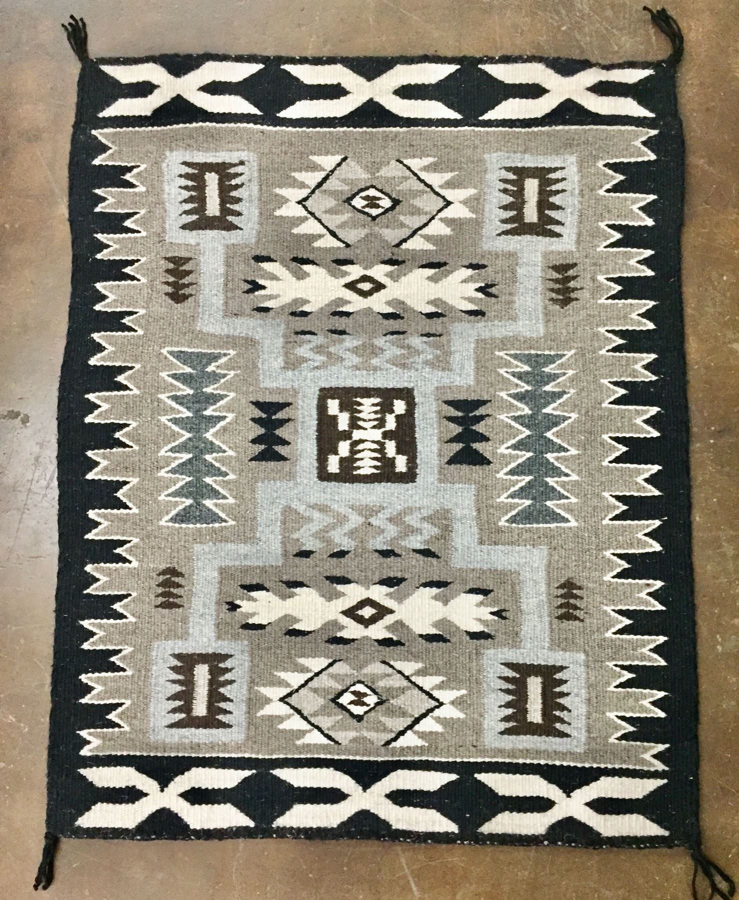 Description: Offered for sale in this lot we have this beautiful Navajo textile by Katie Benally. This is a good looking little rug with grays, blacks and browns. Maker: Has a tag that says, Katie Benally. Navajo. Approx. Age: Modern. Size: 26 inches wide x 31-1/2 inches long. Condition: Good for its age, normal wear expected. Please look closely at the pictures - they are an important part of our description. Shipping: There will be a $7 handling, packaging fee for shipping this lot. The actual cost of postage will be added on top of that.