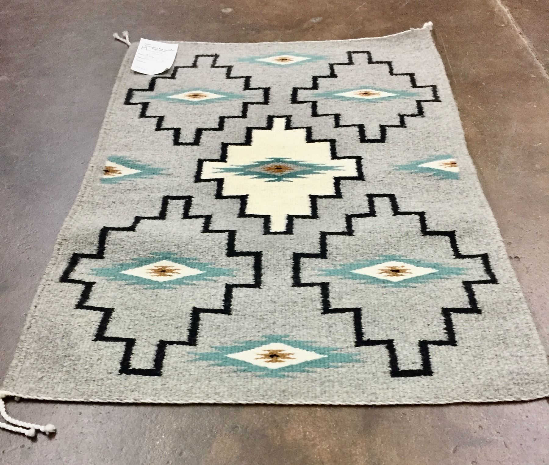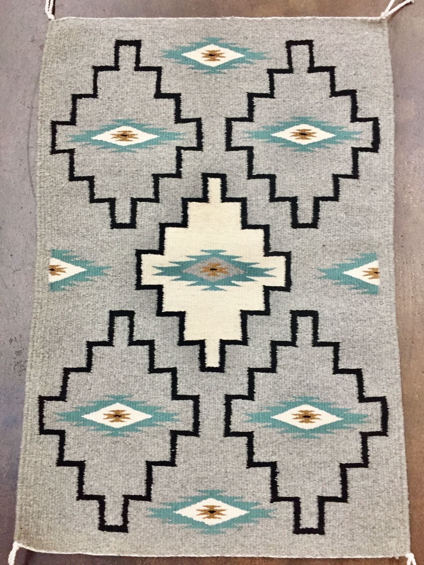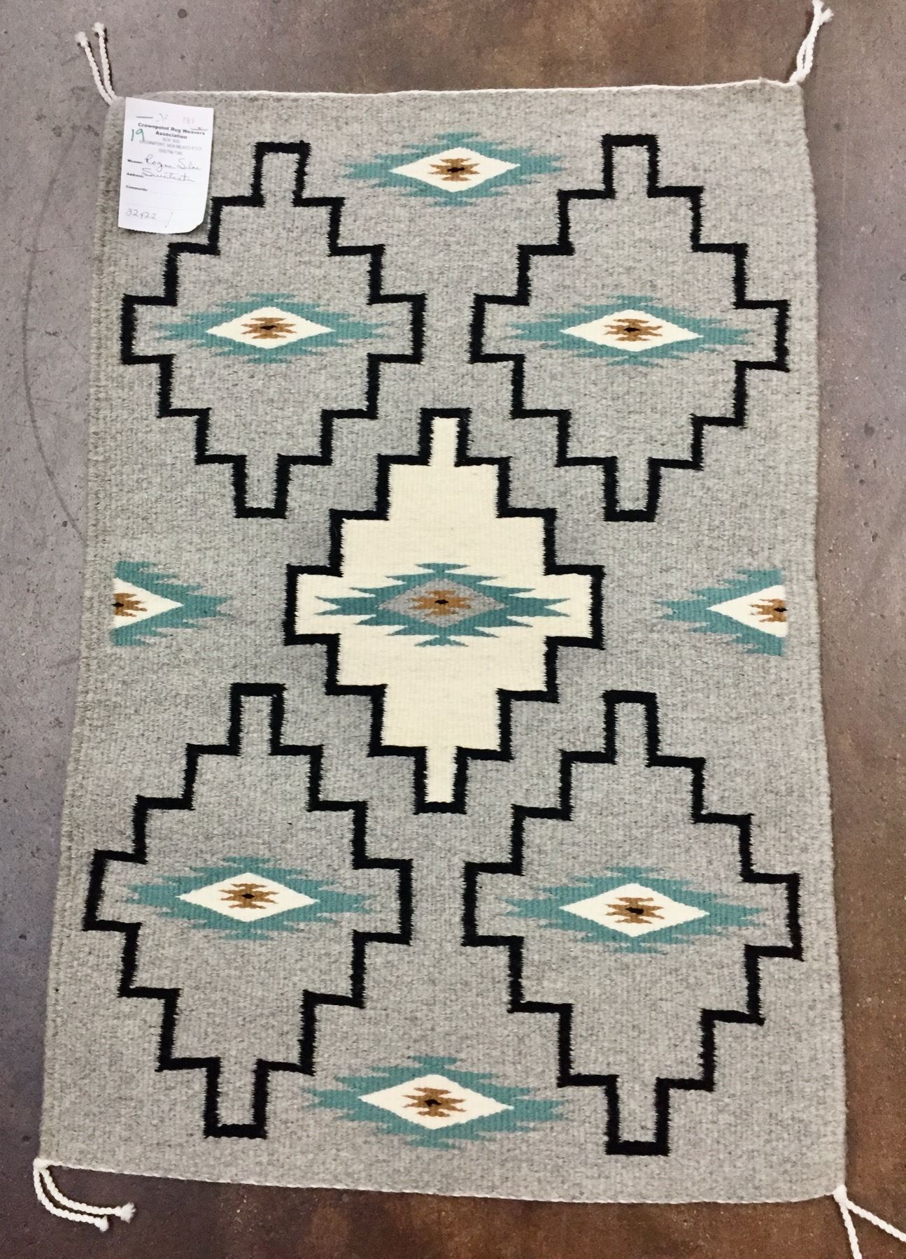 Description: Presented for sale in this lot is a good looking Navajo textile by Regina Silas. This rug features a simple pattern in grays, teals, whites and blacks. Maker: Regina Silas is on the tag. Approx. Age: Modern. Size: 32 inches long x 22 inches wide. Condition: Good for its age, normal wear expected. Please look closely at the pictures - they are an important part of our description. Shipping: There will be a $7 handling, packaging fee for shipping this lot. The actual cost of postage will be added on top of that.