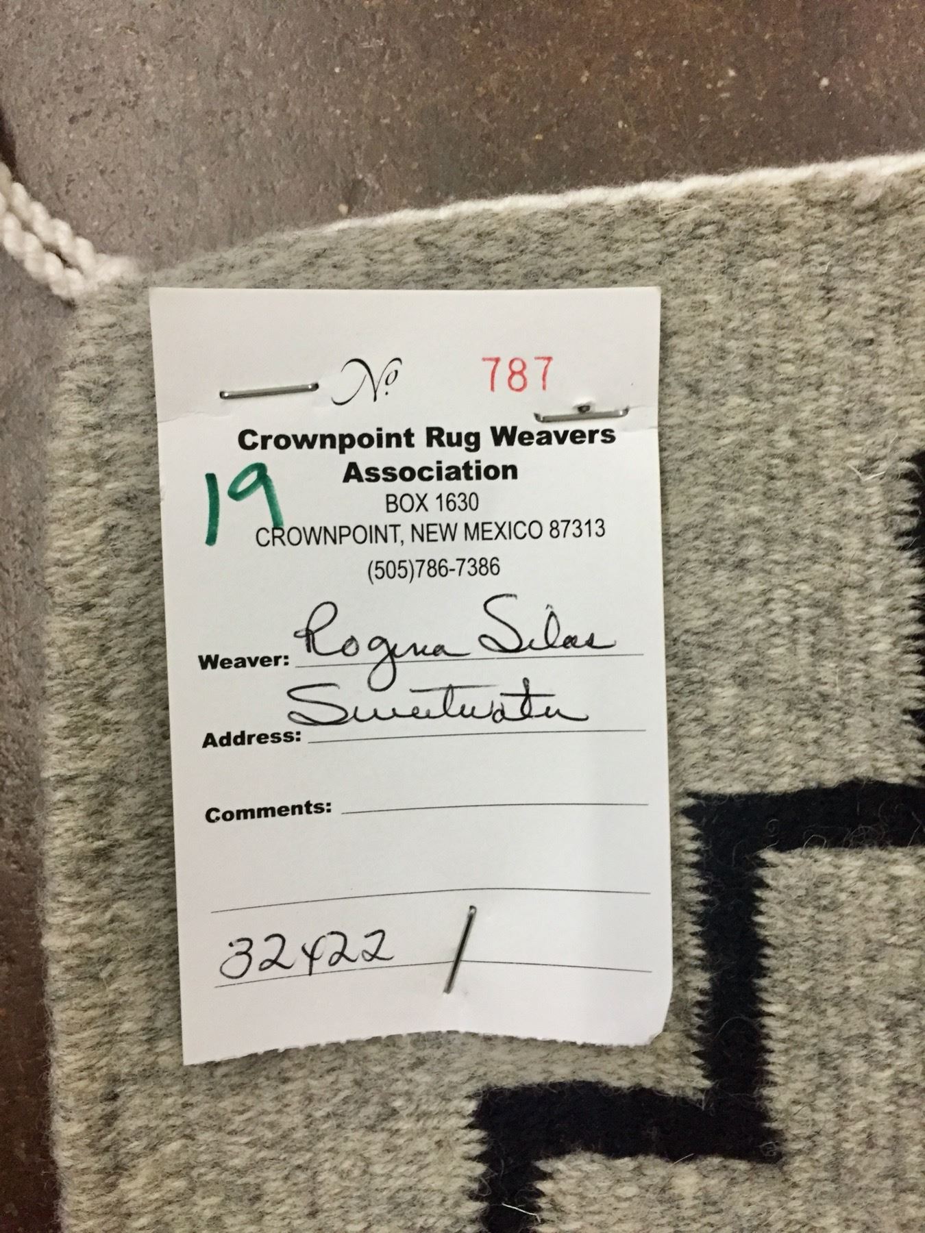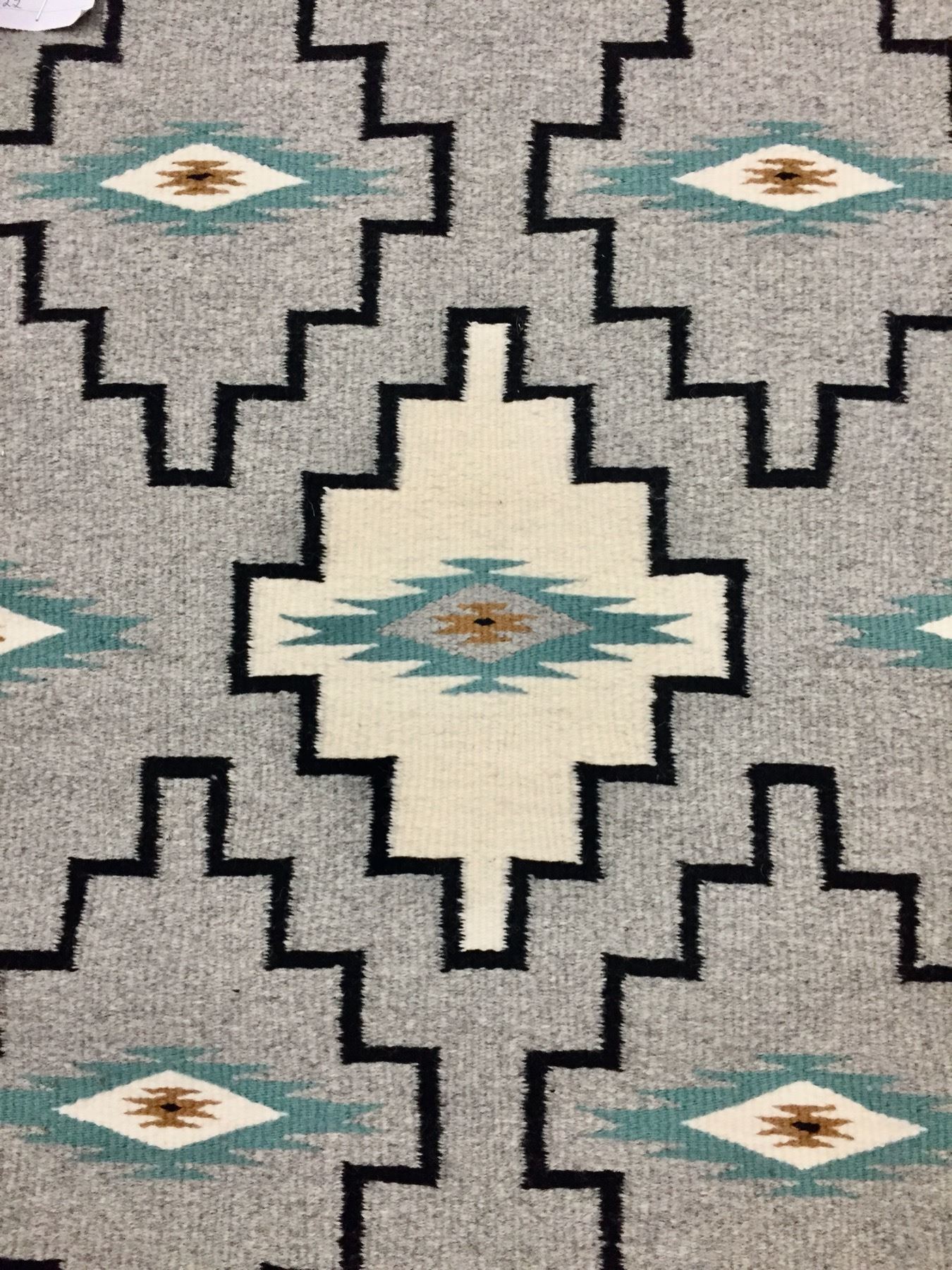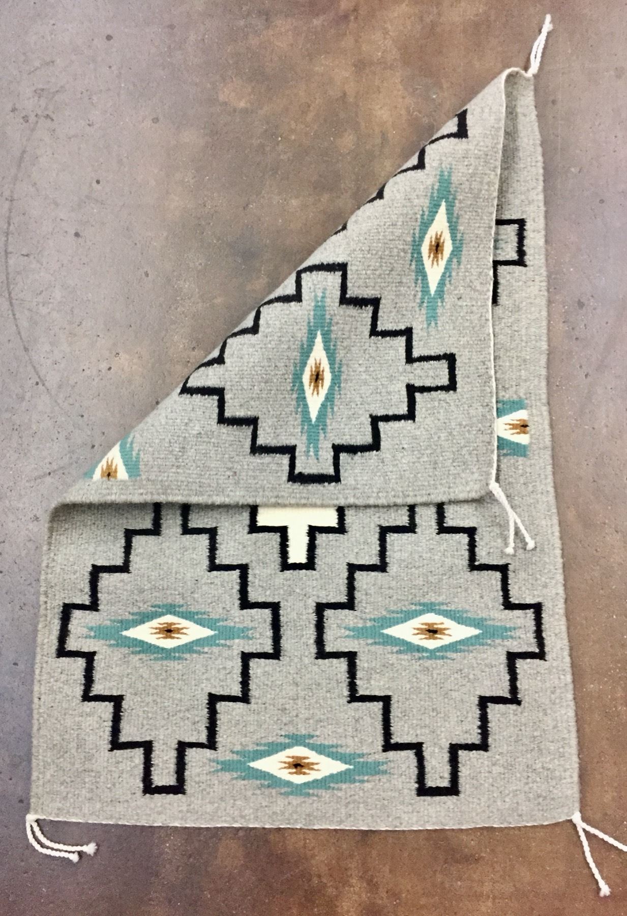 Description: Presented for sale in this lot is a good looking Navajo textile by Regina Silas. This rug features a simple pattern in grays, teals, whites and blacks. Maker: Regina Silas is on the tag. Approx. Age: Modern. Size: 32 inches long x 22 inches wide. Condition: Good for its age, normal wear expected. Please look closely at the pictures - they are an important part of our description. Shipping: There will be a $7 handling, packaging fee for shipping this lot. The actual cost of postage will be added on top of that.
