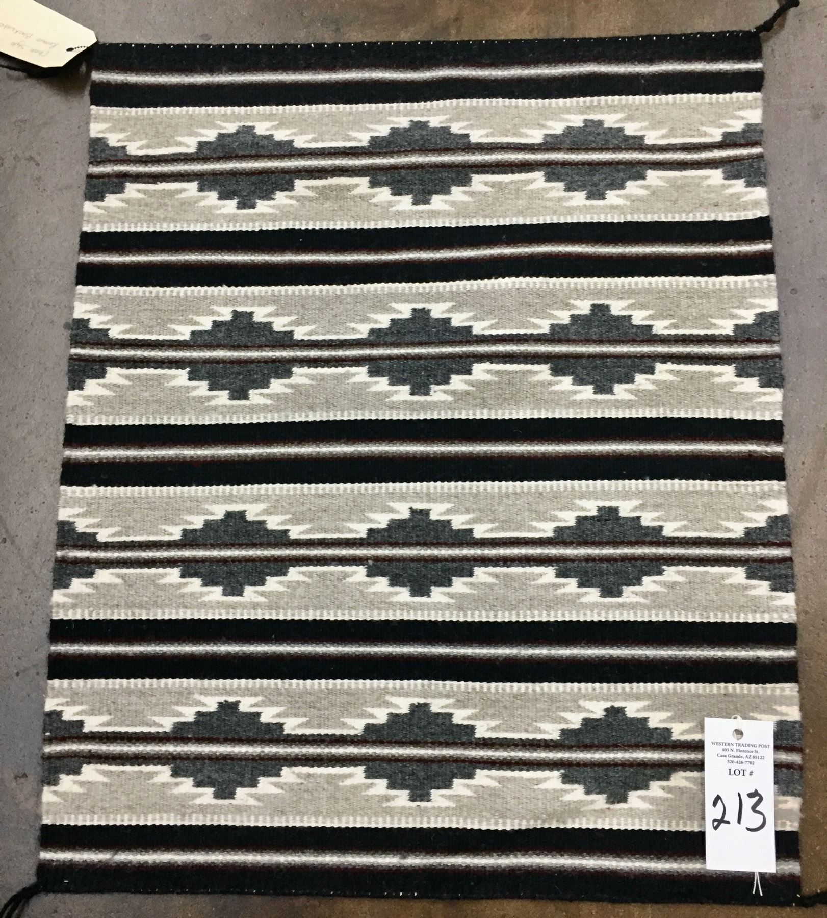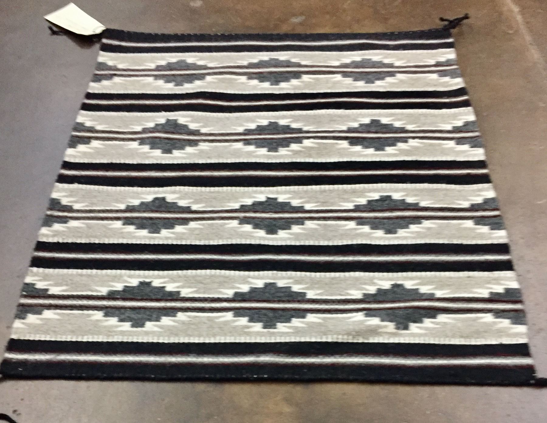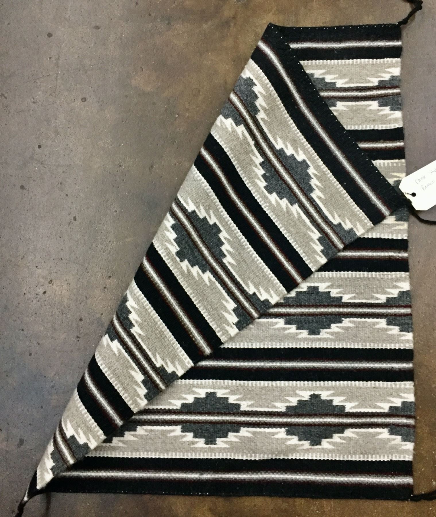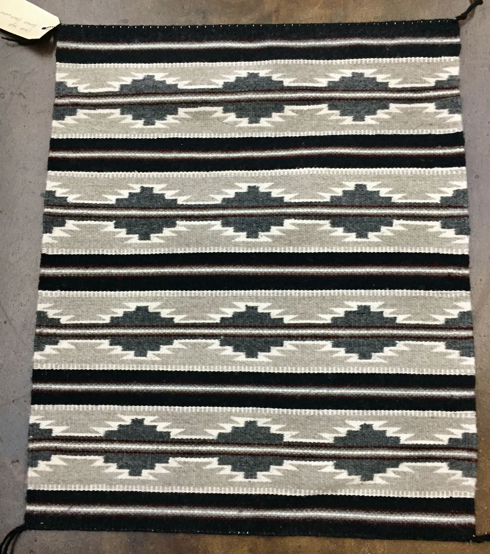 Description: Presented for sale in this lot is a beautiful little Chinle style Navajo textile with a pattern featuring grays, tans, reds, blacks and whites. Maker: Romero Blackwater is written on the tag. Approx. Age: Modern. Size: 23 inches wide x 28 inches long. Condition: Good for its age, normal wear expected. Please look closely at the pictures - they are an important part of our description. Shipping: There will be a $7 handling, packaging fee for shipping this lot. The actual cost of postage will be added on top of that.