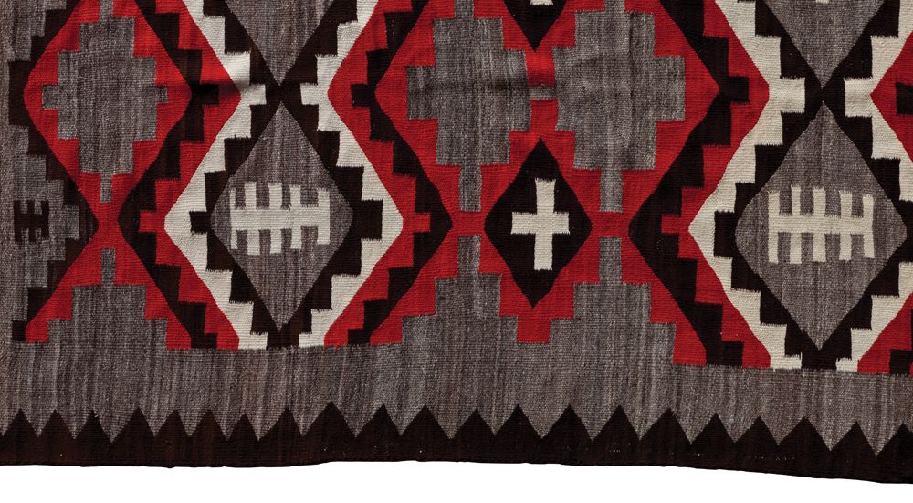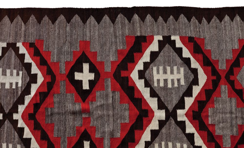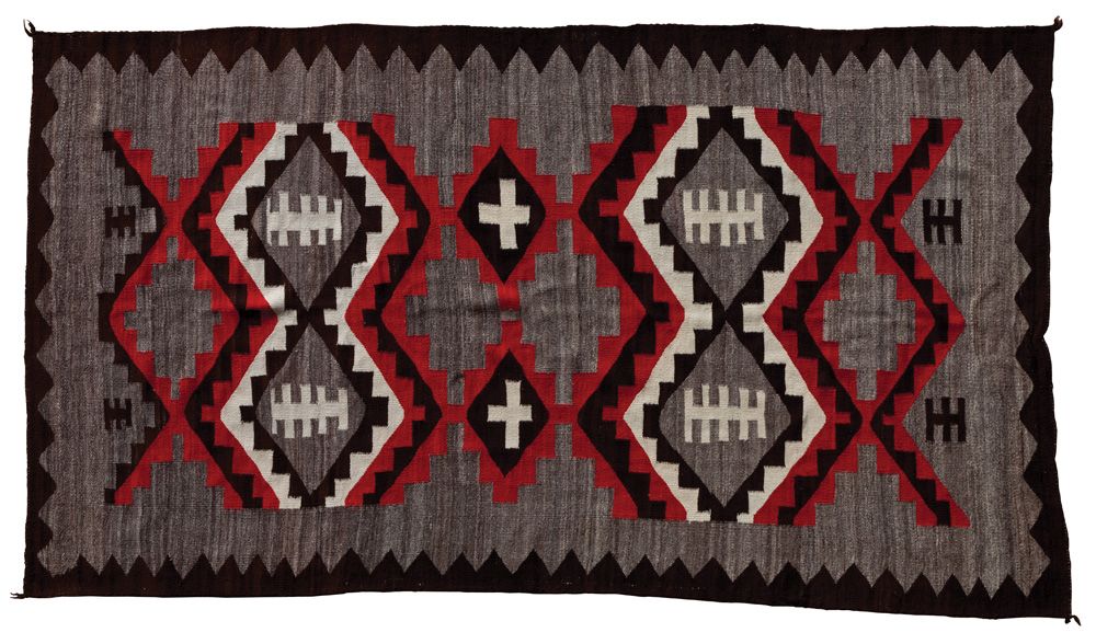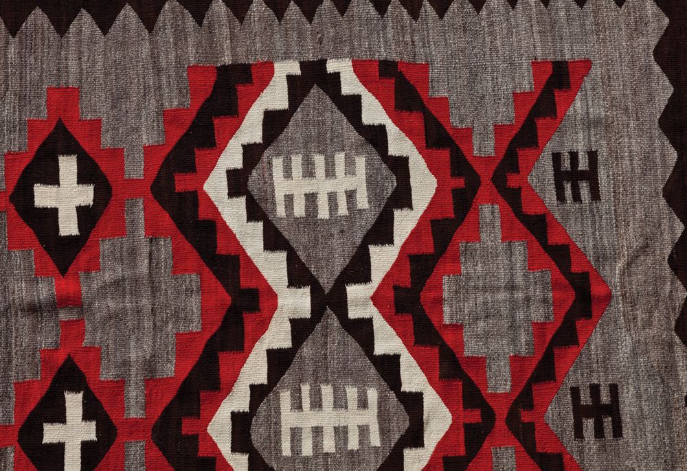 100” x 58” probably Ganado, native hand-spun wool of natural colors and aniline dyed red. Variety of nested, classic design elements on gray background, with sawtooth border. Circa 1930s.