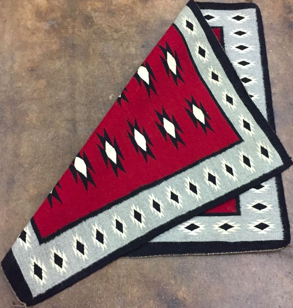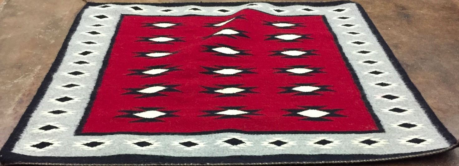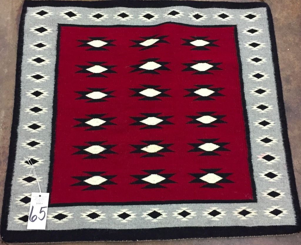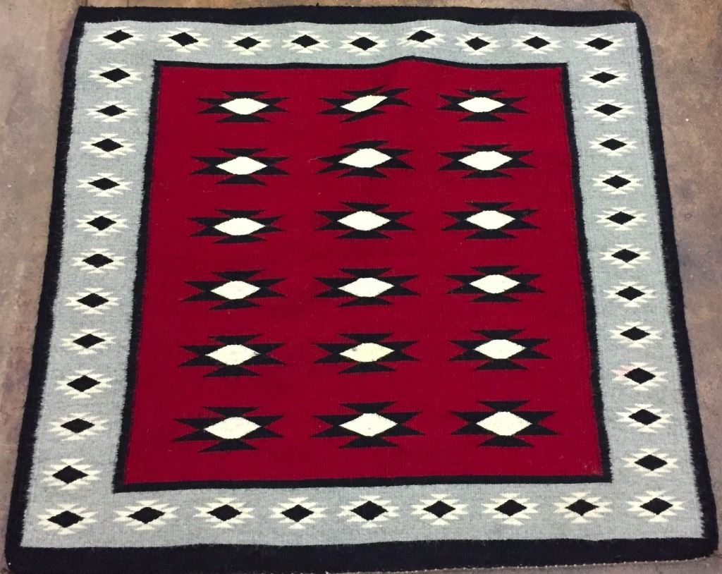 Maker: Unknown Navajo weaver. Approx. Age: Circa 1980s. Size: 33” x 36”. Condition: Good. Additional Info: Nice geometric design Navajo textile. Please look closely at the pictures - they are an important part of our description. Shipping: There will be a $5 handling / packaging fee for shipping this lot. The actual cost of postage will be added on top of that.