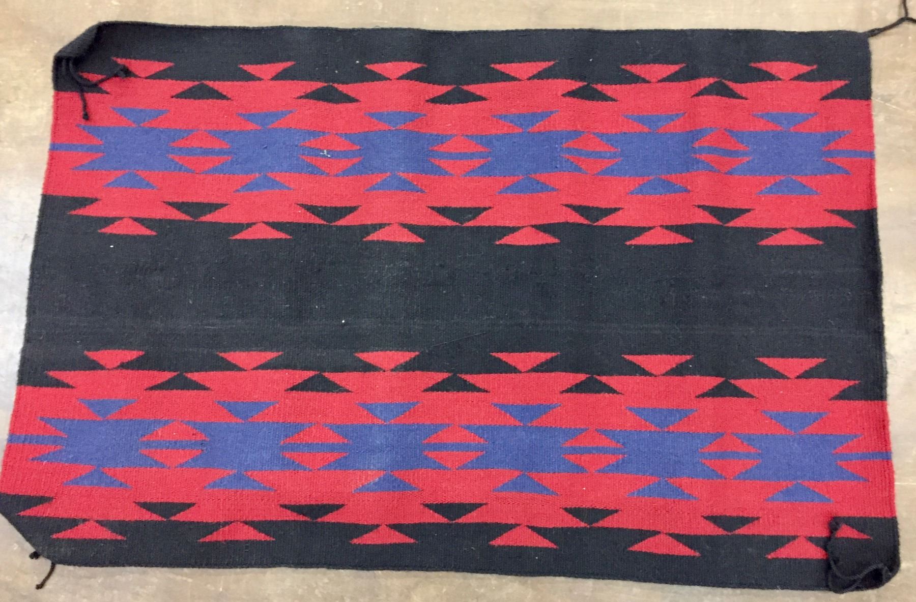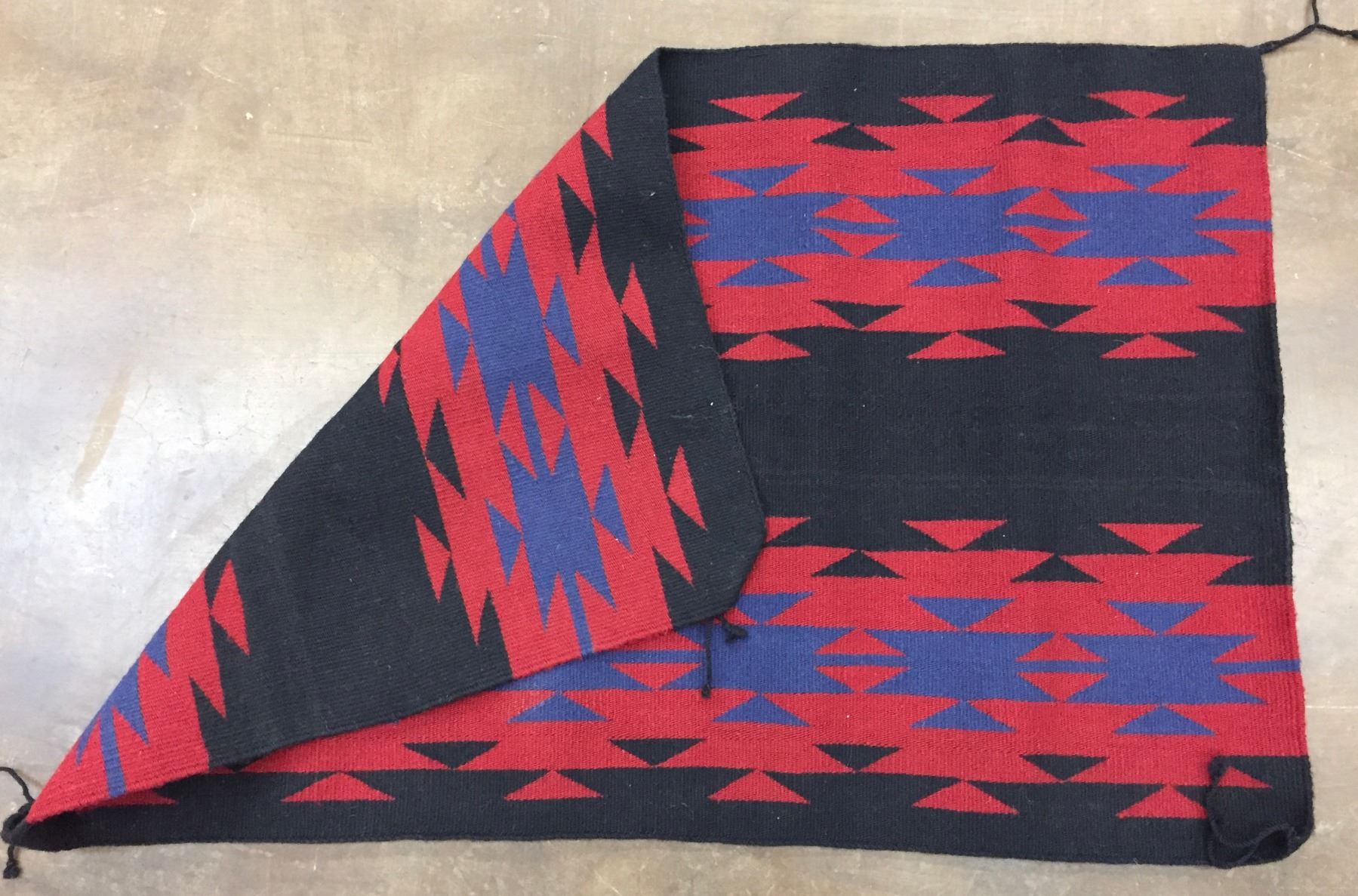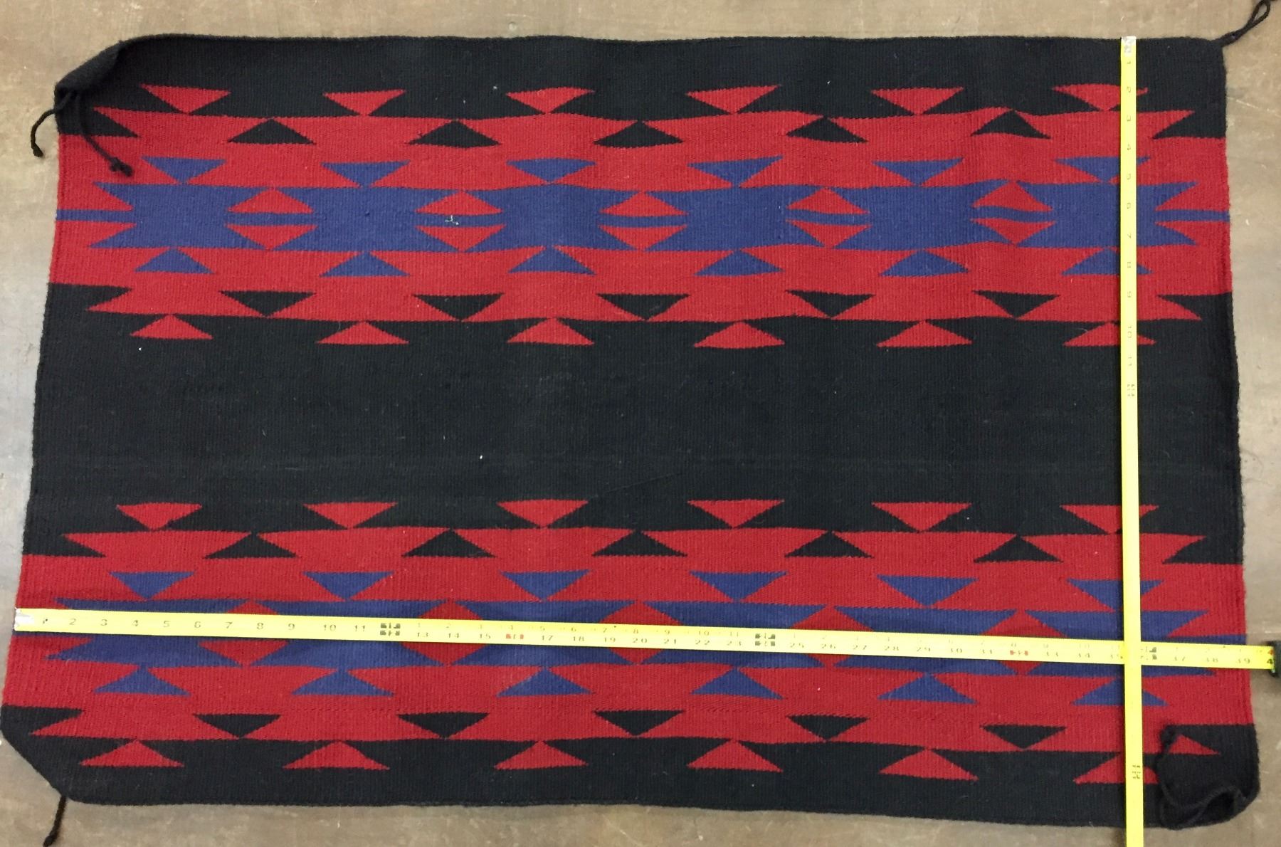 Description: Offered for sale in this is a unique, Navajo textile in blacks, blues, and reds. Tight, fine weave. A nice textile.