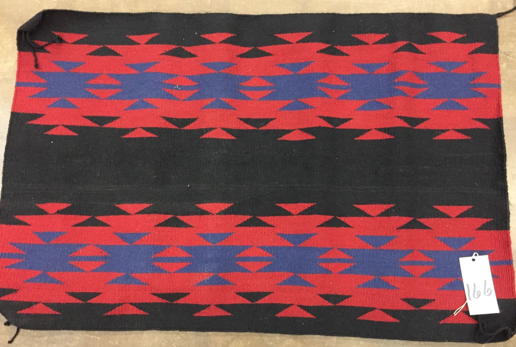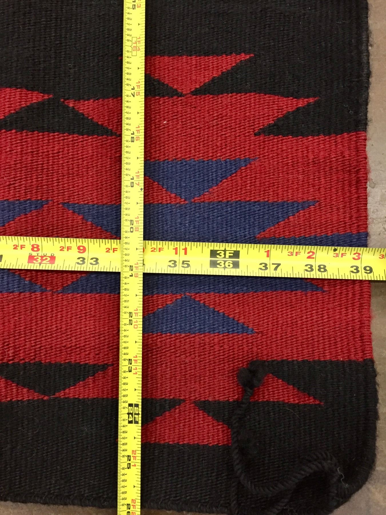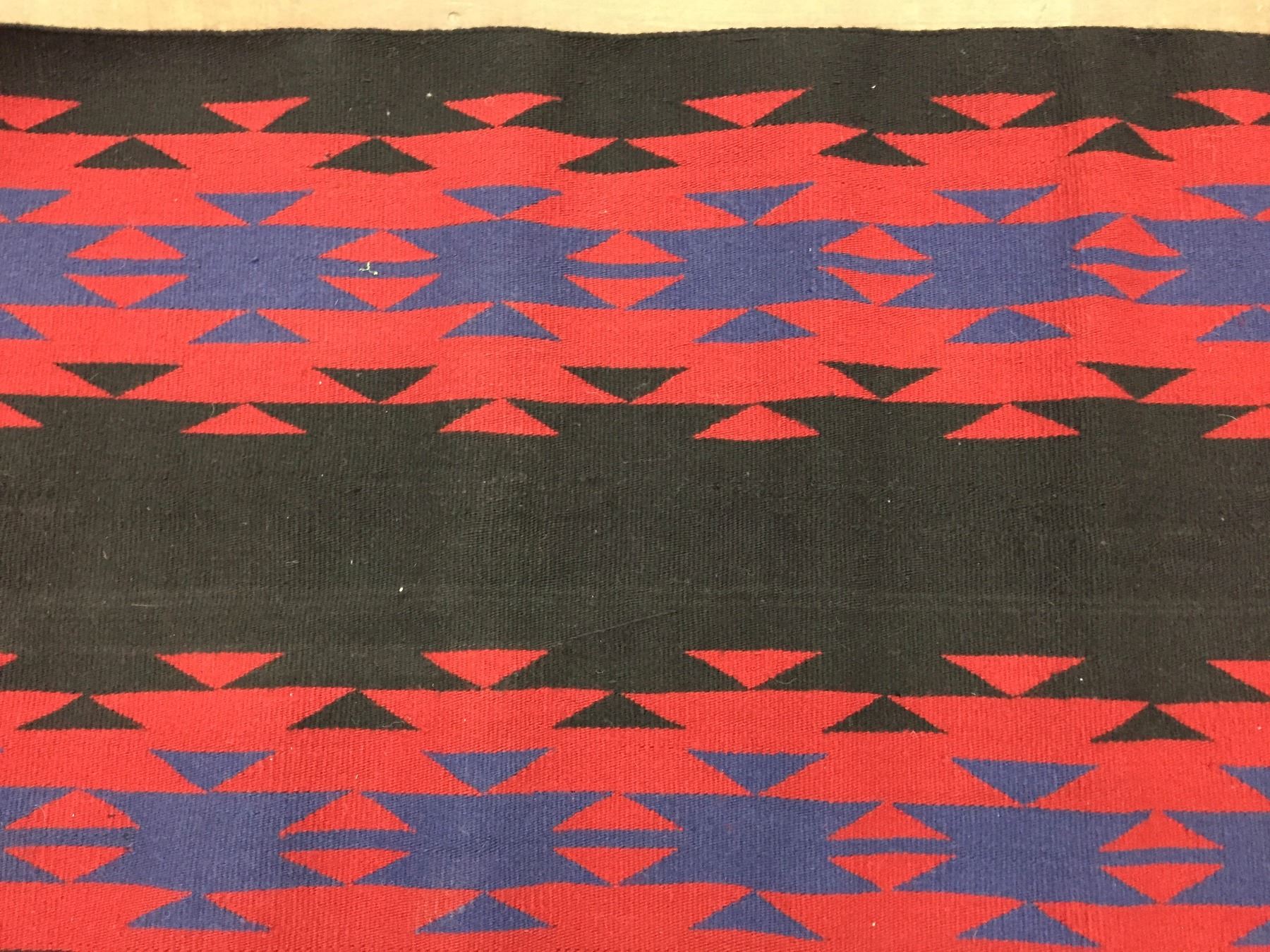 Description: Offered for sale in this is a unique, Navajo textile in blacks, blues, and reds. Tight, fine weave. A nice textile.