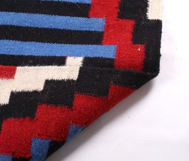 The lot features a Navajo style hand knotted rug in a rare Third Phase Chief’s Blanket Pattern. Wonderful large size collectible floor covering in a fantastic pattern. The piece shows an excellent design and manufacture with mineral dyed colors in red, white, blue, and black. It features diamond pattern shapes and long black fringe on the corners. Early to Mid 20th Century Chief’s Pattern blankets are of the most desired patterns with circa 19th Century examples commanding over 1.5 million at auction. Noted archeologist and Navajo weaving authority Joe Ben Wheat once wrote, “The Chief’s blanket is one of the finest achievements in Navajo weaving.” This rug measures 84" x 55.5" and is in good condition. The wool contents and origin of this rug are unknown. Review pictures for condition, age and origin.