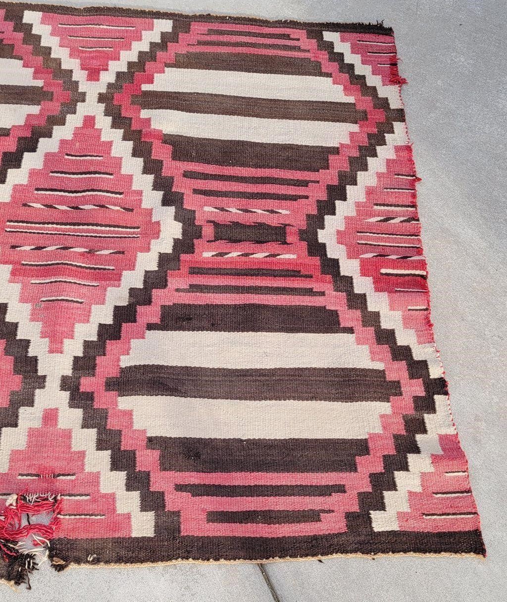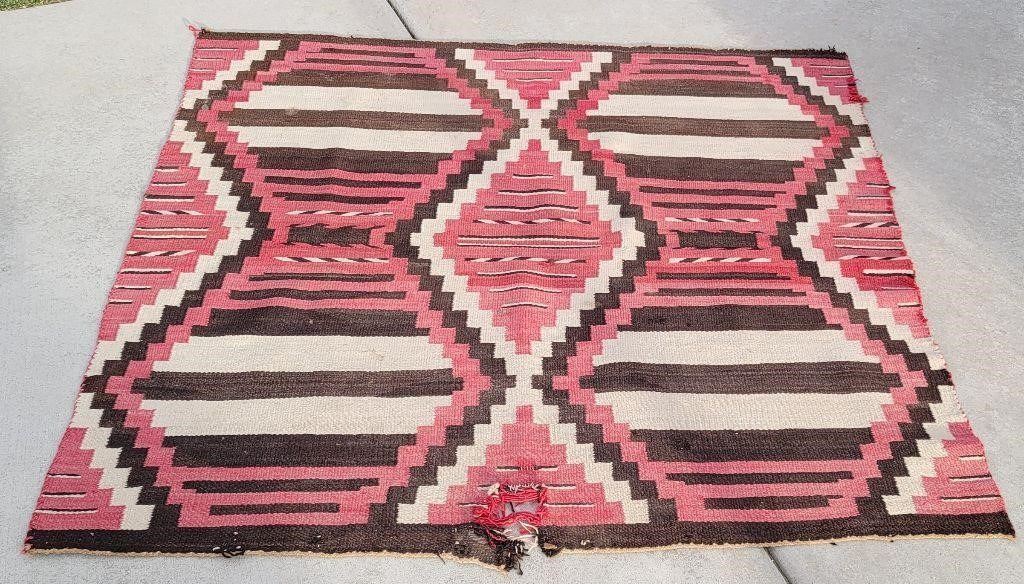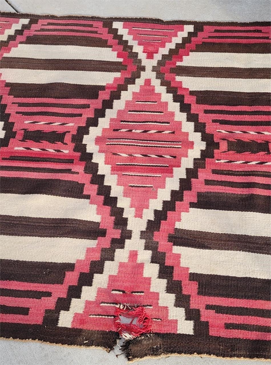 Fresh to the market. Never before seen. We are pleased to offer you the opportunity of purchasing an original condition Third Phase Chiefs Blanket. This blanket has not been retouched/repaired/re-dyed. It is as original as you will ever find. It came from a local estate, and this is the first time it has been offered to the public. It does have honest wear as shown, including a break in the warp in one area. Measures 56" by 58.5".