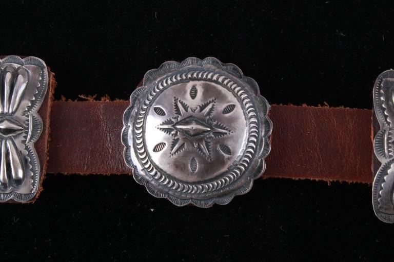For your bidding pleasure in this lot is a sterling silver Thrid Phase pattern concho belt on brown leather by master silversmith Navajo Eugene Charley from western New Mexico. There are 8 round conchos, 9 Butterfly (Bowtie) conchos and the buckle with finely detailed stamped designs and repousse work. The buckle is 2 1/4" by 1 5/8", stamped Sterling and signed by the artist. Each Concho is beautifully hand stamped from top to bottom with a symmetrical design. The stamping features traditional style as well as repousse stamping. The round conchos are 1 5/8" across and the Butterfly/Bowtie conchos are 1 1/2" by 3/4". The Conchos are third phase style and are backed with leather to protect clothing from edge snags and have sliding copper loops on the back to attach to the belt. The leather belt length is 41" total. Eugene Charley examples have regularly brought or been offered as high as $1,800-$2,000 due to the heavy construction done in original Third Phase traditional patterns with high quality.