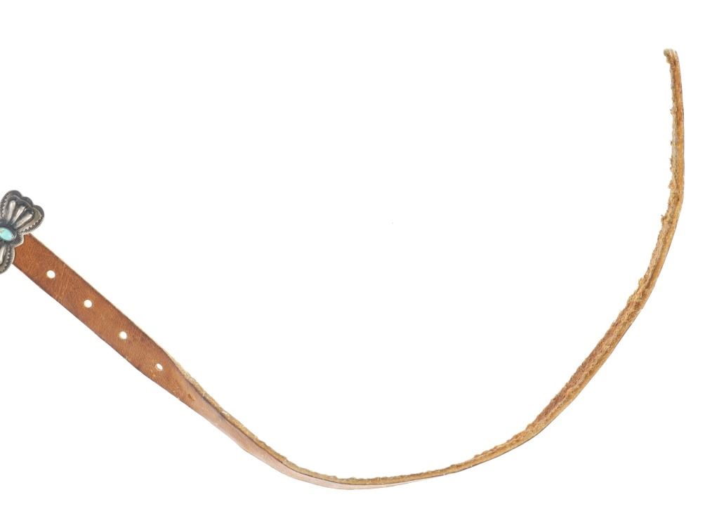 The lot features a beautiful late vintage, concho belt from Navajo silversmith Eugene Charley in a classic Third Phase pattern style. The belt is signed, "Eugene Charley / Sterling". Each concho / concha and buckle are set with natural Turquoise. The buckle has a fine repouse worked and stamped finish and the belt shows seventeen concho / conchas with sterling silver bodies and copper slides including eight standard oval conchos and nine butterfly bow tie conchos. On a nice light leather belt. The belt has a late vintage age to early modern age and is well kept with nice patina. Measures overall 47.5-inches long from front of buckle to end of belt. Buckle is 2 3/8" by 1 5/8. The oval conchos are 1 5/8" by 1 3/8". Butterfly conchos are 1.25" by 3/4". Total weight of 150.7 grams.