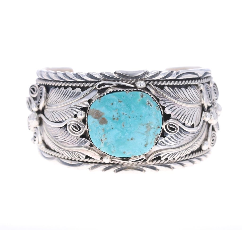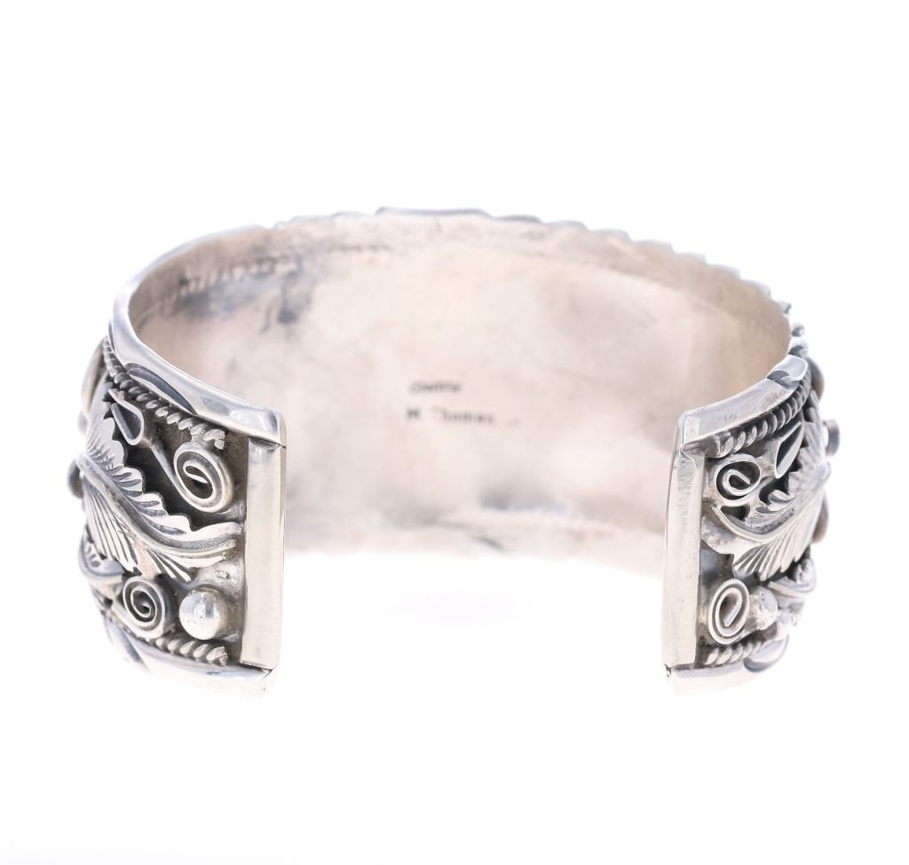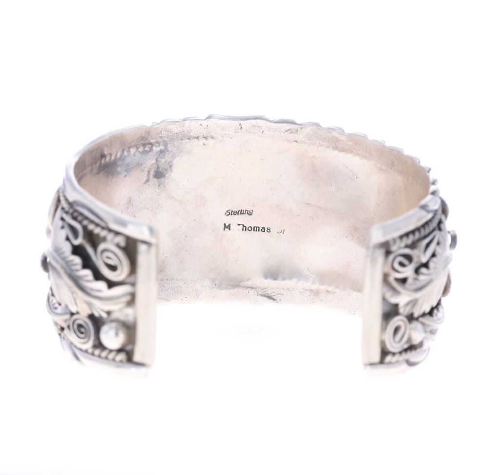 Featured in this lot is a sterling silver turquoise bracelet from Navajo artist, M. Thomas Jr. The bracelet features a wonderfully and professionally crafted sterling silver and turquoise construction that shows an added layer of tooled floral decoration with twisted rope decoration and shows a oval cut cripple creek turquoise cabochon set into the center. The bracelet is marked as follows: Sterling - M. Thomas Jr. The condition of this Navajo bracelet is good with a slight wiggle in the center stone but otherwise in good overall condition. The measurements of this bracelet are 2 3/8" x 3" x 1 5/8" and the circumference is 5 1/2". The collective weight of this bracelet is 79.6g.*