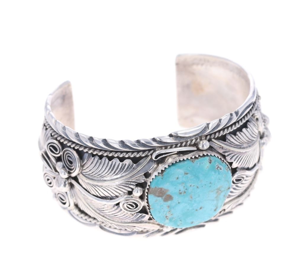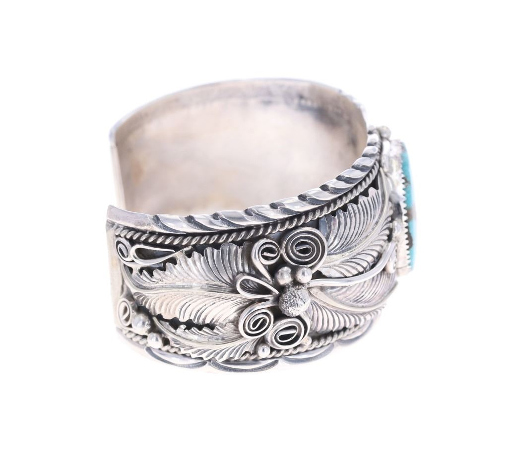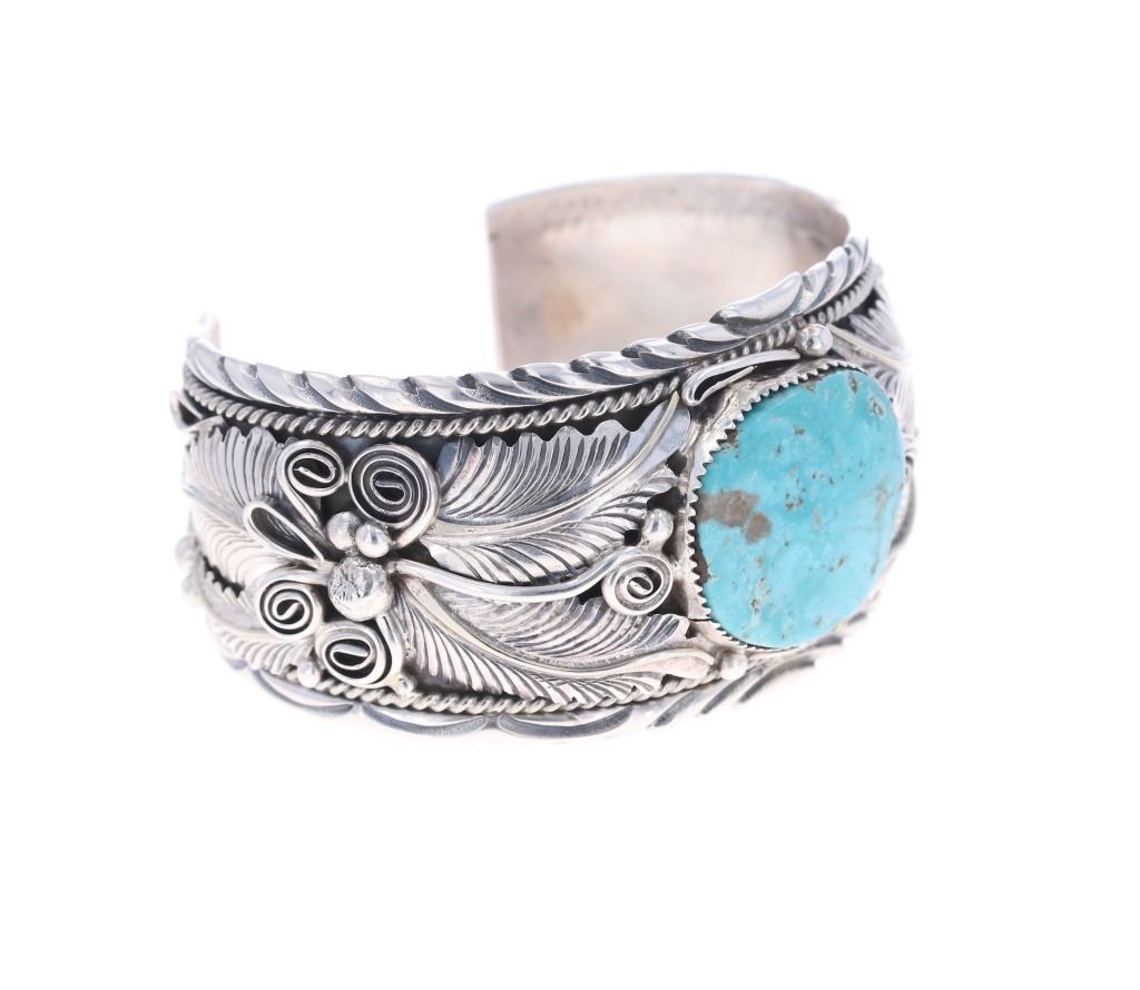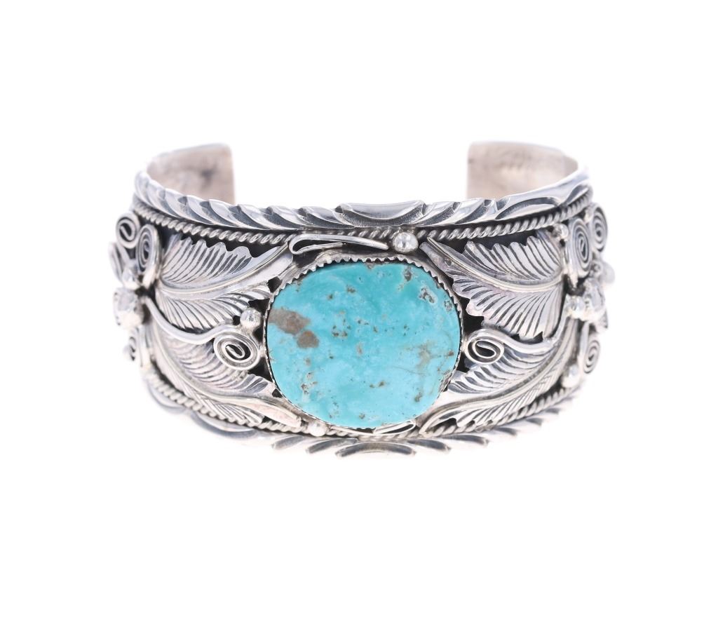 Featured in this lot is a sterling silver turquoise bracelet from Navajo artist, M. Thomas Jr. The bracelet features a wonderfully and professionally crafted sterling silver and turquoise construction that shows an added layer of tooled floral decoration with twisted rope decoration and shows a oval cut cripple creek turquoise cabochon set into the center. The bracelet is marked as follows: Sterling - M. Thomas Jr. The condition of this Navajo bracelet is good with a slight wiggle in the center stone but otherwise in good overall condition. The measurements of this bracelet are 2 3/8" x 3" x 1 5/8" and the circumference is 5 1/2". The collective weight of this bracelet is 79.6g.*