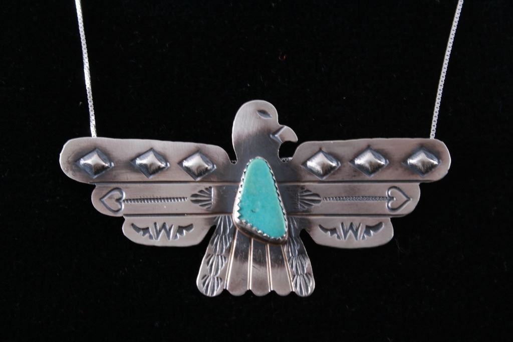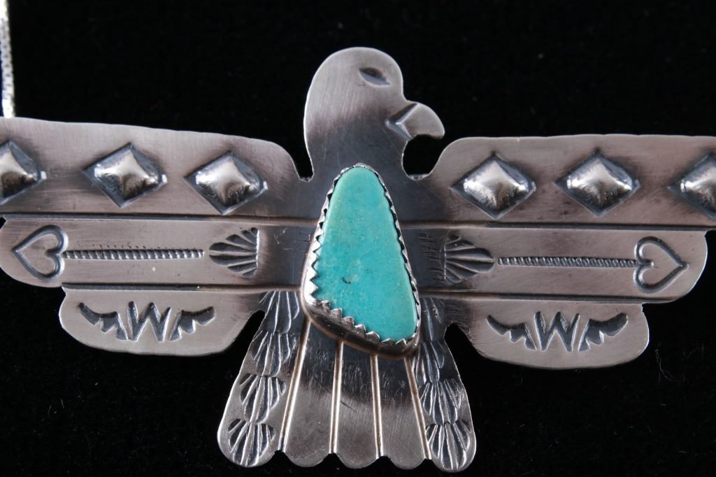 This is an original Navajo Thunderbird necklace in sterling silver set with turquoise from silversmith Tim Yazzie. The necklace is signed / stamped "T. Yazzie Sterling". The necklace has a repousse stamped old pawn styling and is set with a polished cabochon of turquoise from the Kingman Turquoise Mine and is strung on a .925 sterling silver box chain necklace. The necklace measures 24"L and the Thunderbird is 3" by 1.5". Total weight of 13.9 grams.