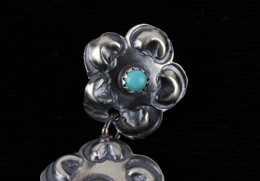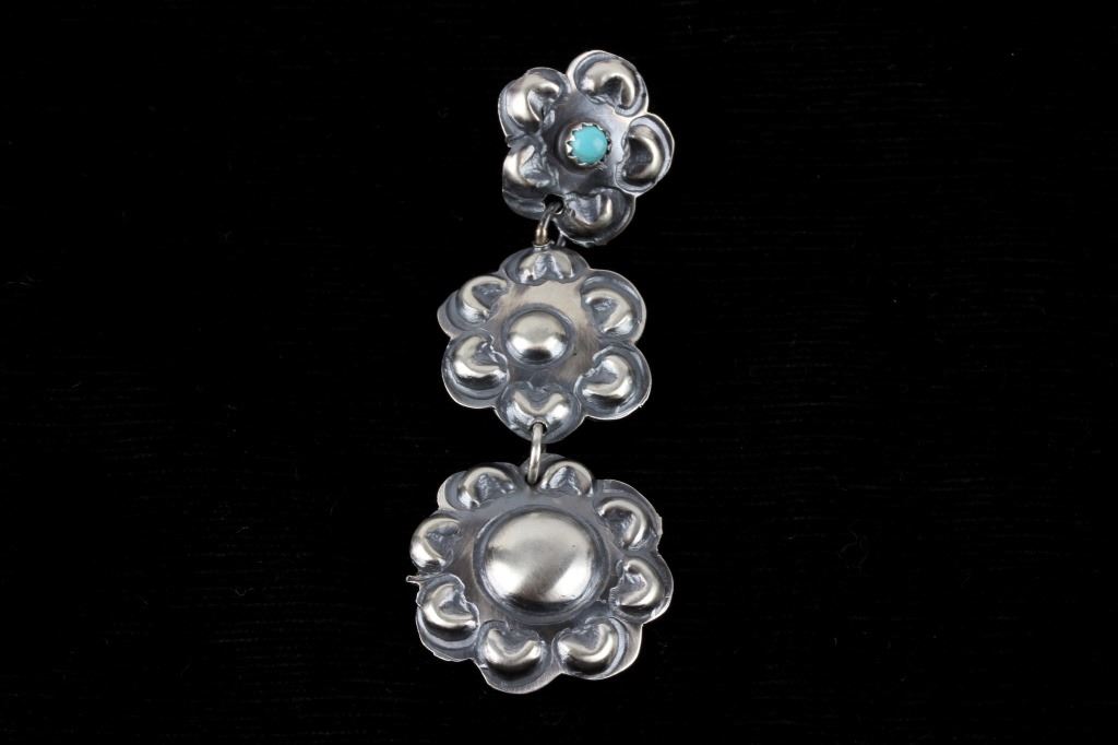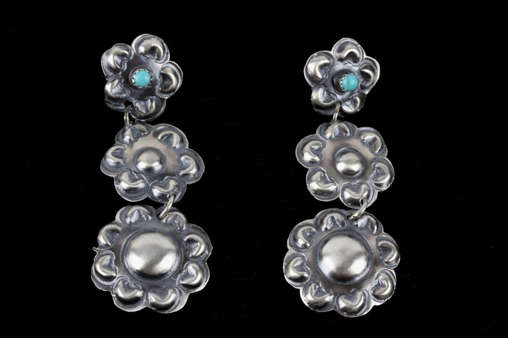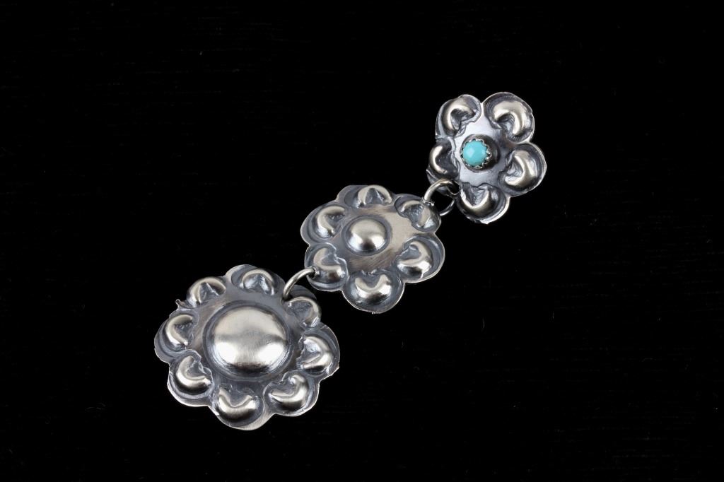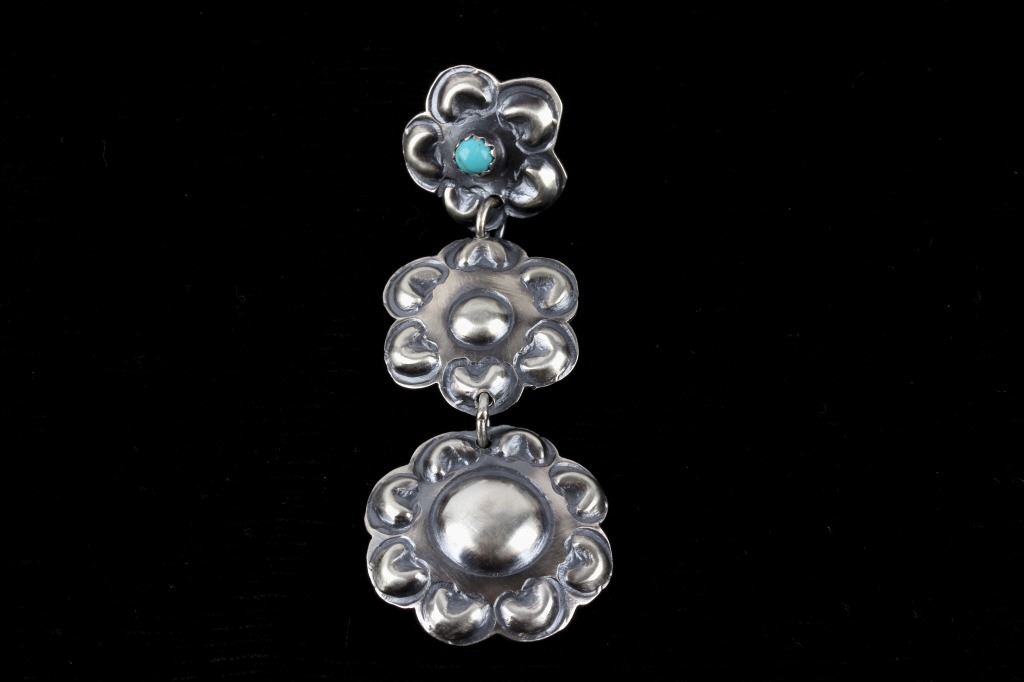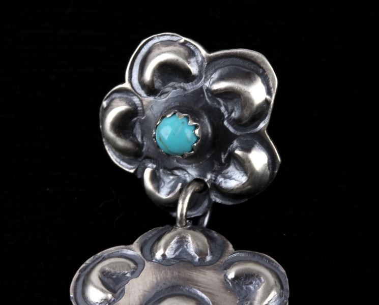 For your consideration is a handmade Tim Yazzie Navajo sterling silver and turquoise earrings. This pair of earrings is handmade by expert silversmith Tim Yazzie. Each ring shows a three graduating stamped flower shaped pieces on the dangle. The smallest flower shows a small turquoise gemstone set in a sterling cabochon, and has the mount on the back. Overall these earrings show a bright patina. The earrings measure 1" x 2 1/2"