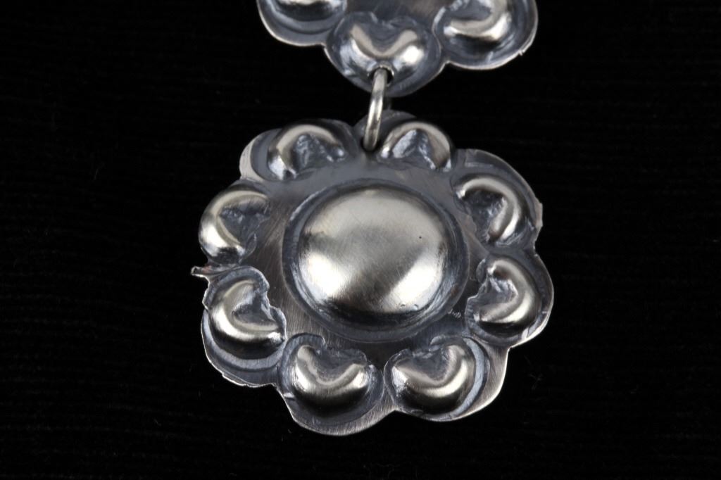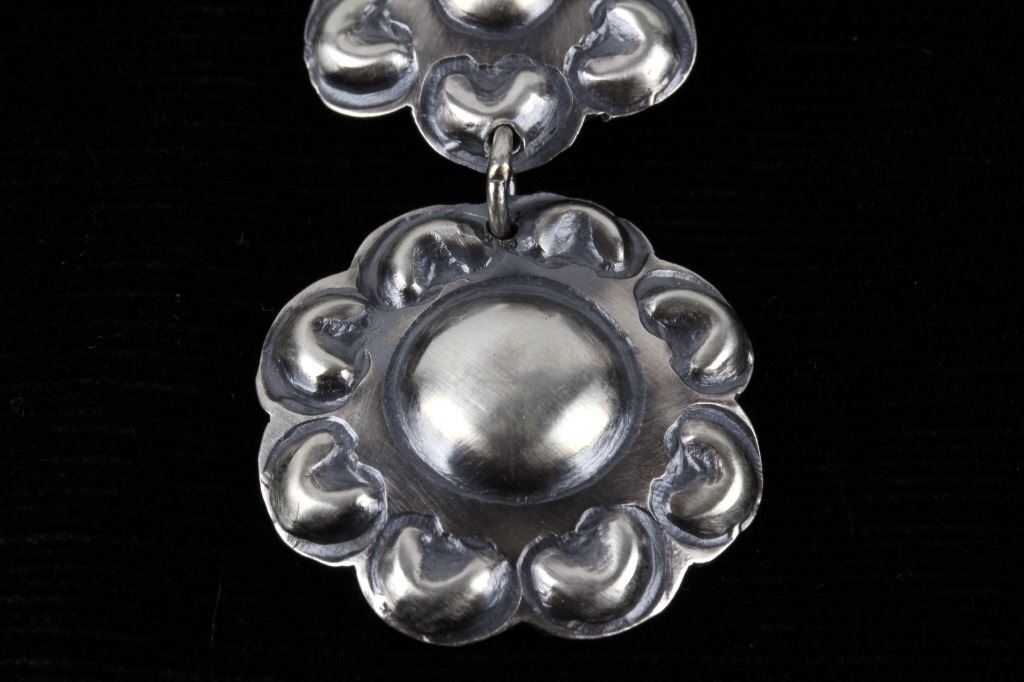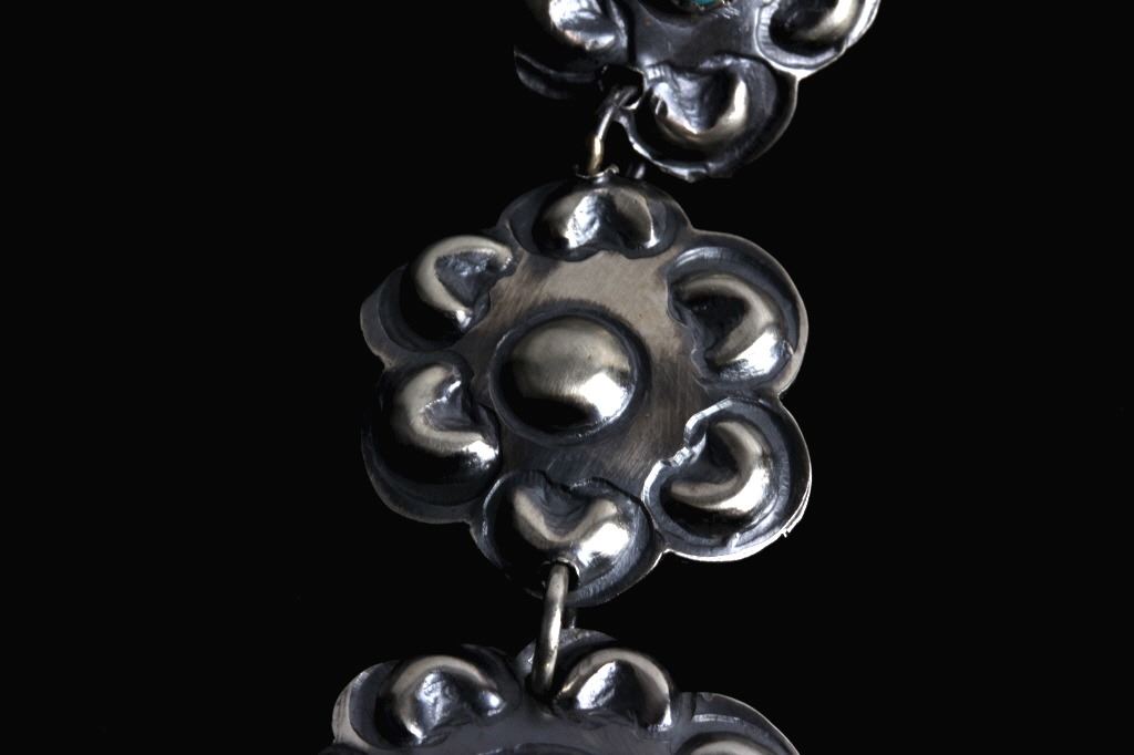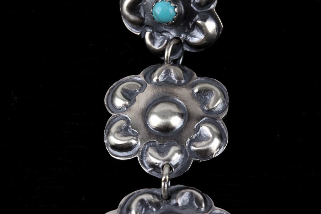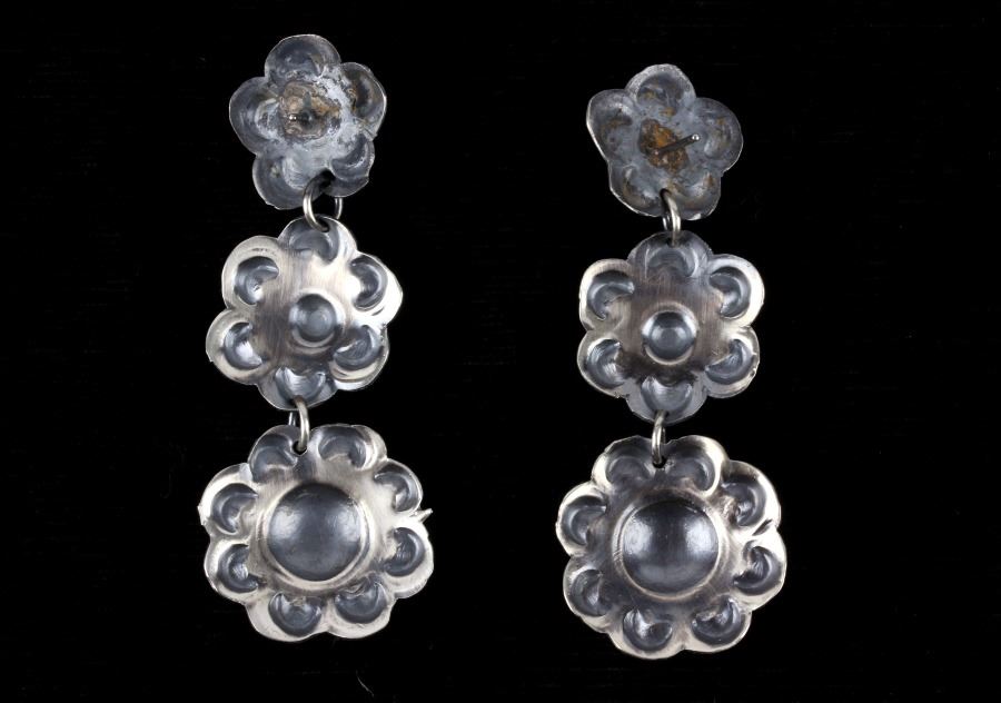 For your consideration is a handmade Tim Yazzie Navajo sterling silver and turquoise earrings. This pair of earrings is handmade by expert silversmith Tim Yazzie. Each ring shows a three graduating stamped flower shaped pieces on the dangle. The smallest flower shows a small turquoise gemstone set in a sterling cabochon, and has the mount on the back. Overall these earrings show a bright patina. The earrings measure 1" x 2 1/2"