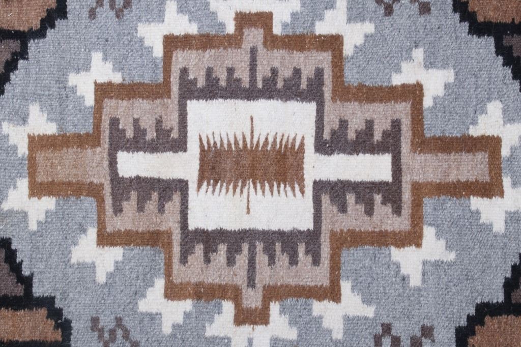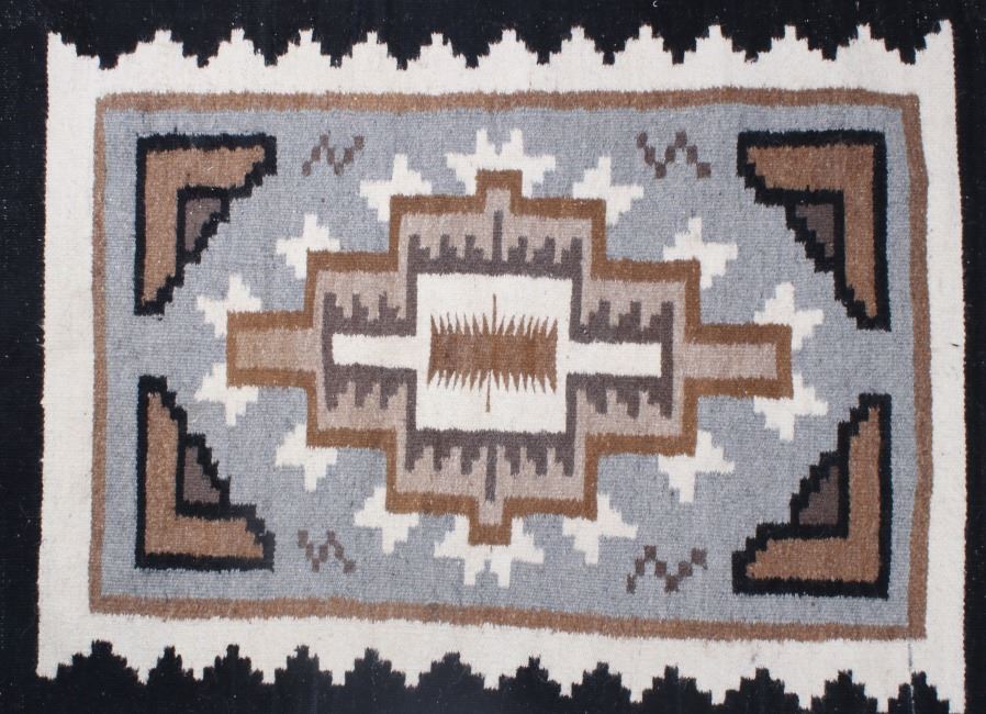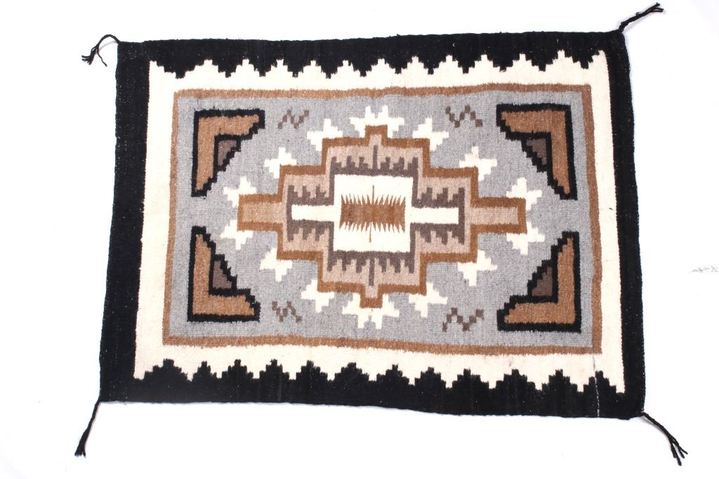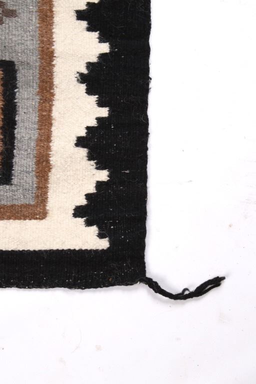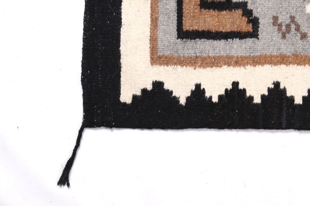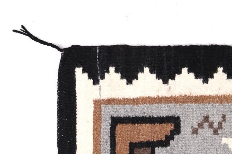 Featured in this lot is this Navajo Toadlena Two Grey Hills Corwn Point Weavers rug circa 1940's from weaver Susie Shorty. The rug features a beautiful example of Toadlena or Two Grey Hills design of the rug with a grey field and a stepped white and black border with all four tassels present. The central medallion shows a beautiful design with brown, light brown and off white coloration. The rug shows a spirit line present on one of the corner of the rug. The Crownpoint Weavers tag reads as follows: No. 2847 - Crownpoint Rug Weavers Assn. - Crownpoint, New Mexico - Weaver Susie Shorty - Address Two Grey Hills. The condition of this rug is good with no obvious signs of damage and in good overall condition. The measurements of this rug are 40 1/2" x 31". This rug features the Crownpoint Weavers identification tag present.