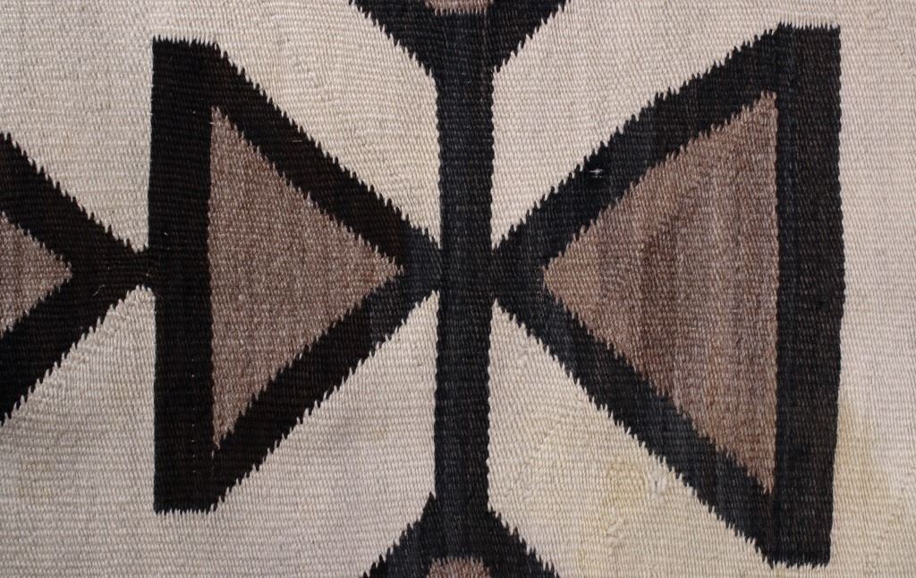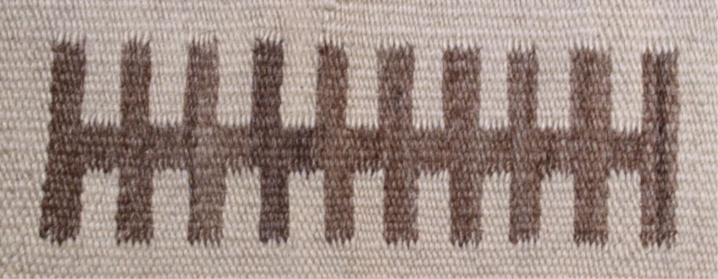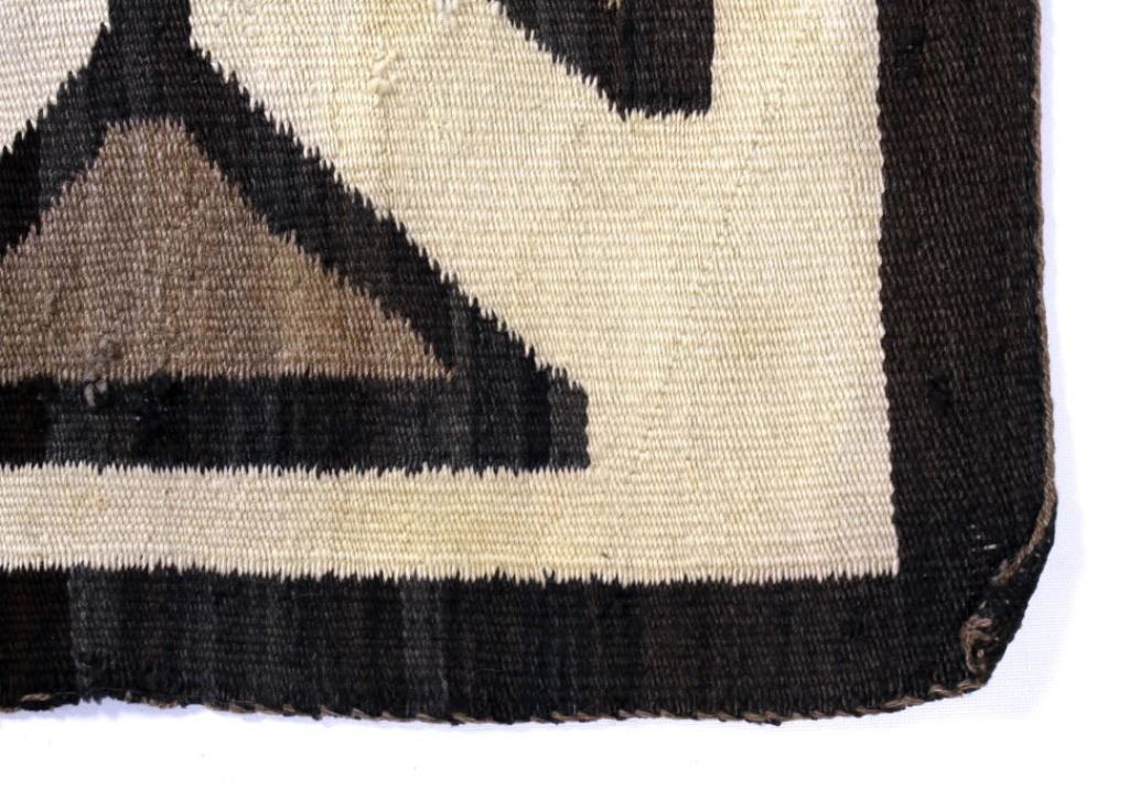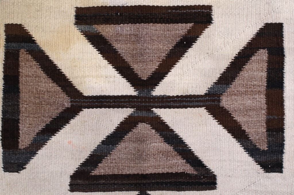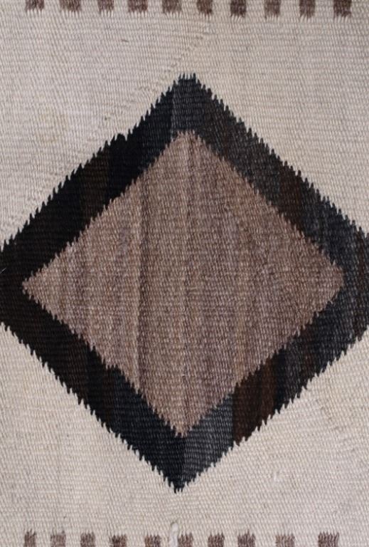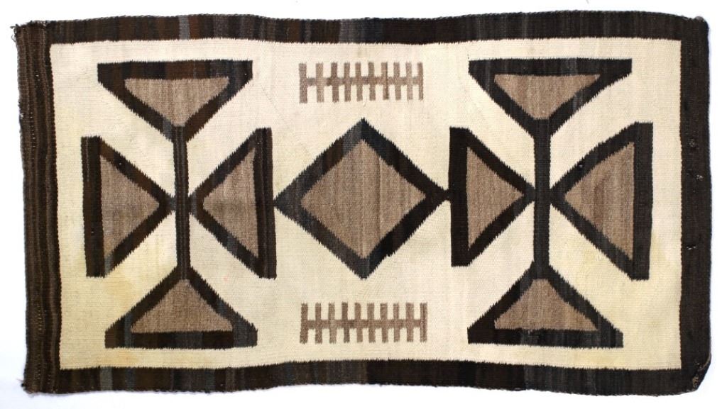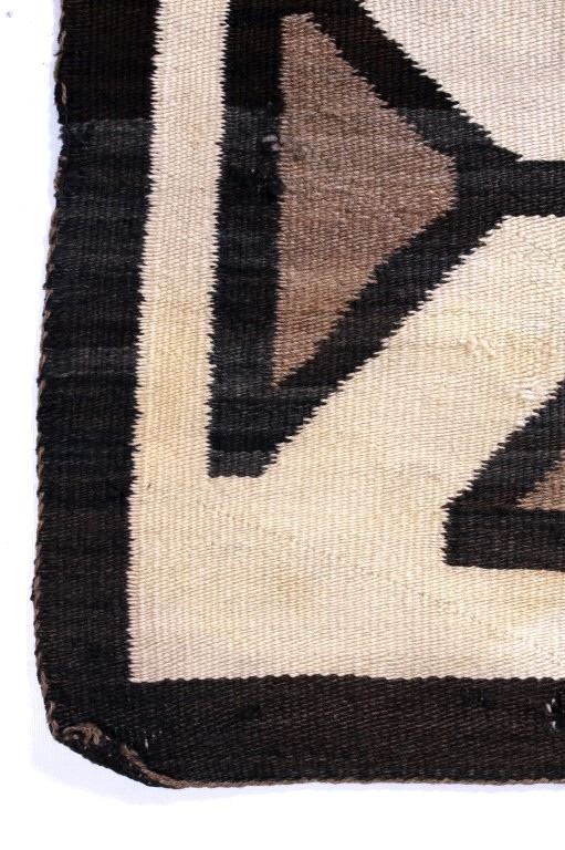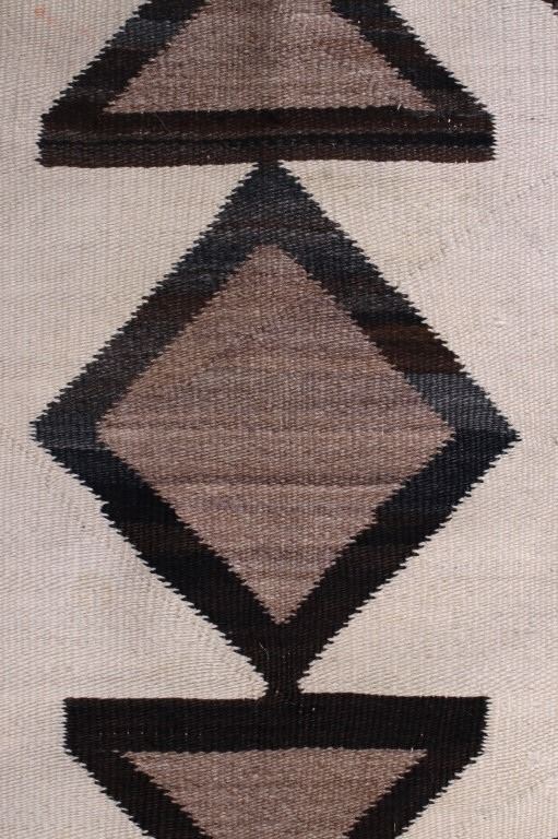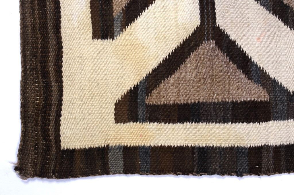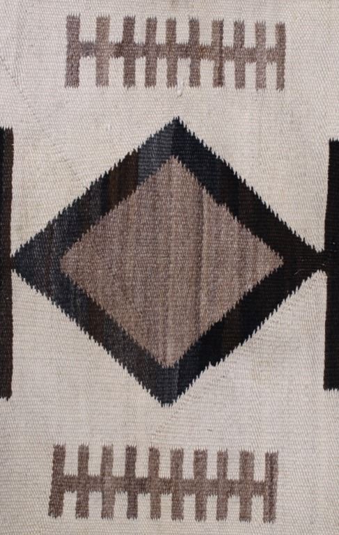 For your consideration is this very nice Navajo Toadlena/ Two Grey Hills hand woven wool rug. The Toadlena/ Two Grey Hills trading post is located in northwest New Mexico, northeast of the Crystal area. It was at this trading post that the style had its genesis and from this trading post, it derives its name. The Style was started there by George Bloomfield and Ed Davis in 1914. Toadlena/ Two Grey Hills rugs are characterized by natural browns, tan, gray, ivory, white, and black. They typically have a central diamond motif surrounded by other intricate patterns. The rug before you features most of the typical colors, including shades of brown, tan, cream [ivory], beige, black and gray. It has a full 2" border (2 1/4" and 2 3/4" at either end) with a somewhat unusual, almost banded, look to it and features black, grays, and browns. On one end the border features mostly browns woven in wavy lines; the border on the opposite is dominated by black and grays. The border colors show up again in the cream colored field outlining the bold block shapes of beige. The rug has a tight weave and is in very good condition. It measures 53" x 29 1/2".