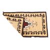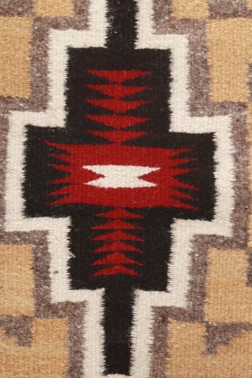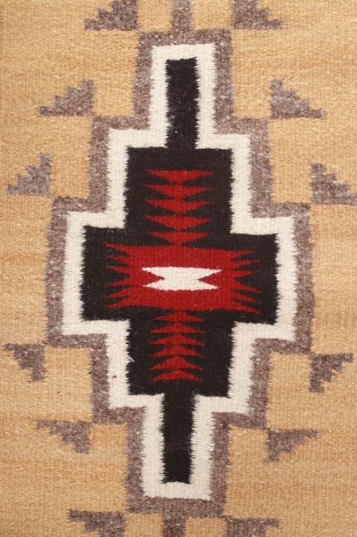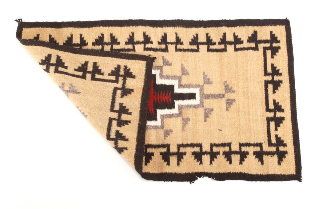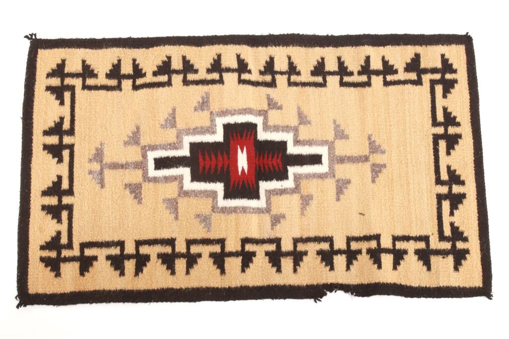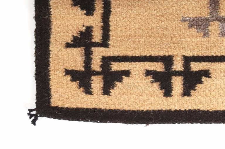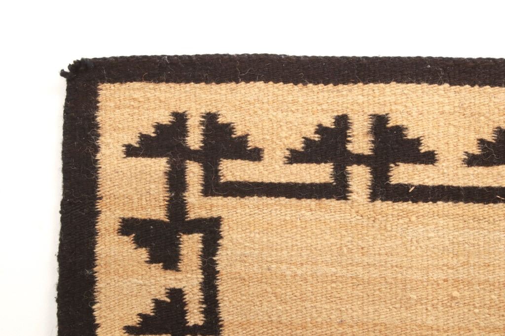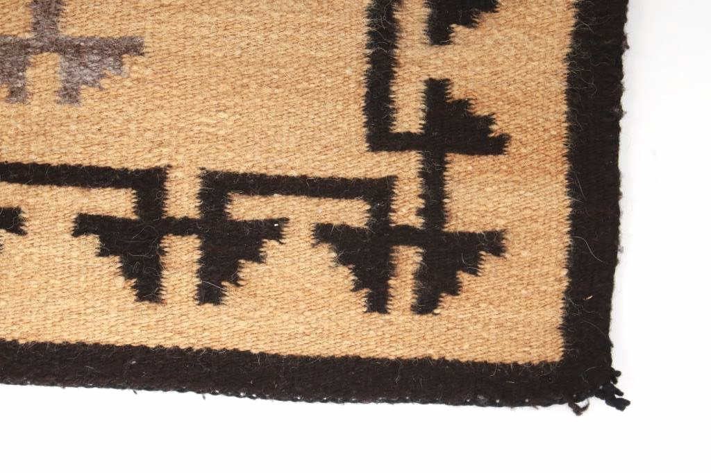 Featured in this lot is this Navajo Toadlena two grey hills wool rug circa 1940's. The rug features a beautiful opaque yellow field with black stepped design along the sides of the rug and shows a large medallion in its center with coloration of grey, off white, black and a central dazzler decoration with red coloration and a stepped off white center. The Toadlena/ Two Grey Hills trading post is located in northwest New Mexico, northeast of the Crystal area. It was at this trading post that the style had its genesis and from this trading post, it derives its name. The Style was started there by George Bloomfield and Ed Davis in 1914. Toadlena/ Two Grey Hills rugs are characterized by natural browns, tan, gray, ivory, white, and black. They typically have a central diamond motif surrounded by other intricate patterns. The condition of this rug is good with some wear to the corner tassels and wear to the outside edge of one of the sides of the rug, but otherwise in good overall condition. The measurements of this rug are 41 1/2" x 24 1/2".