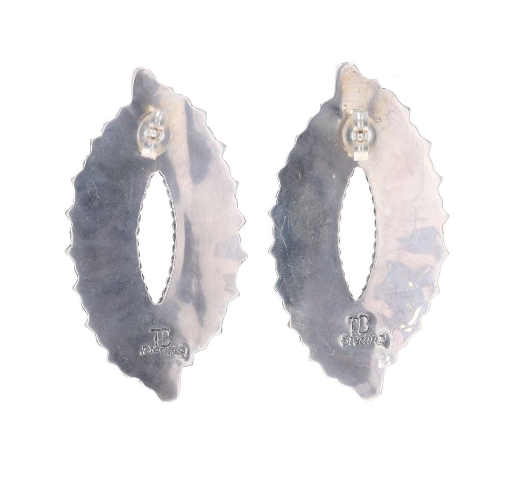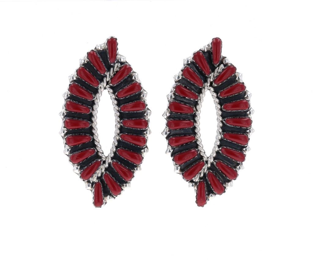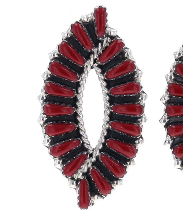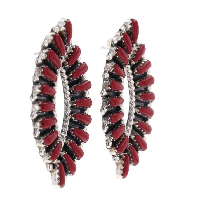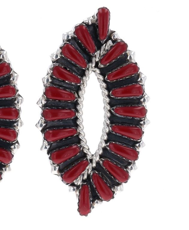 The lot features a set of sterling silver post back earrings set in a classic hummingbird pattern with branch coral from Navajo artist Tom Billy. Each is signed / marked TB STERLING and is set with ox blood branch coral on sterling silver with post backs in like new condition. Each earring measures approx. 1.75" by 7/8". Total weight of 10 grams.