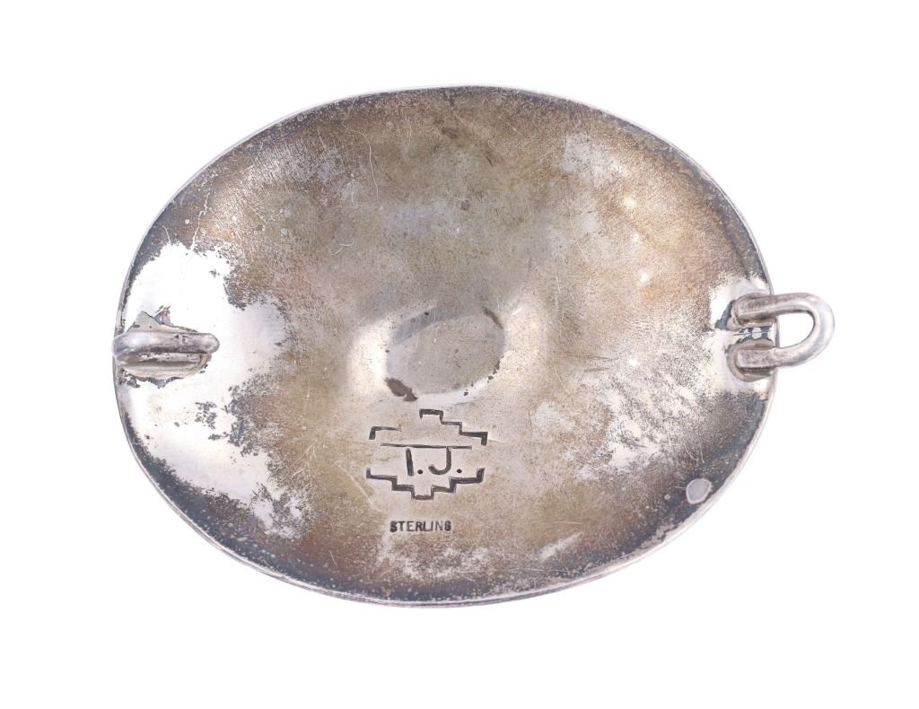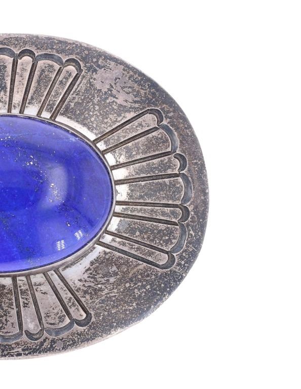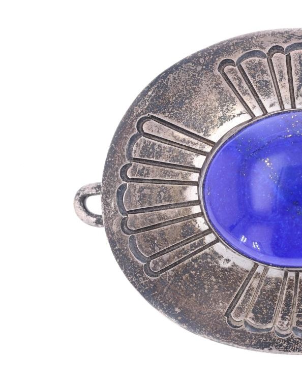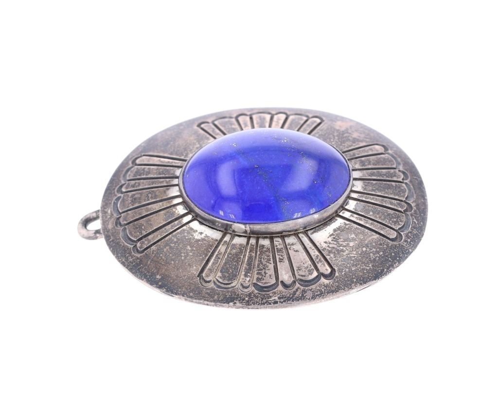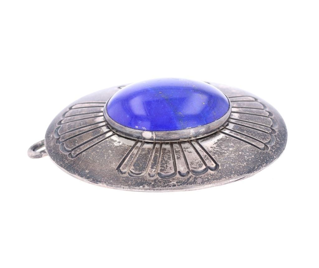 Featured in this lot is this sterling silver and Lapis Lazuli buckle from Navajo artist Tommy Jackson born in 1958. The buckle features a wonderfully and professionally crafted sterling silver and Lapis Lazuli construction that shows a beautiful tradition design with tolled geometric patterns into the face of the buckle and shows a very large oval cut Lapis Lazuli cabochon with deep blue coloration and some mineral deposits. The buckle is marked on the back of the buckle as follows: T.J. (inside a Pueblo geometric pattern) - Sterling. Tommy Jackson is a renowned Navajo jewelry maker, highly respected for his craftsmanship and distinctive designs. He is celebrated for blending traditional Navajo jewelry-making techniques with modern elements, resulting in unique and highly sought-after pieces. The condition of this Navajo buckle is good with some patina to the silver but otherwise shoes a good overall condition. The measurements of this buckle is 2 1/2" x 3 3/8" x 1". The collective weight of this buckle is 101.8g.