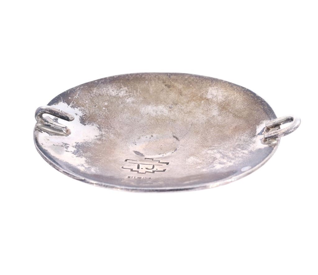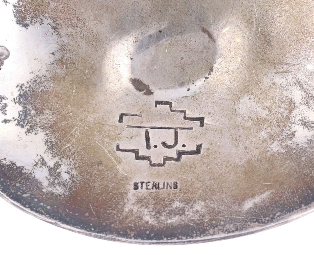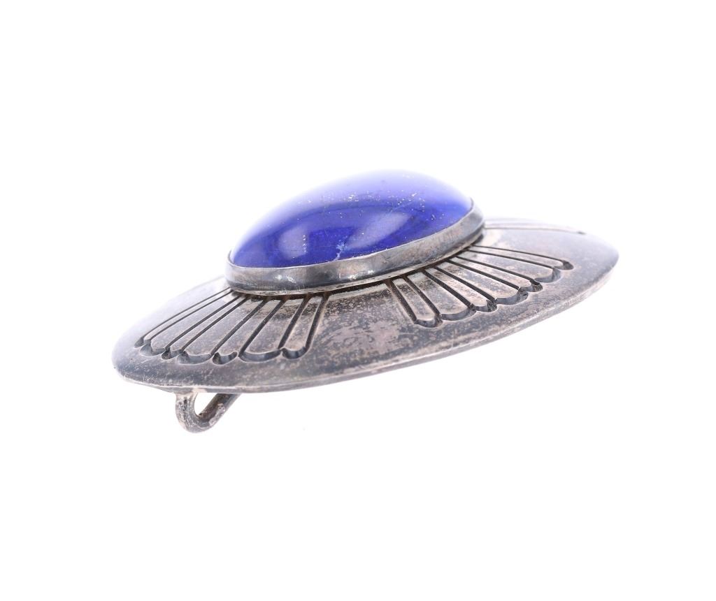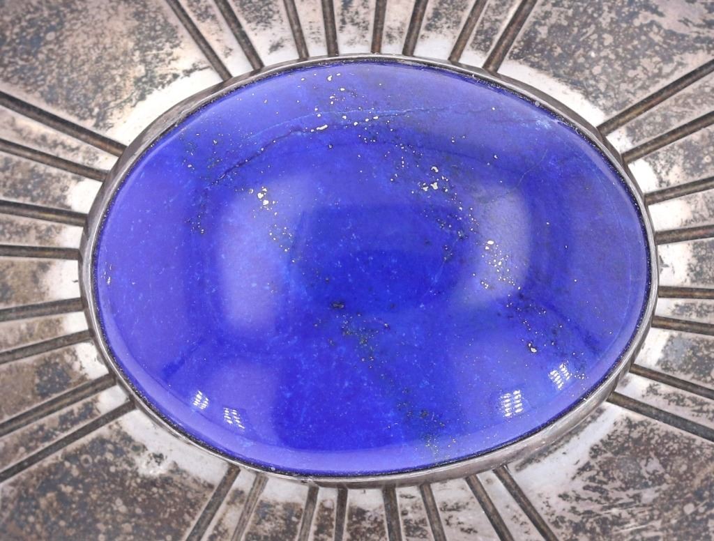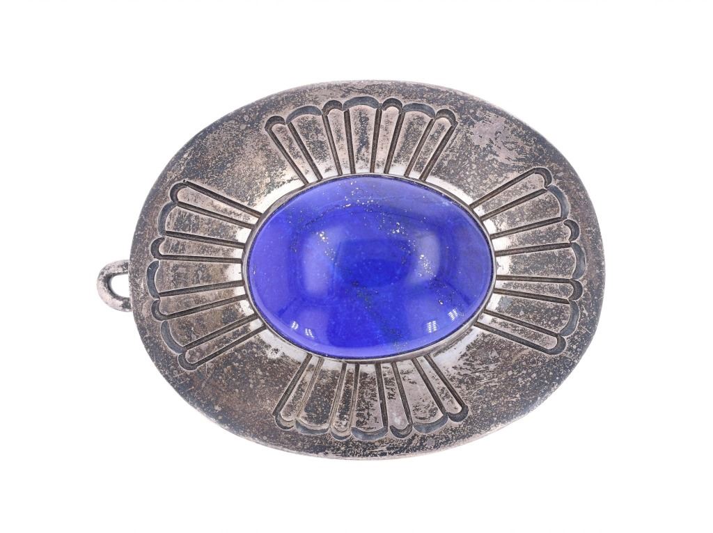 Featured in this lot is this sterling silver and Lapis Lazuli buckle from Navajo artist Tommy Jackson born in 1958. The buckle features a wonderfully and professionally crafted sterling silver and Lapis Lazuli construction that shows a beautiful tradition design with tolled geometric patterns into the face of the buckle and shows a very large oval cut Lapis Lazuli cabochon with deep blue coloration and some mineral deposits. The buckle is marked on the back of the buckle as follows: T.J. (inside a Pueblo geometric pattern) - Sterling. Tommy Jackson is a renowned Navajo jewelry maker, highly respected for his craftsmanship and distinctive designs. He is celebrated for blending traditional Navajo jewelry-making techniques with modern elements, resulting in unique and highly sought-after pieces. The condition of this Navajo buckle is good with some patina to the silver but otherwise shoes a good overall condition. The measurements of this buckle is 2 1/2" x 3 3/8" x 1". The collective weight of this buckle is 101.8g.