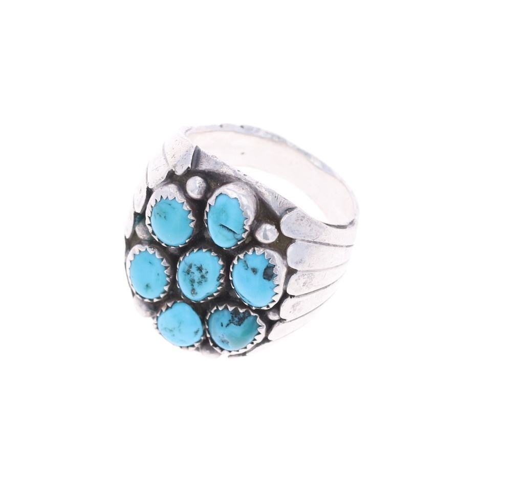 Featured in this lot is this silver Kingman Turquoise ring attributed to Navajo artist Tommy Moore and is unsigned. The ring is wonderfully and professionally crafted sterling silver and Kingman turquoise construction. The shoulders of the ring shows scalloped decoration and features seven total Kingman Turquoise and shows silver studs in between the turquoise. The condition of this Navajo ring is good with some slight patina to the silver but otherwise shows good overall condition. The measurements of this ring is 1" x 1" x 1" and the ring size is US 10. The collective weight of this ring is 19.6g.