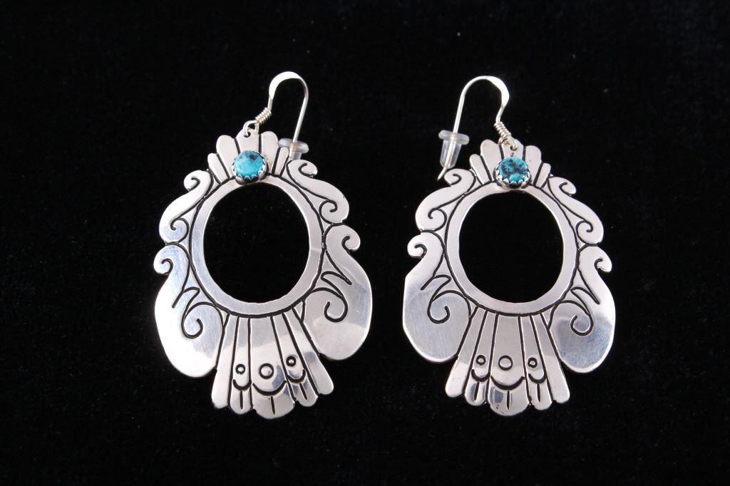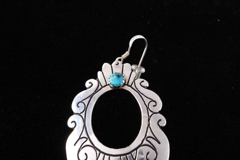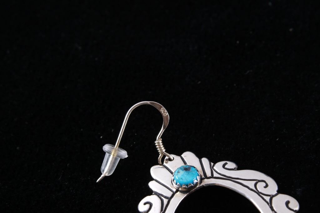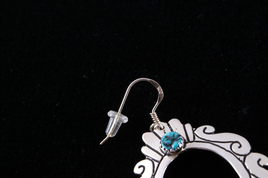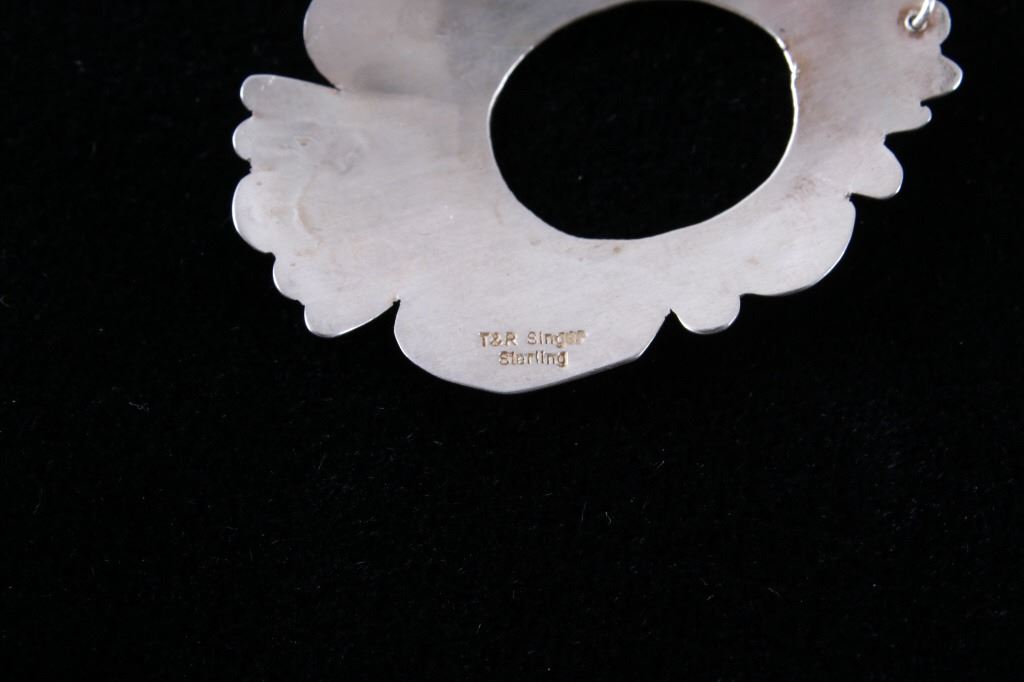 The lot features a set of sterling silver classic Tommy and Rose Singer Navajo earrings set with turquoise. Each is signed / stamped "T&R SINGER STERLING". Tommy Singer is thought to be one of the most important and greatest contemporary silversmith Indian artists and his work is highly sought after. Tommy Singer was a Navajo silversmith who passed away on May 31, 2014. After his death, his wife, Rose, continued to create jewelry using designs Singer created prior to his passing. Total length is 2 7/8"L by 1 3/8"W. Total weight of 11.6 grams.
