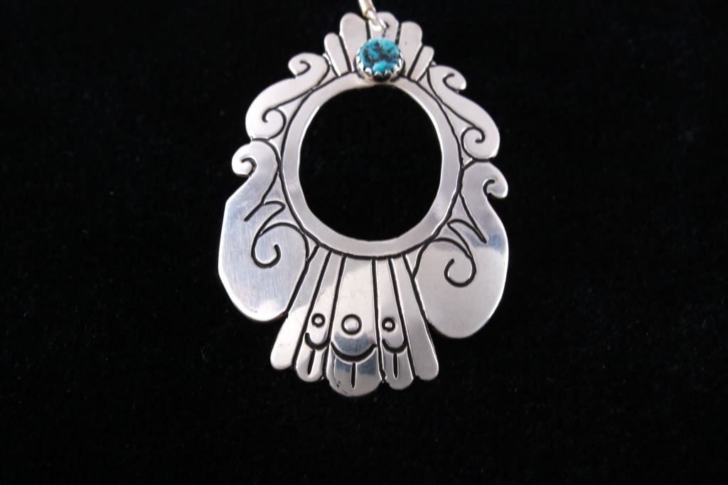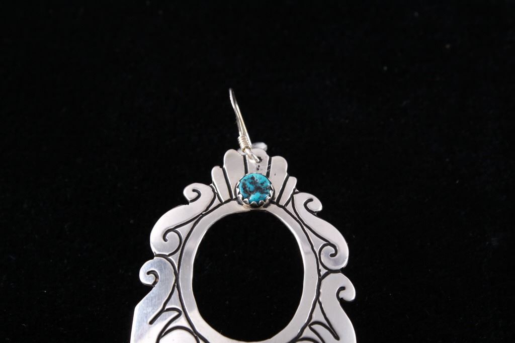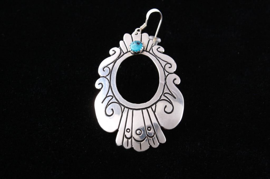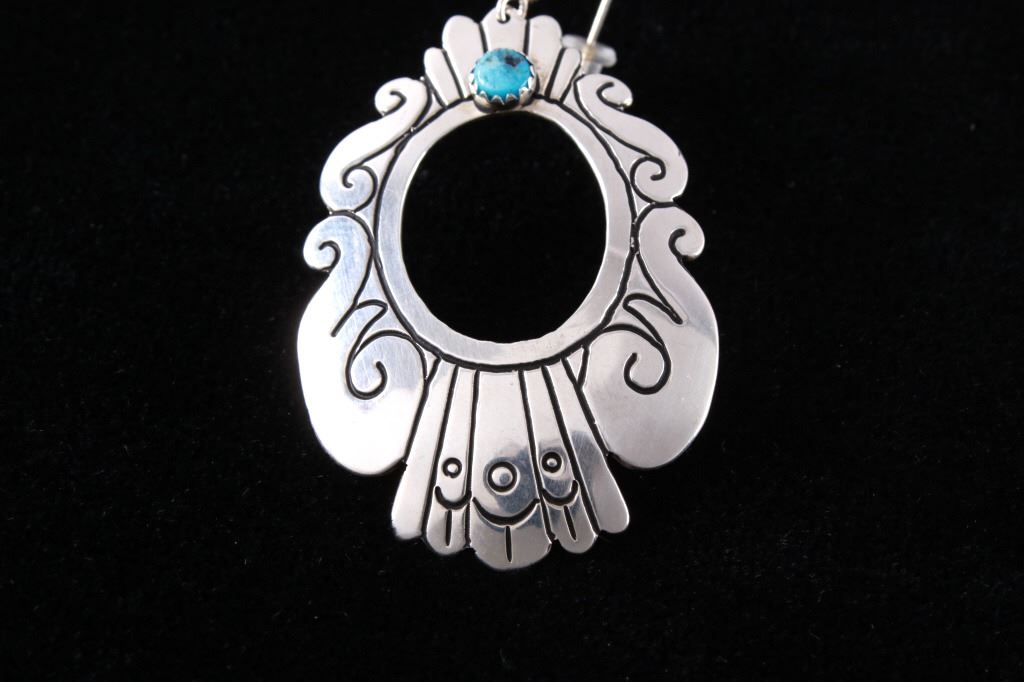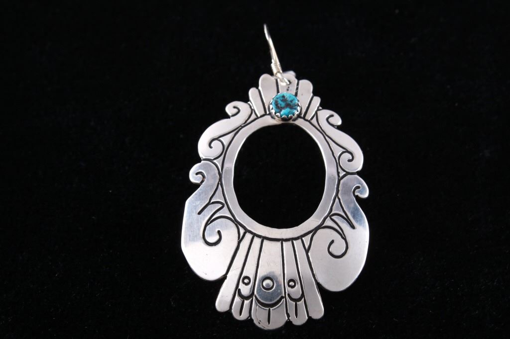 The lot features a set of sterling silver classic Tommy and Rose Singer Navajo earrings set with turquoise. Each is signed / stamped "T&R SINGER STERLING". Tommy Singer is thought to be one of the most important and greatest contemporary silversmith Indian artists and his work is highly sought after. Tommy Singer was a Navajo silversmith who passed away on May 31, 2014. After his death, his wife, Rose, continued to create jewelry using designs Singer created prior to his passing. Total length is 2 7/8"L by 1 3/8"W. Total weight of 11.6 grams.