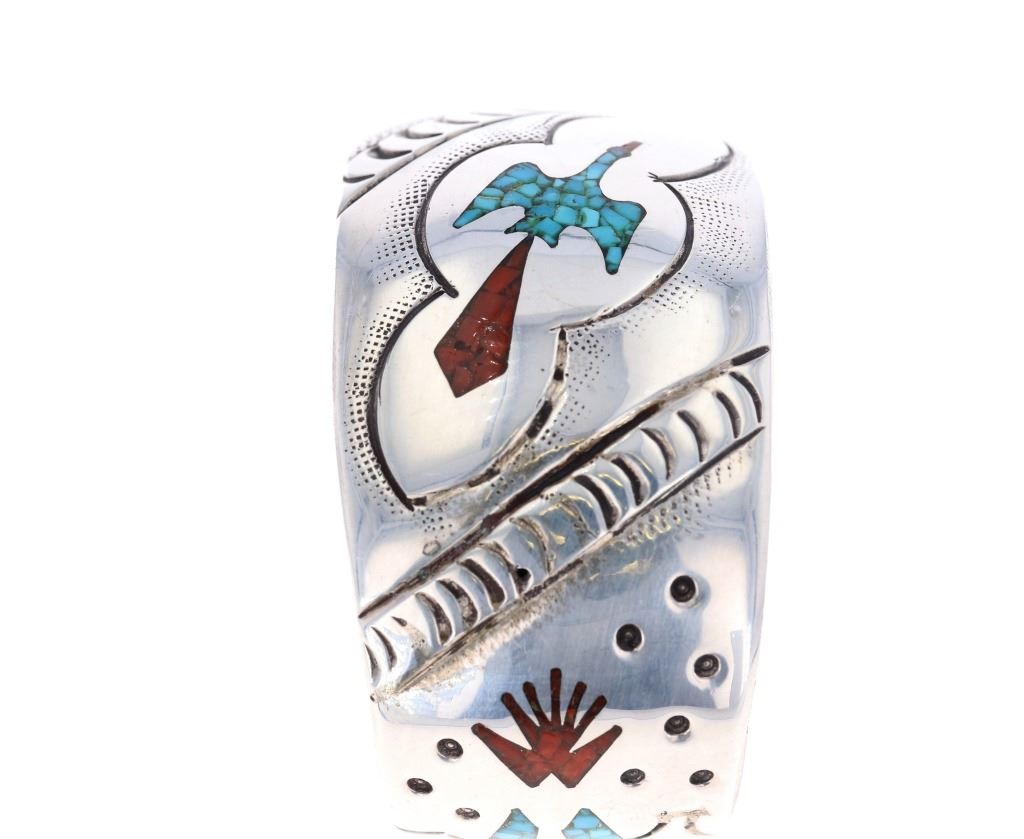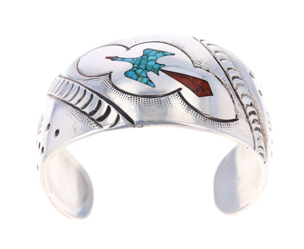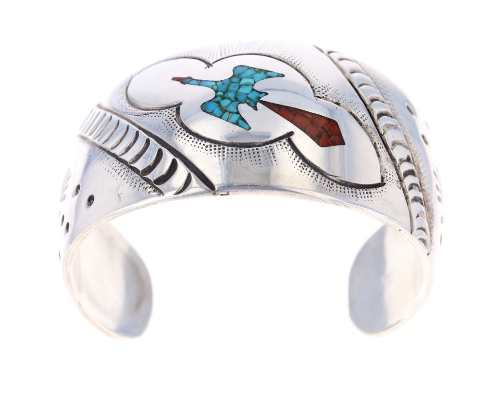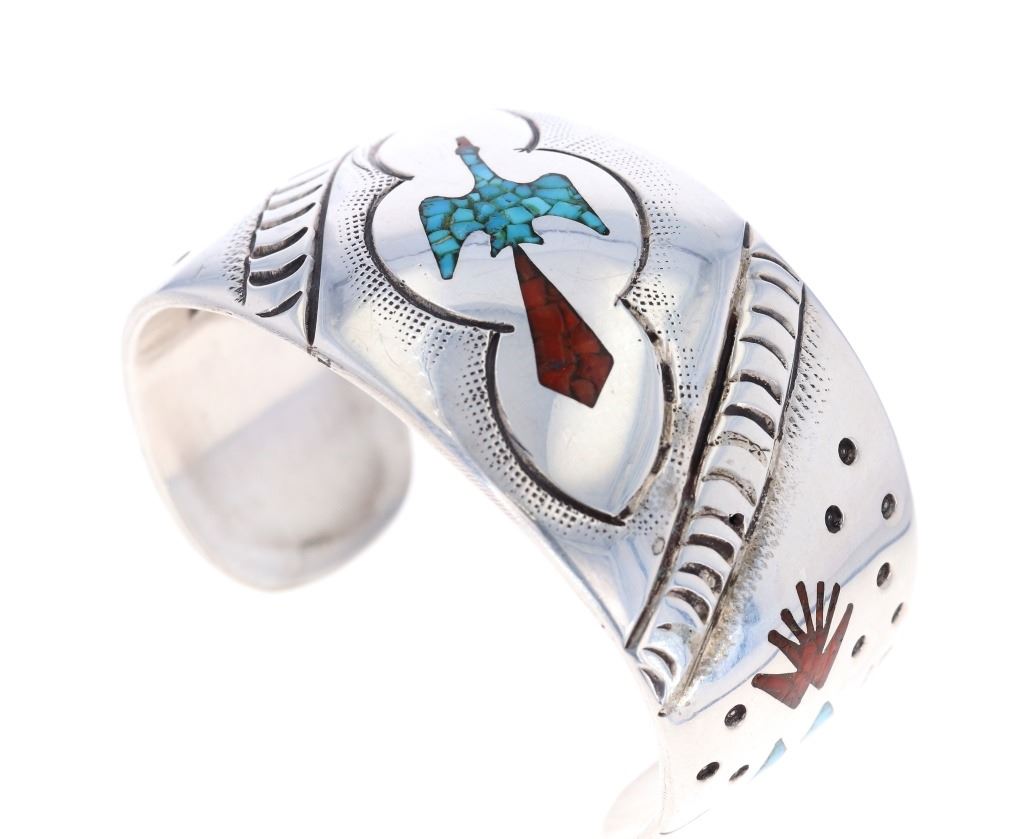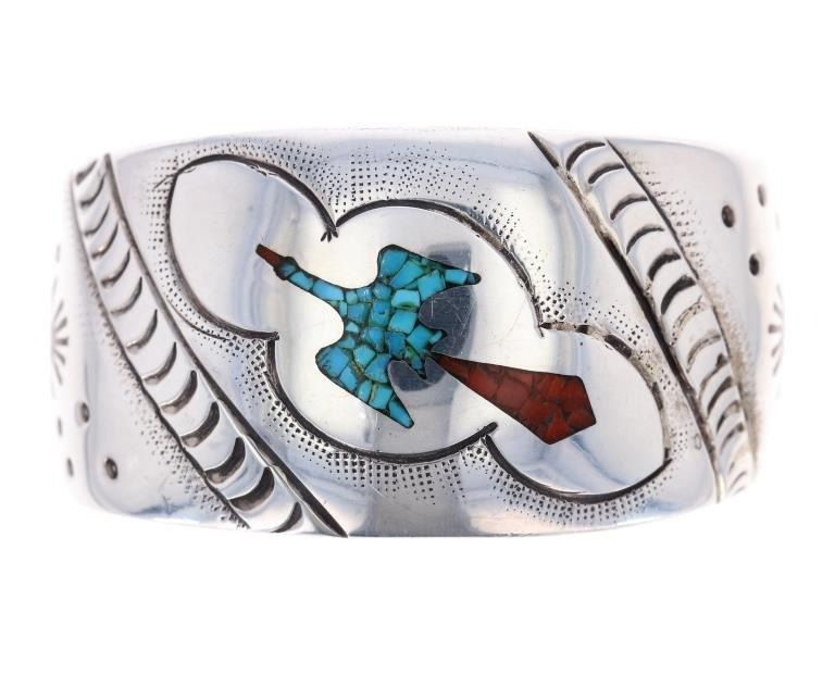 Featured in this lot is this chipped inlay bracelet circa 1960's from Navajo artist Tommy Singer. The braceelt features a wonderfully and professionally crafted sterling silver construction that features chipped inlay of turquoise and red branch coral that shows a central thunderbird effigy and shows chipped inlay geometric patterns to the tips of the bracelet with repousse arrangements to the face of the bracelet. The condition of this Tommy Singer bracelet is good with no obvious signs of damage and shows good overall condition. The measurements of this bracelet is 2" x 2 1/2" x 1 3/8" and the circumference is 4 1/4". The collective weight of this bracelet 76.3g.