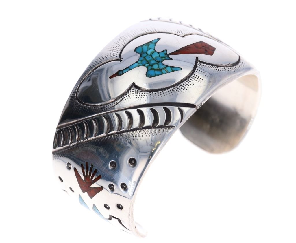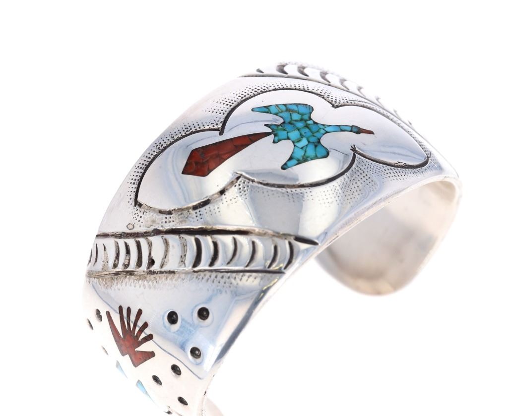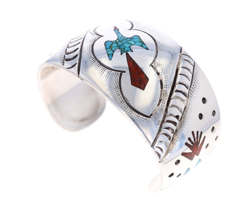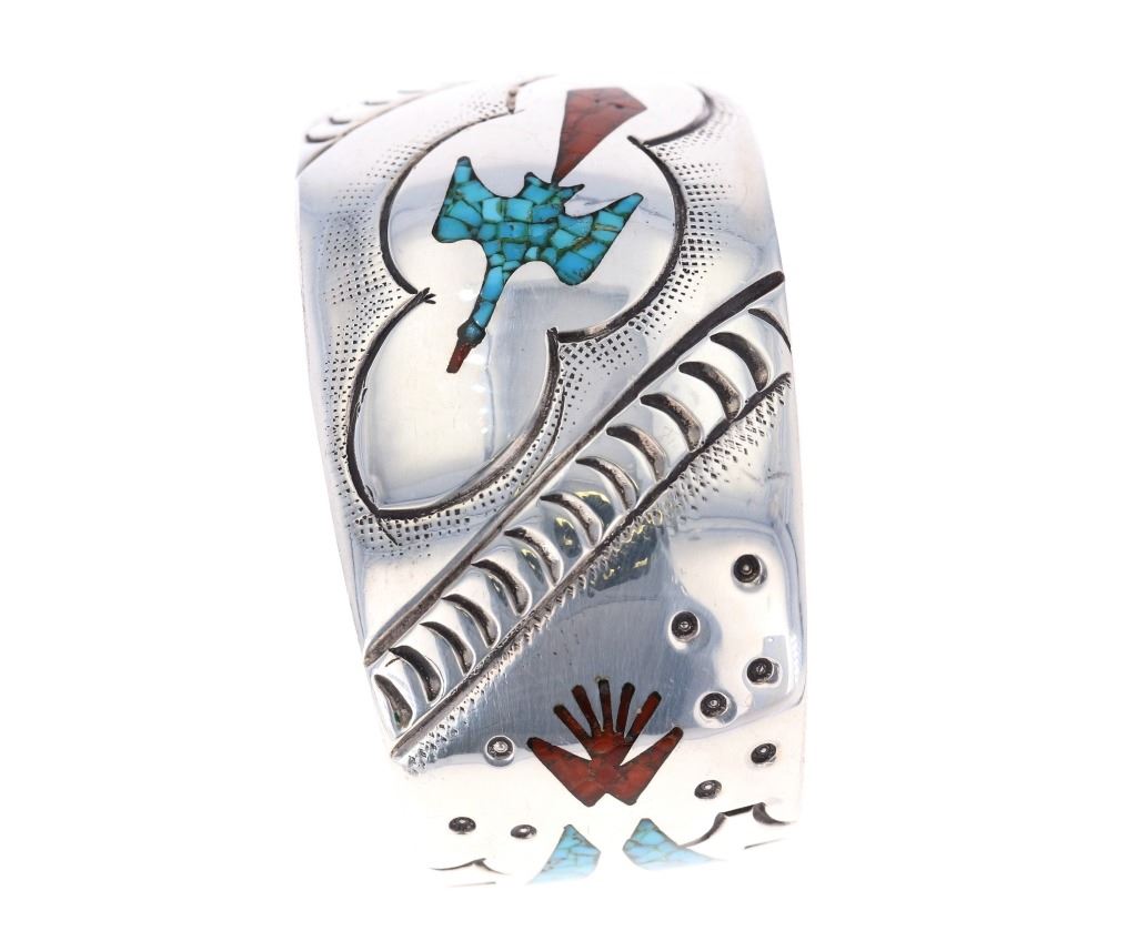 Featured in this lot is this chipped inlay bracelet circa 1960's from Navajo artist Tommy Singer. The braceelt features a wonderfully and professionally crafted sterling silver construction that features chipped inlay of turquoise and red branch coral that shows a central thunderbird effigy and shows chipped inlay geometric patterns to the tips of the bracelet with repousse arrangements to the face of the bracelet. The condition of this Tommy Singer bracelet is good with no obvious signs of damage and shows good overall condition. The measurements of this bracelet is 2" x 2 1/2" x 1 3/8" and the circumference is 4 1/4". The collective weight of this bracelet 76.3g.