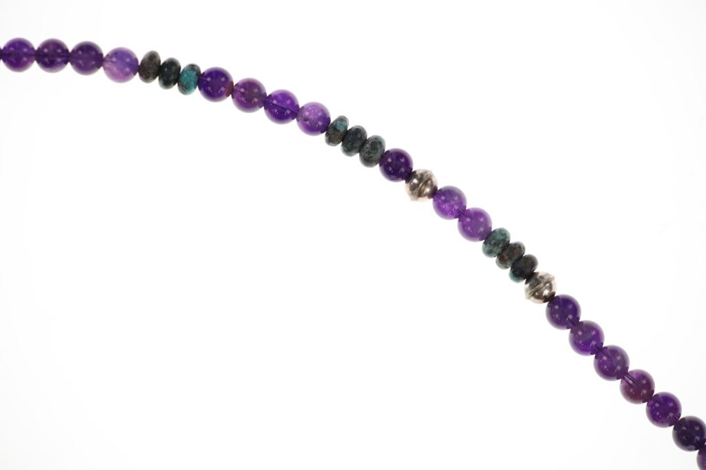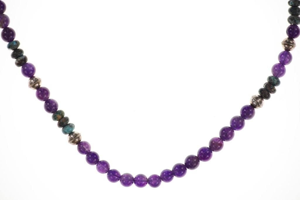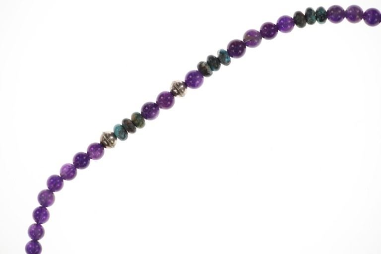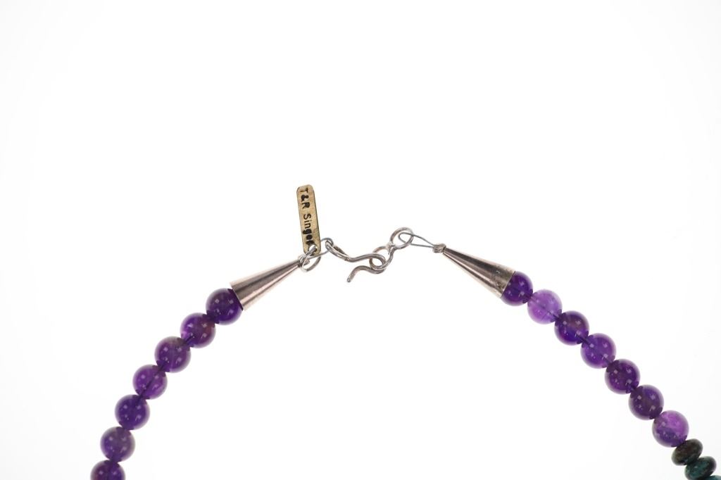 Featured in this lot is this Navajo Diné Sterling Silver Multistone Necklace, Signed by Navajo artists Thomas & Rose Singer. The choker necklace features a wonderfully and professionally crafted multistone construction that features lapis lazuli, turquoise and silver beads. Cone ends are marked, "Sterling", hook clasp labelled, "T&R Singer Sterling". Tommy is thought to be one of the most important and greatest contemporary silversmith artists and his work is highly sought after. Tommy Singer was a Navajo silversmith who passed away on May 31, 2014. After his death, his wife, Rose, continued to create jewelry using designs Tommy created prior to his passing. This beautiful choker necklace is in wonderful condition, measures 16"L from clasp to clasp. Collective weight is 21.3 grams.