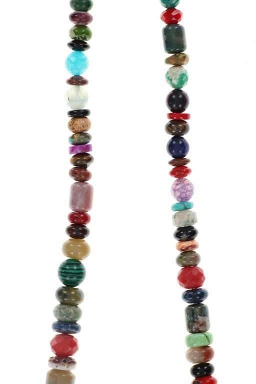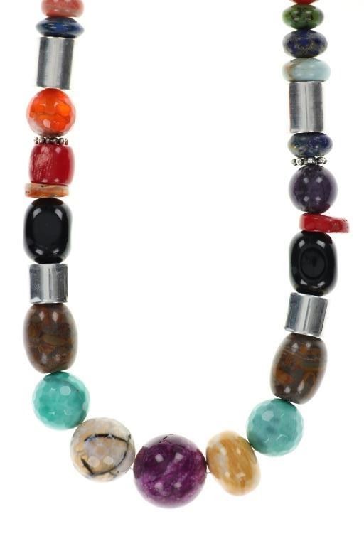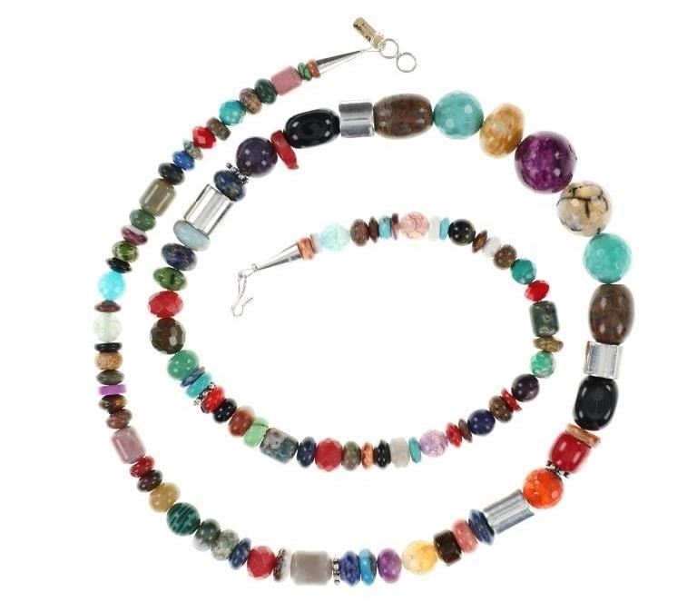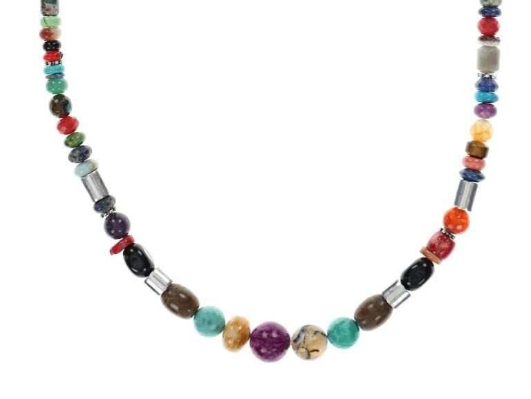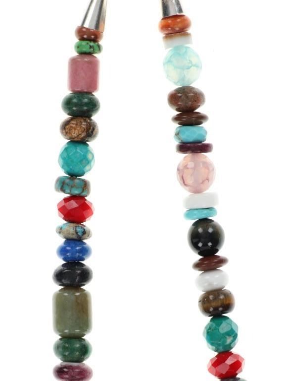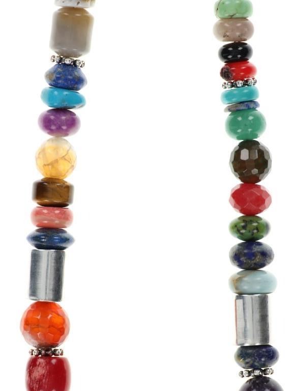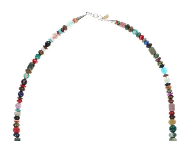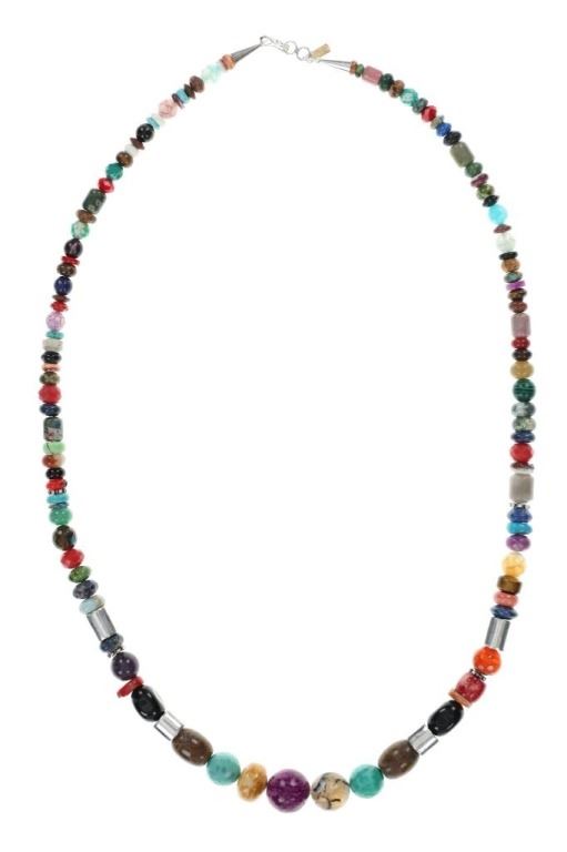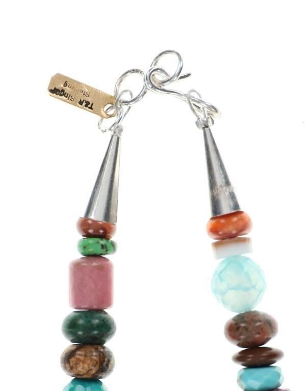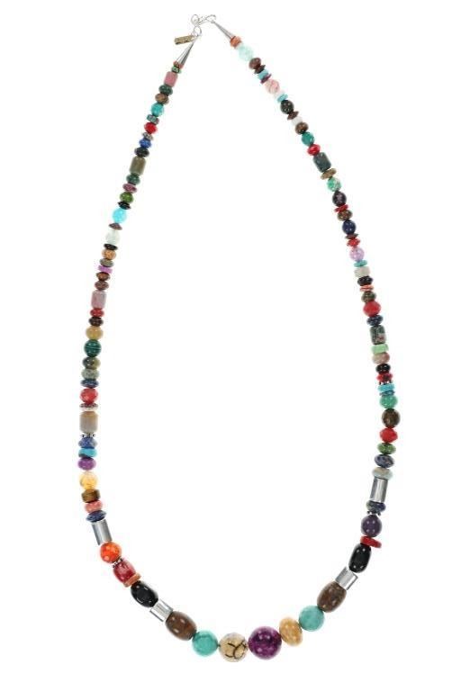 Featured in this lot is a multi stone graduated necklace from Navajo artist Tommy and Rose Singer. The necklace features a wonderfully and professionally crafted multi stone construction that shows stones such as amber, malachite, lapis lazuli, and colored glass. The tag on the necklace is marked as follows: T & R Singer - Sterling. The condition of this Navajo necklace is good with no obvious signs of damage and shows good overall condition. The measurement of this necklace is 30 1/2" from clasp to clasp and shows a total weight of _____.*