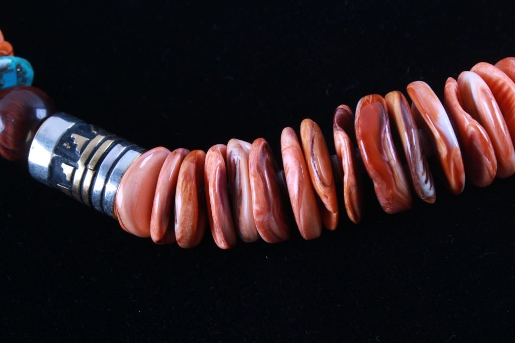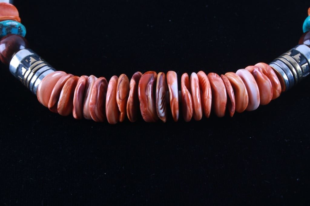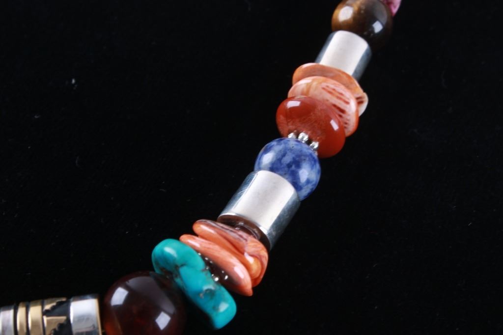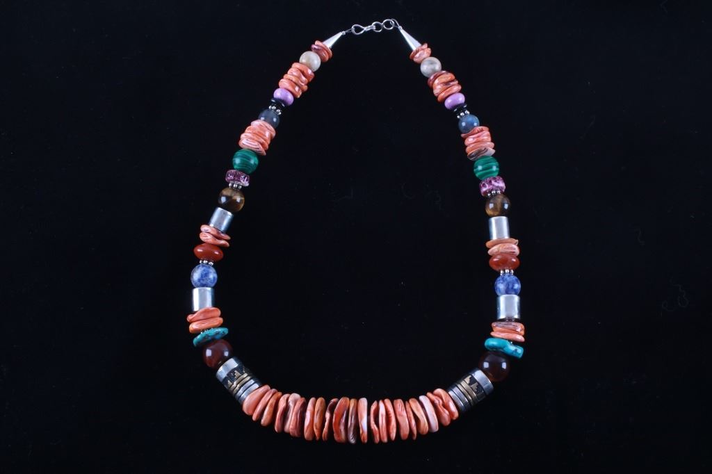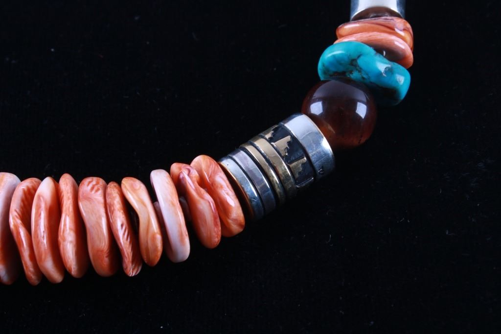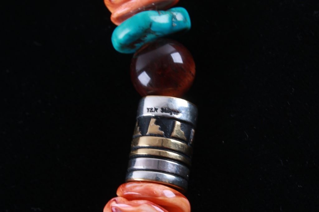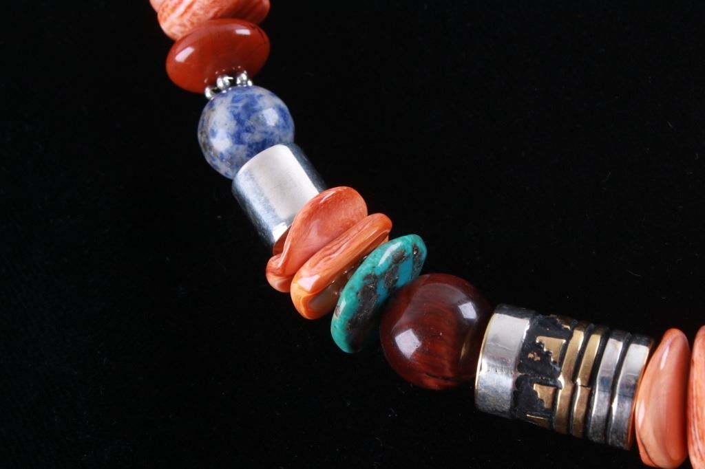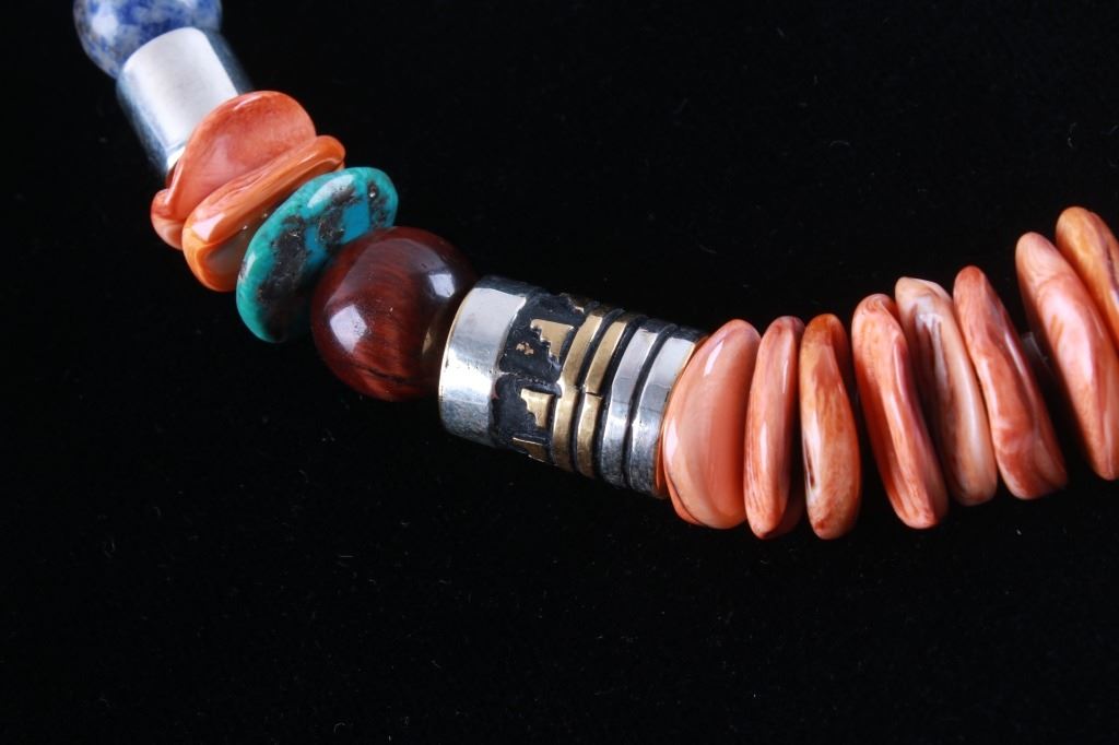 Featured in this lot is this sterling silver and 14k gold overlay, multi stone necklace from Navajo artists Tommy and Rose Singer. This signed necklace features a string of orange spiny oyster, turquoise, tiger’s eye gemstones, as well as a few other stones. The necklace is tipped with marked sterling aglet tips. The orange spiny oyster beads are separated by discoidal turquoise and silver beads. The signed rectangular pieces carry a traditional Navajo design and are stamped "T&R Singer". Tommy Singer was a Navajo silversmith who specialized in chip-inlay jewelry. He died on May 31, 2014. After his death, his wife, Rose, continued to create jewelry using designs Singer created prior to his passing. Tommy and Rose did come up with a new hallmark before he passed, which is “T&R Singer”. Any item marked T&R Singer was made after Tommy’s passing. The condition of this necklace is good, with no obvious signs of damage. The measurement of this necklace from clasp to clasp is 21.5". The collective weight of this necklace is 129.60 grams.