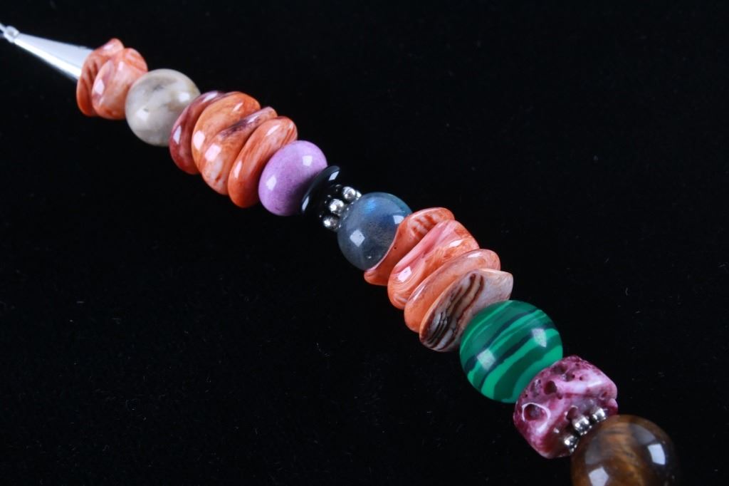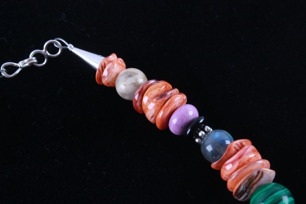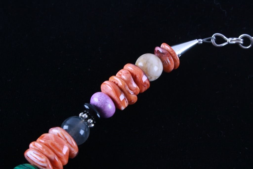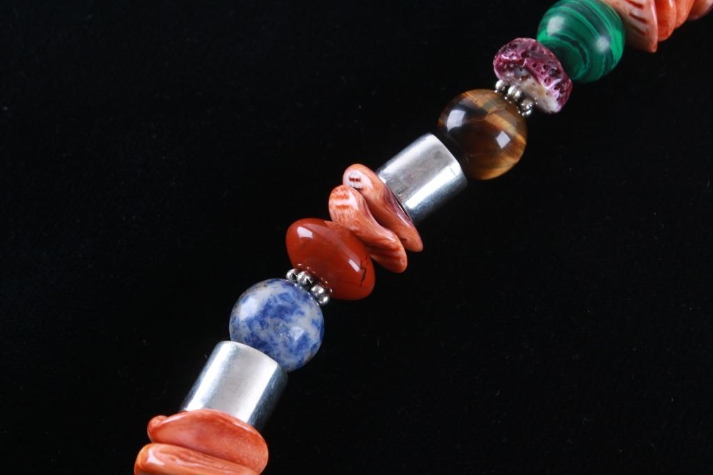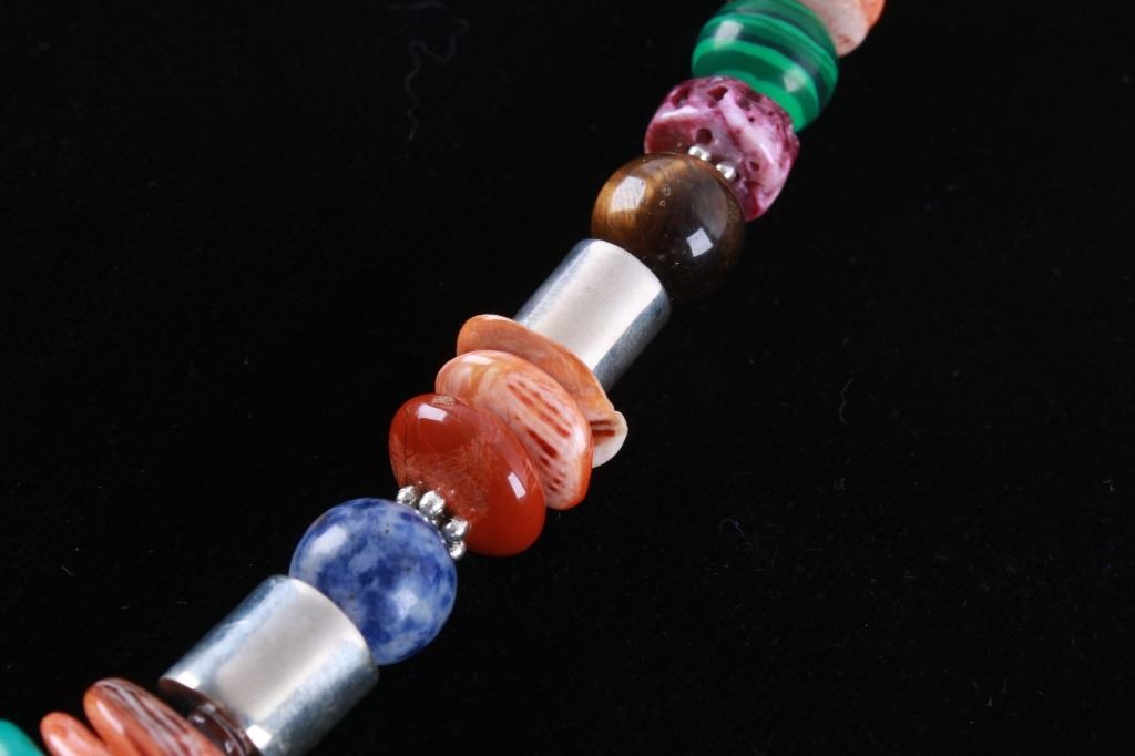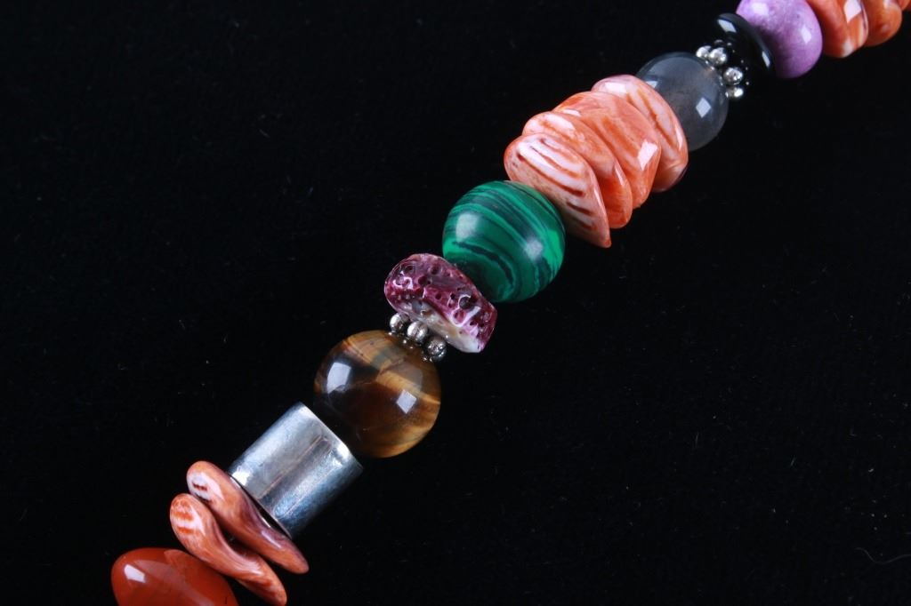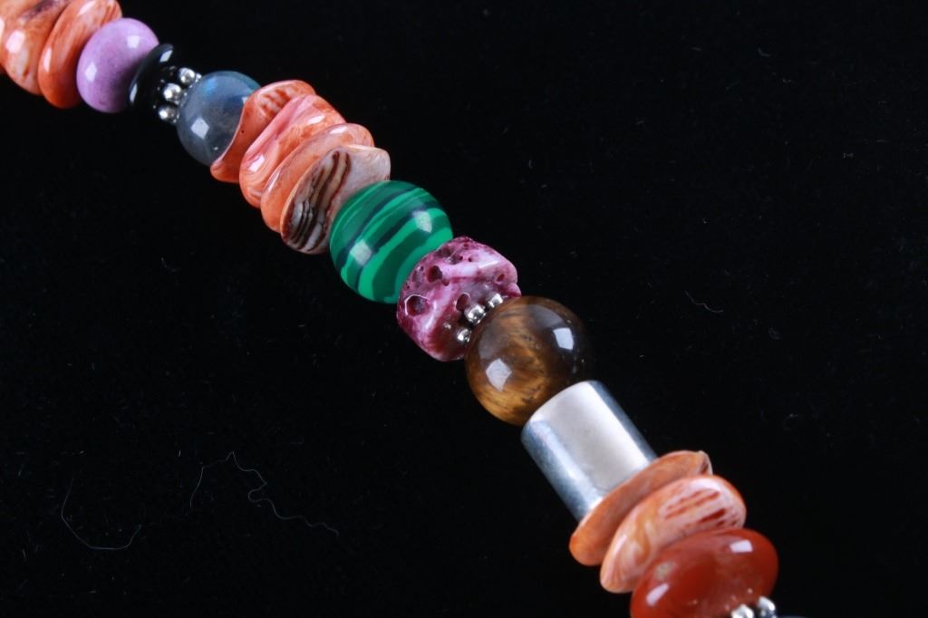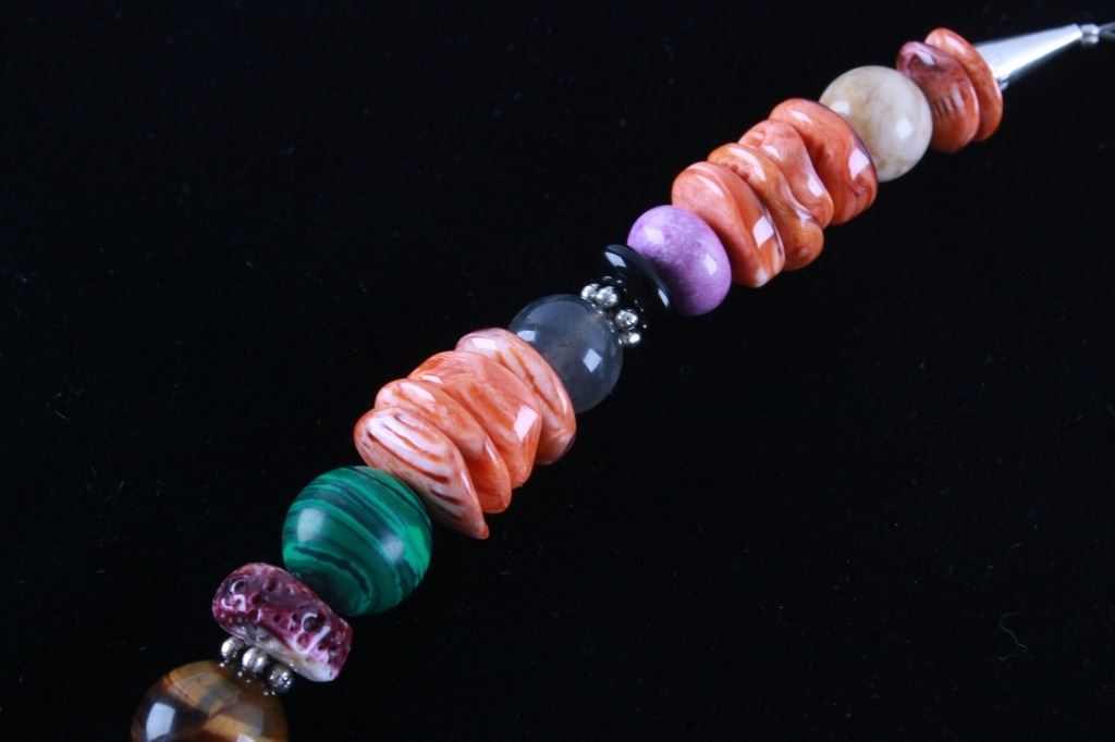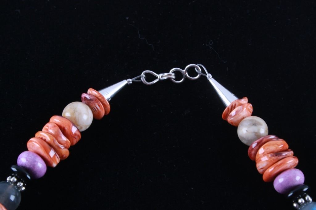 Featured in this lot is this sterling silver and 14k gold overlay, multi stone necklace from Navajo artists Tommy and Rose Singer. This signed necklace features a string of orange spiny oyster, turquoise, tiger’s eye gemstones, as well as a few other stones. The necklace is tipped with marked sterling aglet tips. The orange spiny oyster beads are separated by discoidal turquoise and silver beads. The signed rectangular pieces carry a traditional Navajo design and are stamped "T&R Singer". Tommy Singer was a Navajo silversmith who specialized in chip-inlay jewelry. He died on May 31, 2014. After his death, his wife, Rose, continued to create jewelry using designs Singer created prior to his passing. Tommy and Rose did come up with a new hallmark before he passed, which is “T&R Singer”. Any item marked T&R Singer was made after Tommy’s passing. The condition of this necklace is good, with no obvious signs of damage. The measurement of this necklace from clasp to clasp is 21.5". The collective weight of this necklace is 129.60 grams.