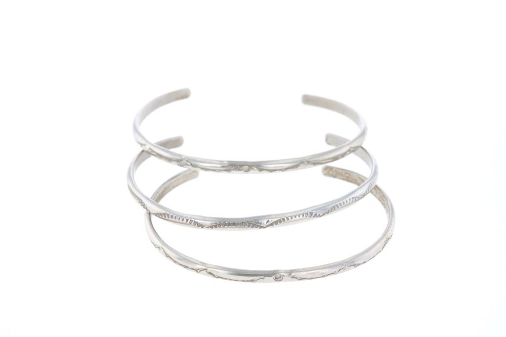 Featured in this lot is this Navajo tooled sterling silver bracelets circa 1940's. There are three bracelets in this collection. Each bracelet features a uniquely tooled face to the bracelets and shows a 'sterling' stamp on the inside of the bracelet band. The condition of this collection of bracelets is good with no obvious signs of damage and shows good overall condition. The measurements of the bracelets is 1 7/8" x 2 3/4" x 1/8" and the circumference of each of the bracelets is 4 1/2". The collective weight of the bracelets are 24.8g.