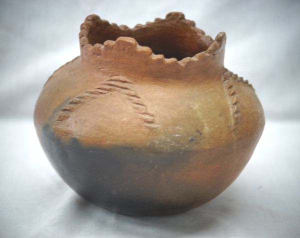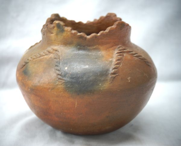 Navajo Traditional Cutaway Rim Bowl. Scalloped cut rim with applied rope figures on the shoulder. Measures 5'' x 7''.