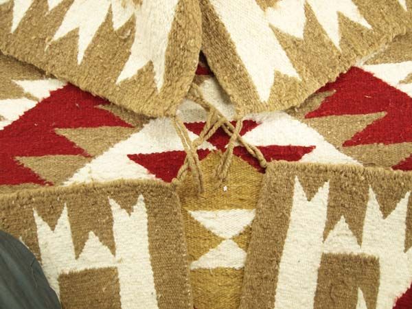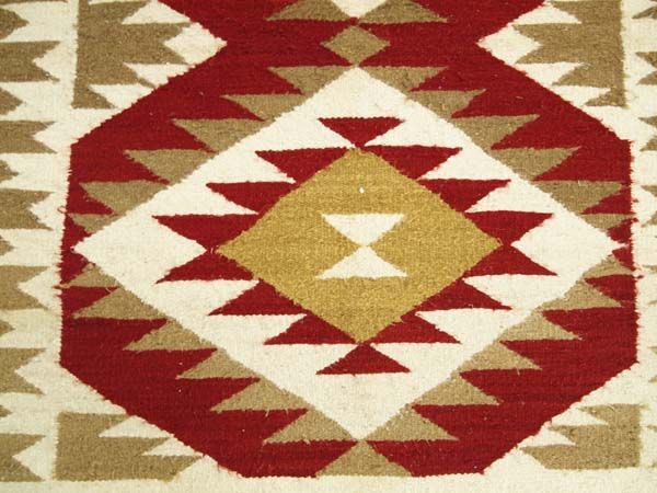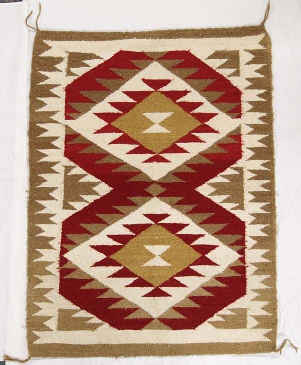 1950 Navajo Traditional Homespun Double Diamond Rug, 45.5''L x 34.25''W, selvage is in good condition, no bleeding on this rug, 4 cornered tassels intact, maroon, ochre, light brown, and cream