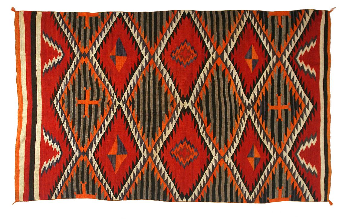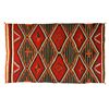 Navajo Transitional Serape. 7'11" x 4'11" woven from silky, long staple churro wool. Very colorful with Spider Woman Crosses and a striped Moki style background. Beautiful! Circa 1890. (est. $5,000-7,000). CONDITION REPORTS: www.auctioninsantafe.com/docs/cr2012.pdf