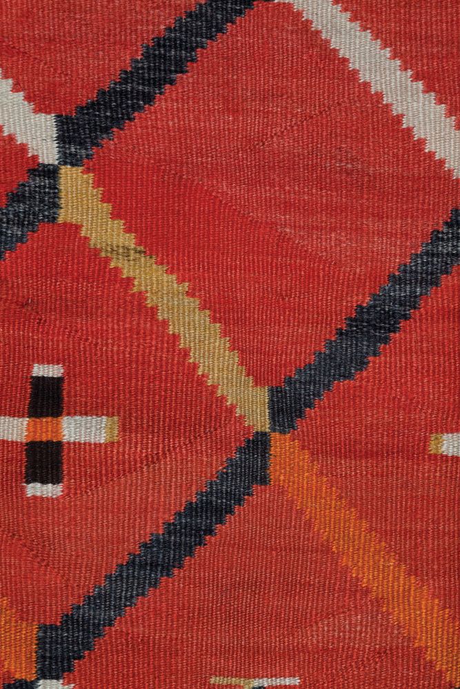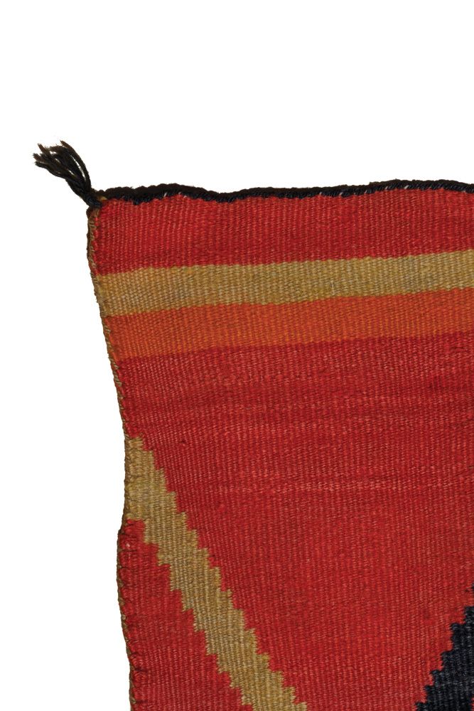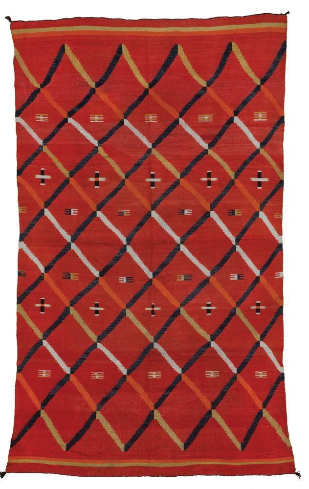 88” x 53” all hand spun native wool, with natural aniline and possibly vegetal dyes. Early, classic connected-diamond design. Banded ends and floating crosses. Circa 1890s.