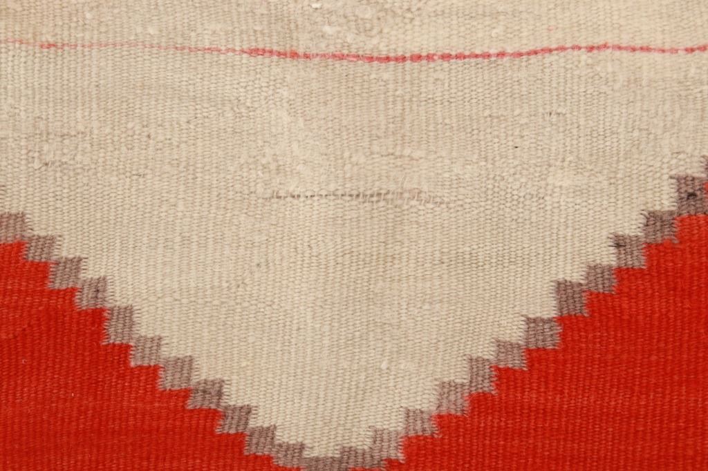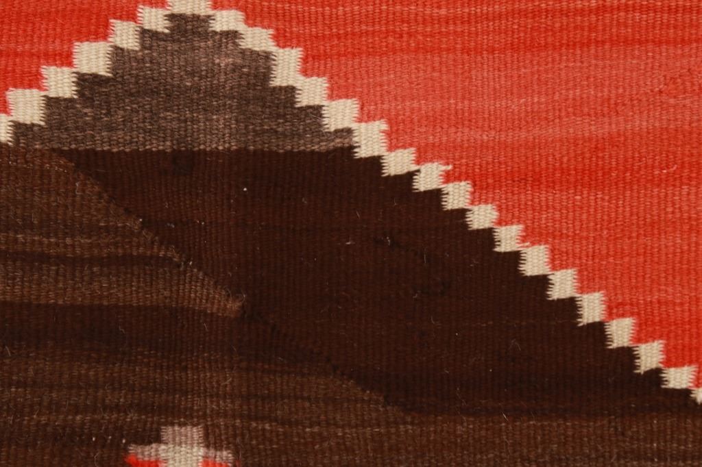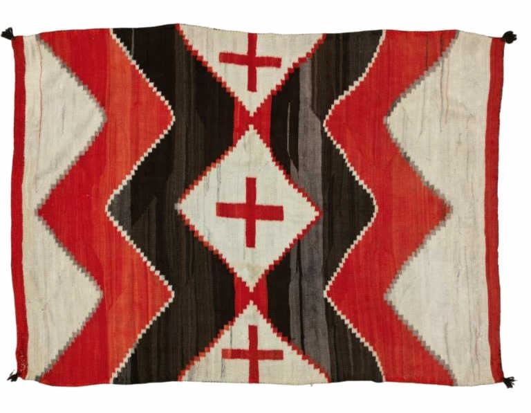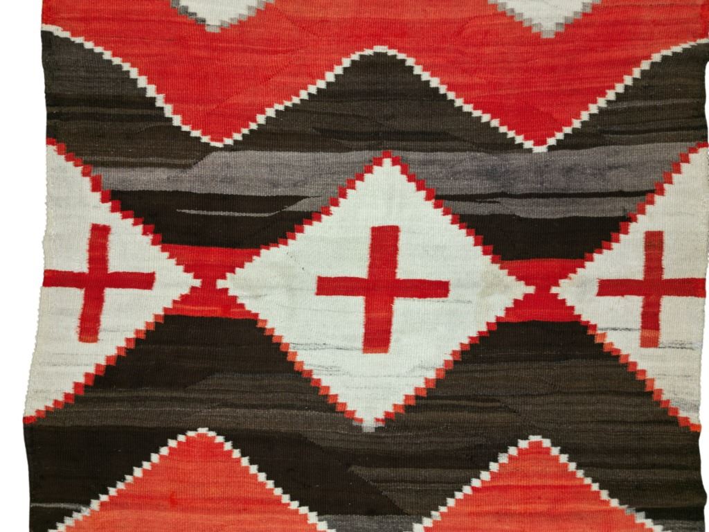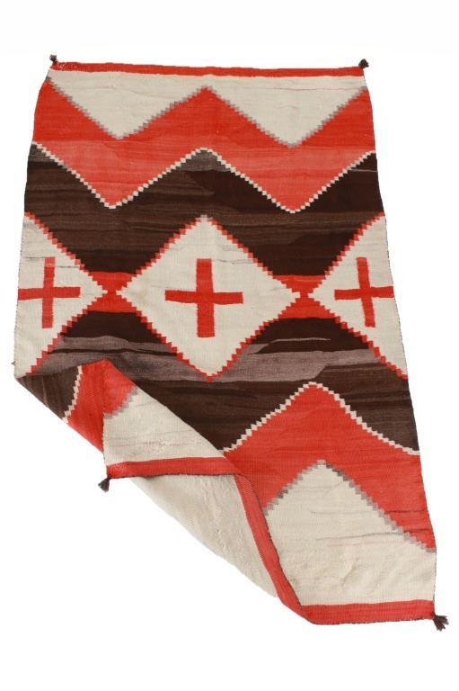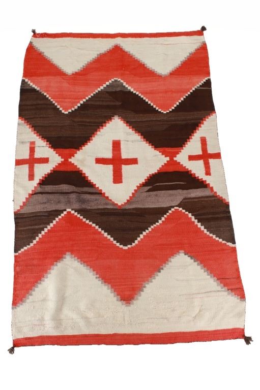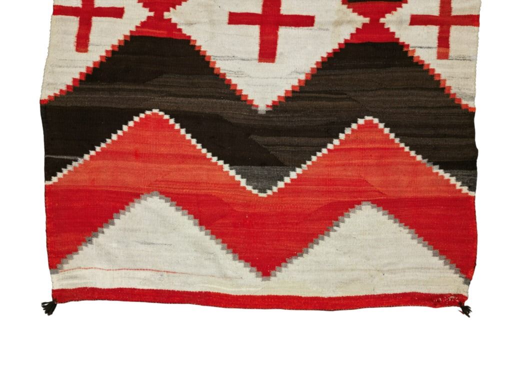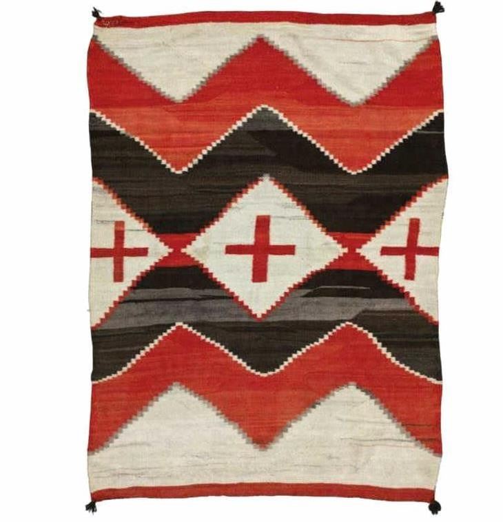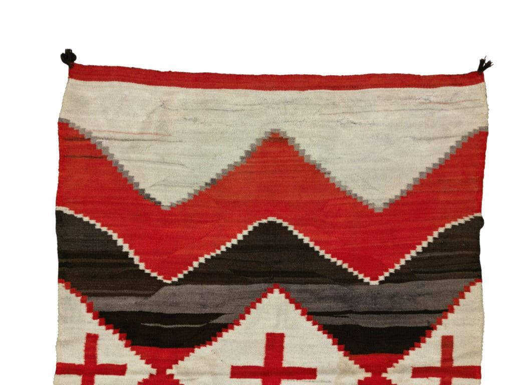 The lot features a late-19th century Navajo Transitional large men’s serape blanket with stunning Spider Woman Crosses. The rug shows a soft natural spun wool with large size showing a stepped zig-zag pattern in red, brown, greys, and natural white with three Spider Woman Crosses at the center. You can see various lazy lines and wonderful variation in the wools coloring. This is one of the larger transitional men’s serapes we have offered. The blanket is well preserved condition with some small staining that could easily be cleaned, no apparent or obvious color bleeding and no major damages, there is typical wear and a small repair in a corner. Interestingly the blanket shows a few lines with red or grey in the white field, an early indicator of the weaver using what yarn they had available. The measurements of this blanket is 80" x 57 1/2". Provenance: From a prominent ex-Bozeman private collection who purchased the majority of his collection from Cowan's, Skinner, Bonhams, Morphy's, Sotheby's, March in Montana, North American Auction and other well revered auction houses.