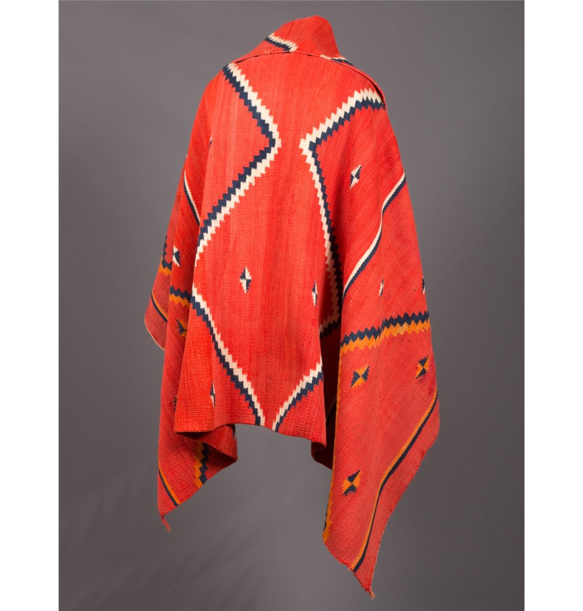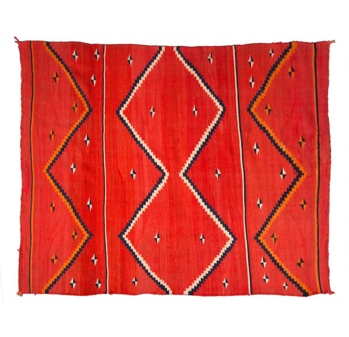 Navajo Transitional Wearing Blanket. 5'7" x 4'6". Classic red background with white, blue and orange zig zag elements. Star pattern throughout field. Circa 1880s.