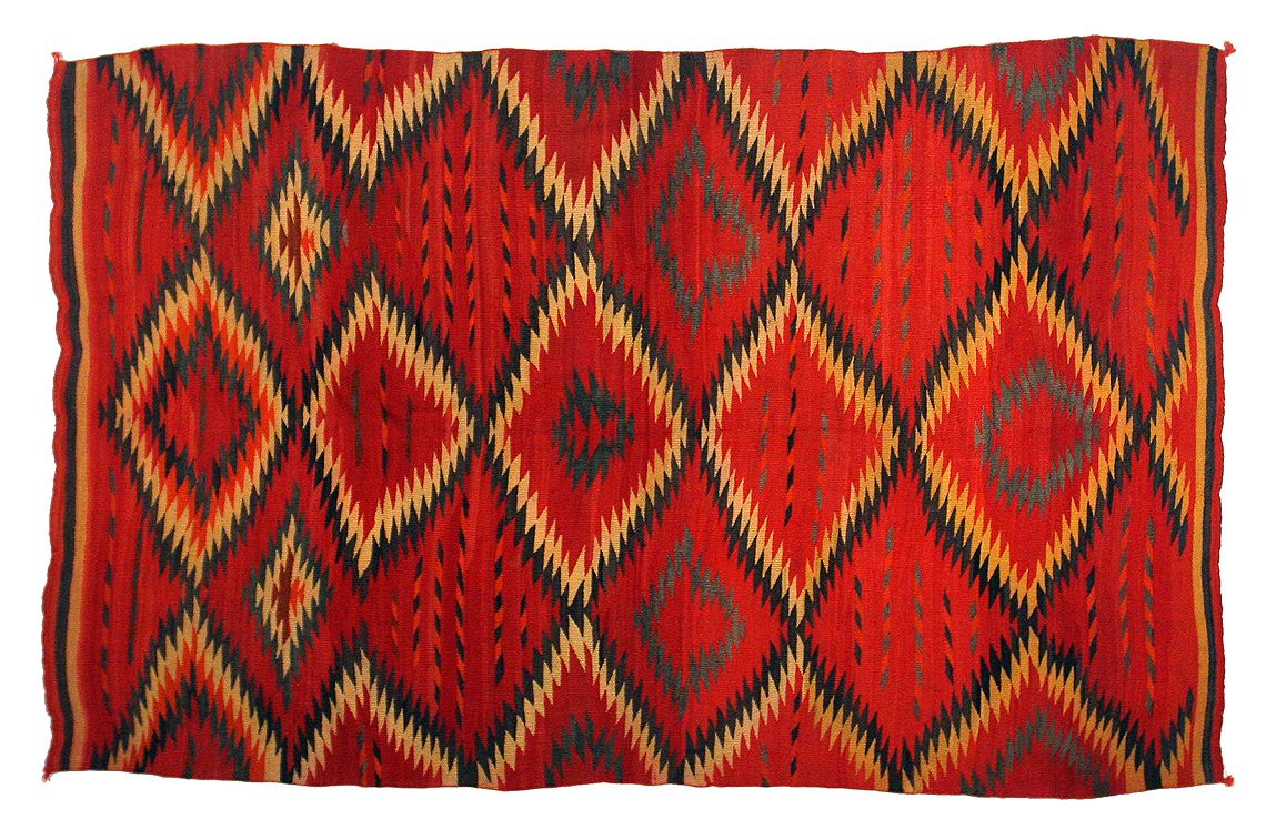 Navajo Transitional Weaving. 7'10" x 4'11" with serrated diamond design in bright eye dazzler pattern. Large & finely woven old blanket! Circa 1890s. (est. $4,000-5,000). CONDITION REPORTS: www.auctioninsantafe.com/docs/cr2012.pdf