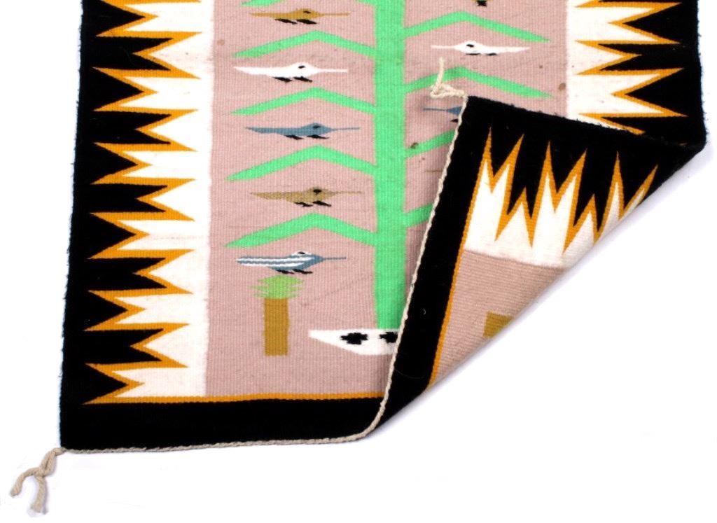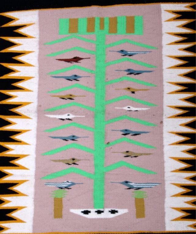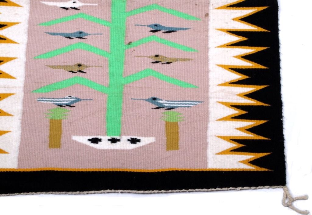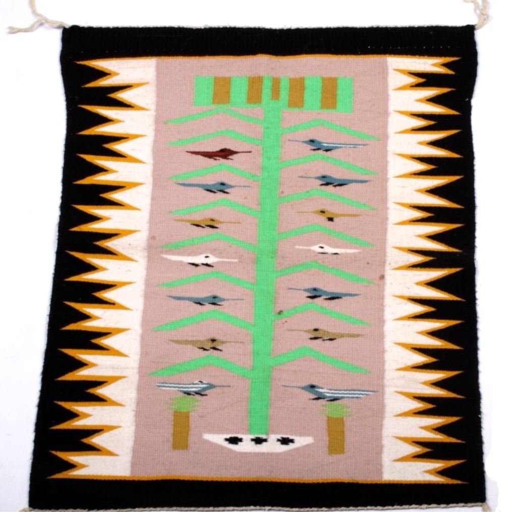 For your consideration is this tightly woven Navajo Tree of Life pictorial wool rug. Navajo Tree of Life weavings all feature a central stalk of corn, the Navajo Tree of Life, emerging from a sacred matrimonial basket. On the cornstalk leaves are birds of various colors bringing messages of goodwill from the gods. On this rug we see the Tree of Life and the birds against a warm beige field flanked by a reciprocating arrow nock pattern in cream and golden wheat. The outside border of the rug is black and the rug has four cream colored tassels. As previously noted, the rug is tightly woven and it is in excellent condition. The rug measures 26.25" x 31.5".
