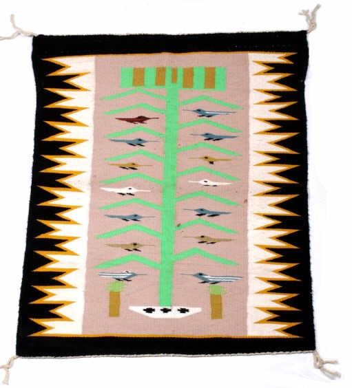 For your consideration is this tightly woven Navajo Tree of Life pictorial wool rug. Navajo Tree of Life weavings all feature a central stalk of corn, the Navajo Tree of Life, emerging from a sacred matrimonial basket. On the cornstalk leaves are birds of various colors bringing messages of goodwill from the gods. On this rug we see the Tree of Life and the birds against a warm beige field flanked by a reciprocating arrow nock pattern in cream and golden wheat. The outside border of the rug is black and the rug has four cream colored tassels. As previously noted, the rug is tightly woven and it is in excellent condition. The rug measures 26.25" x 31.5".