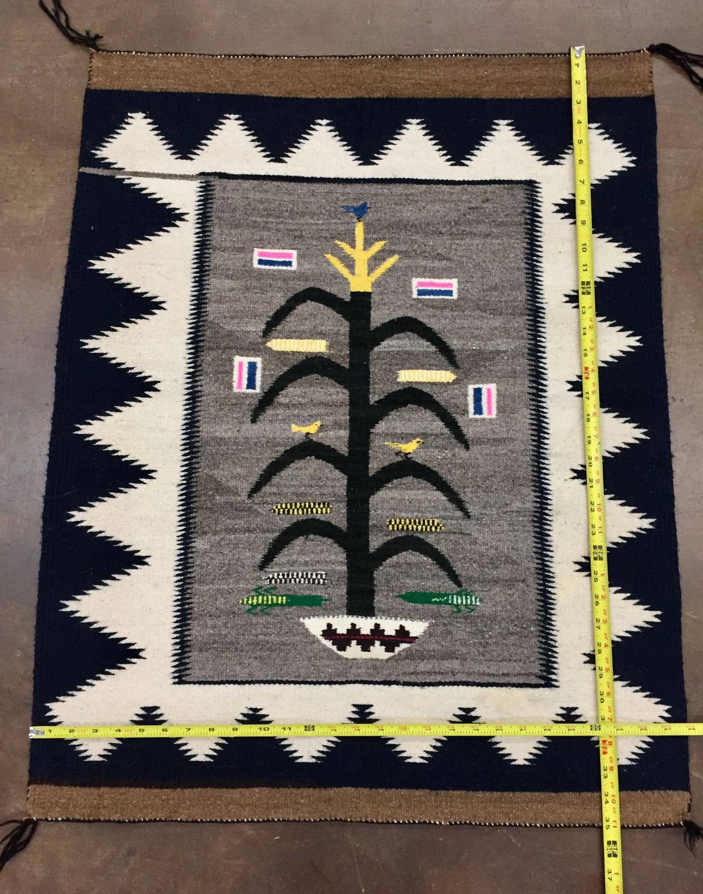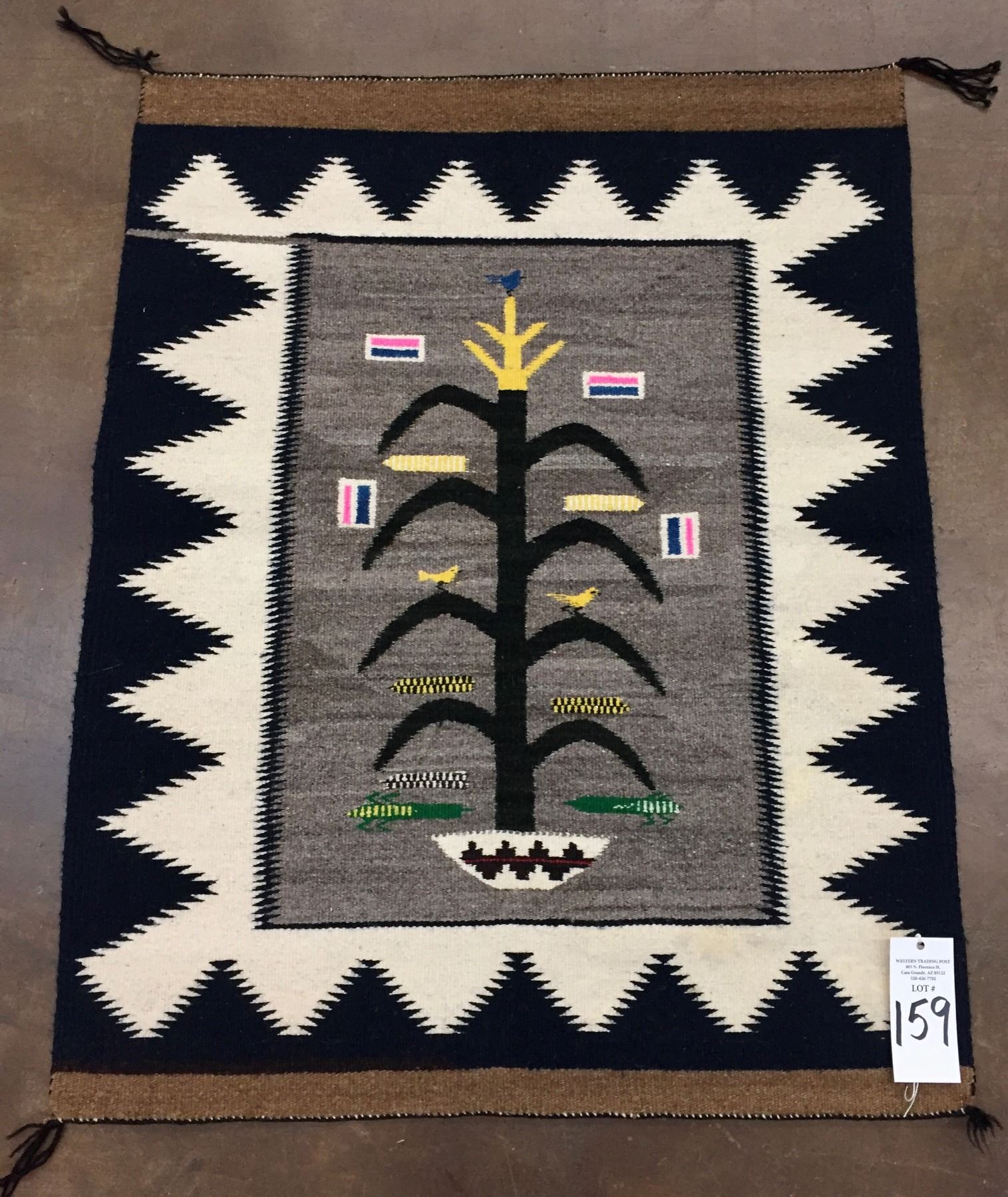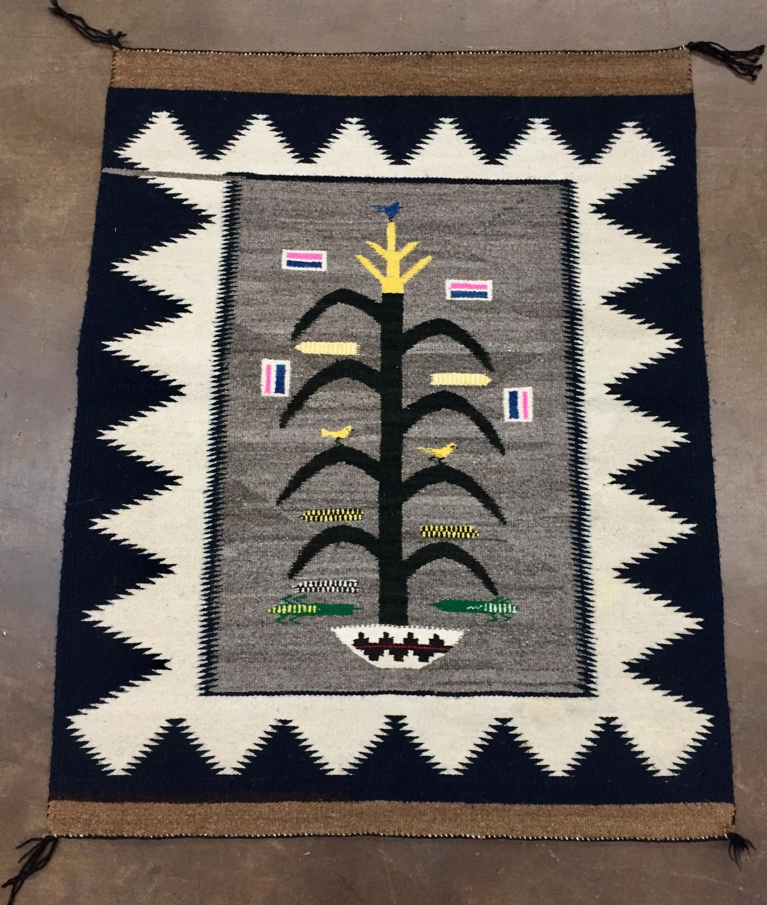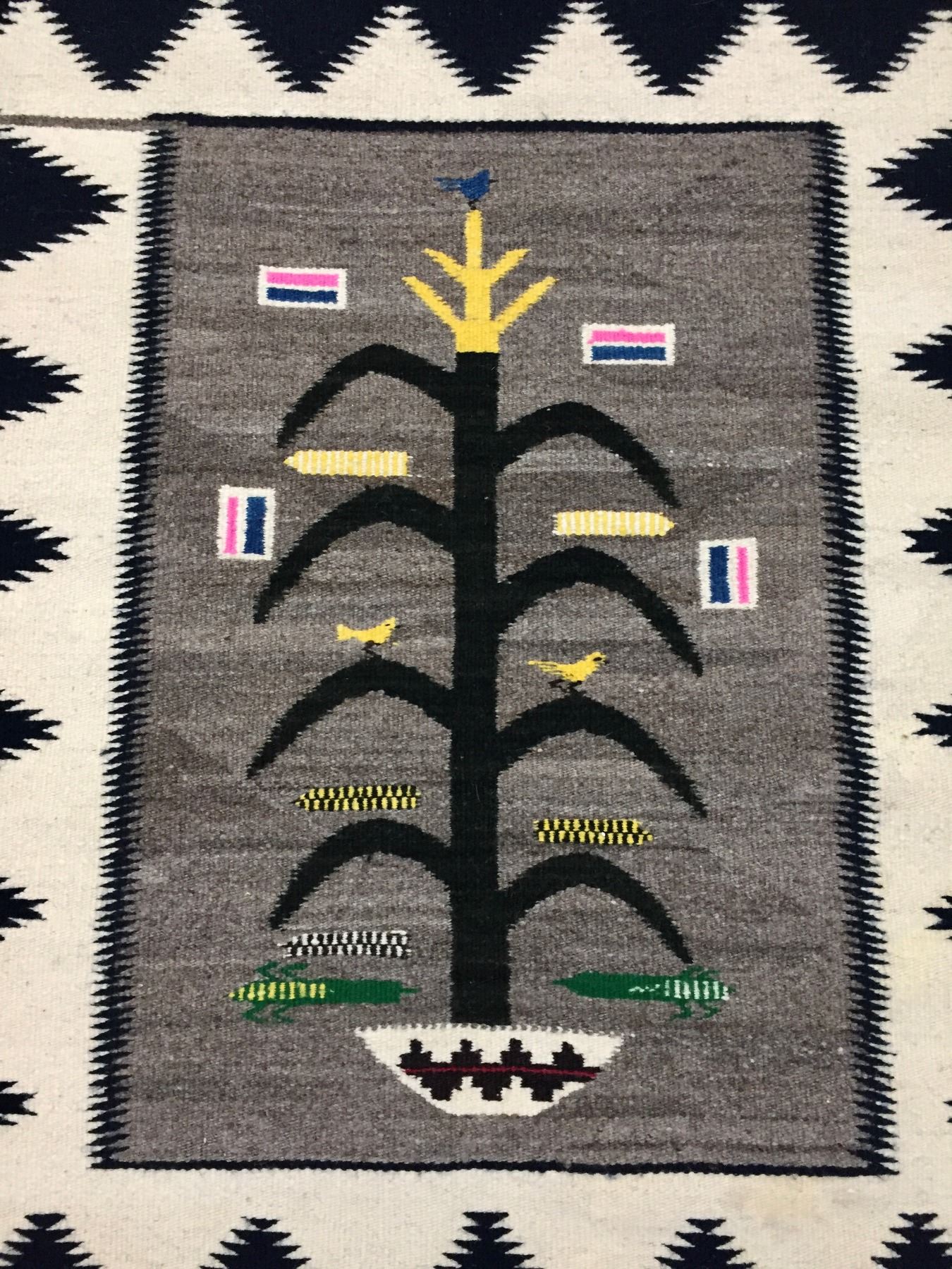 Description: Presented for sale in this lot is a vintage Navajo "Tree of Life" textile featuring blacks, whites, yellows, blues, pinks and grays.
