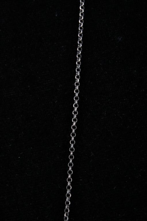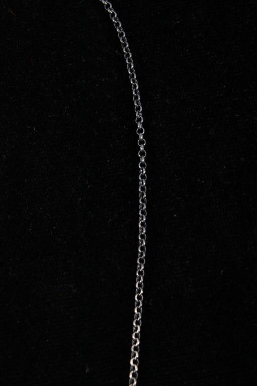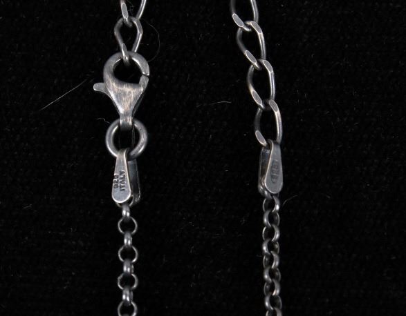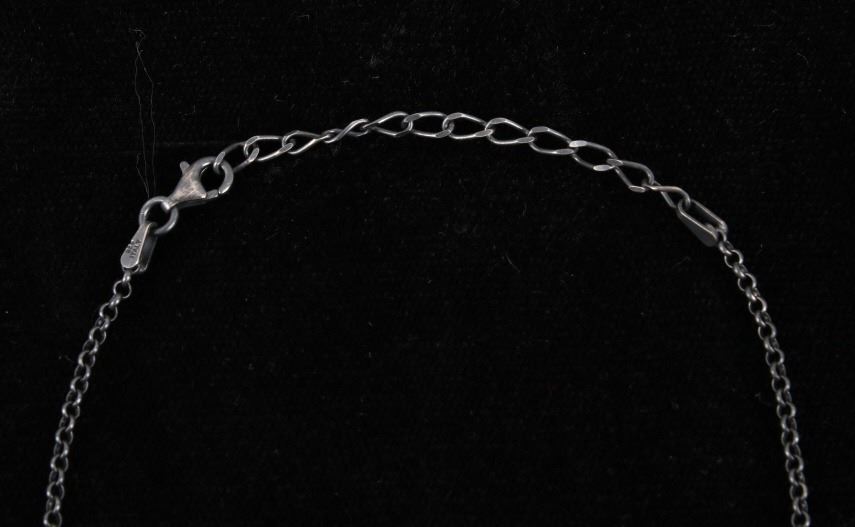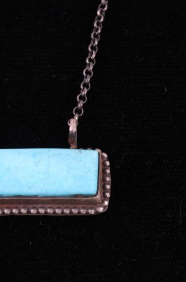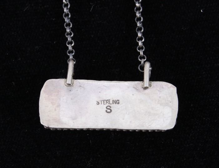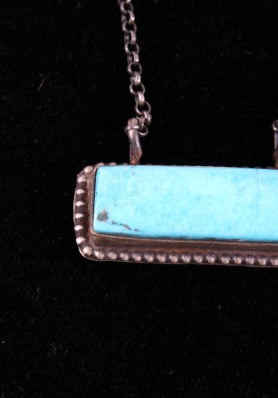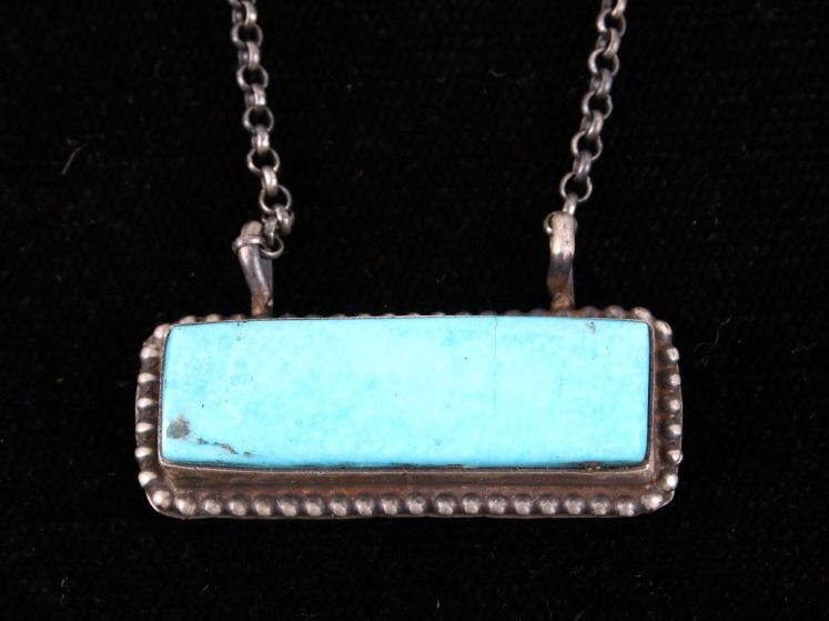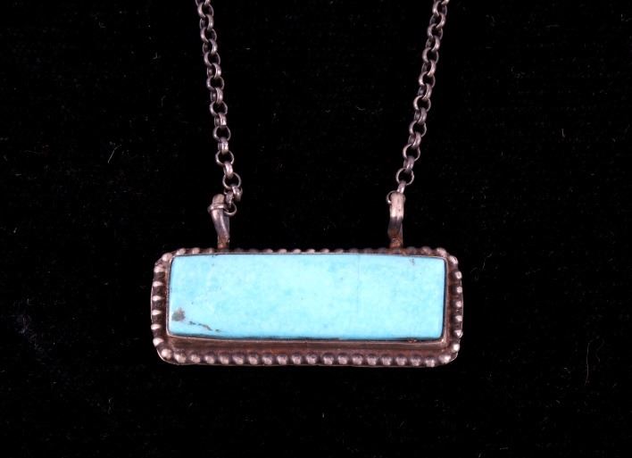 Included in this lot is a Navajo Native American Kingman turquoise sterling silver necklace. This necklace features a wonderful rectangular cut polished gemstone of Kingman turquoise. The stone is expertly placed in a shadow box setting and features a beaded silver boarder. The pendant is strung along on a cable style chain. The back of the pendant is stamped with the artists hallmark "S" for Tricia Smith and marked "Sterling". The necklace measures 18 ¾” when unclasped.