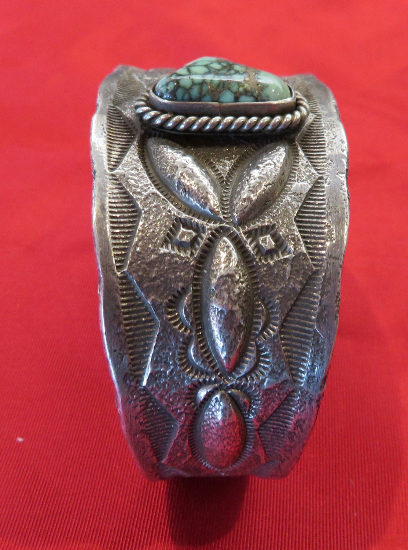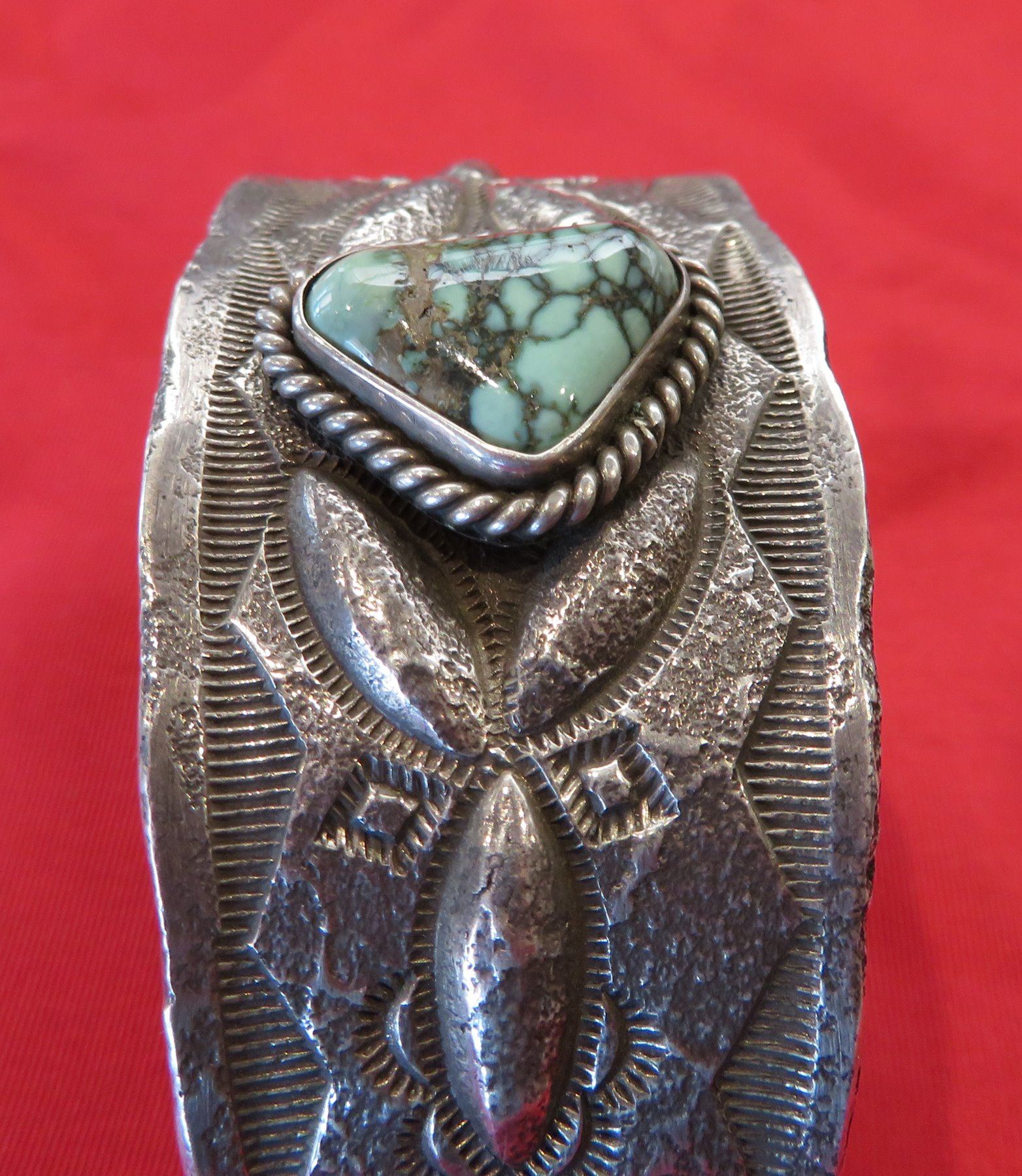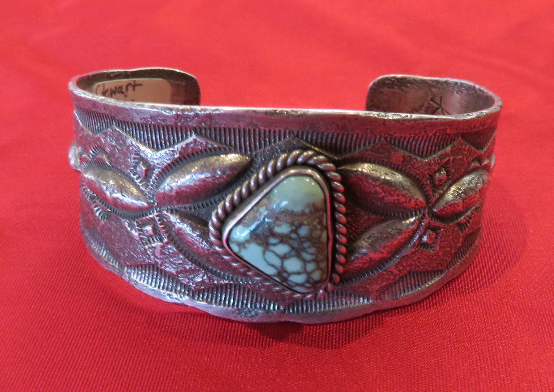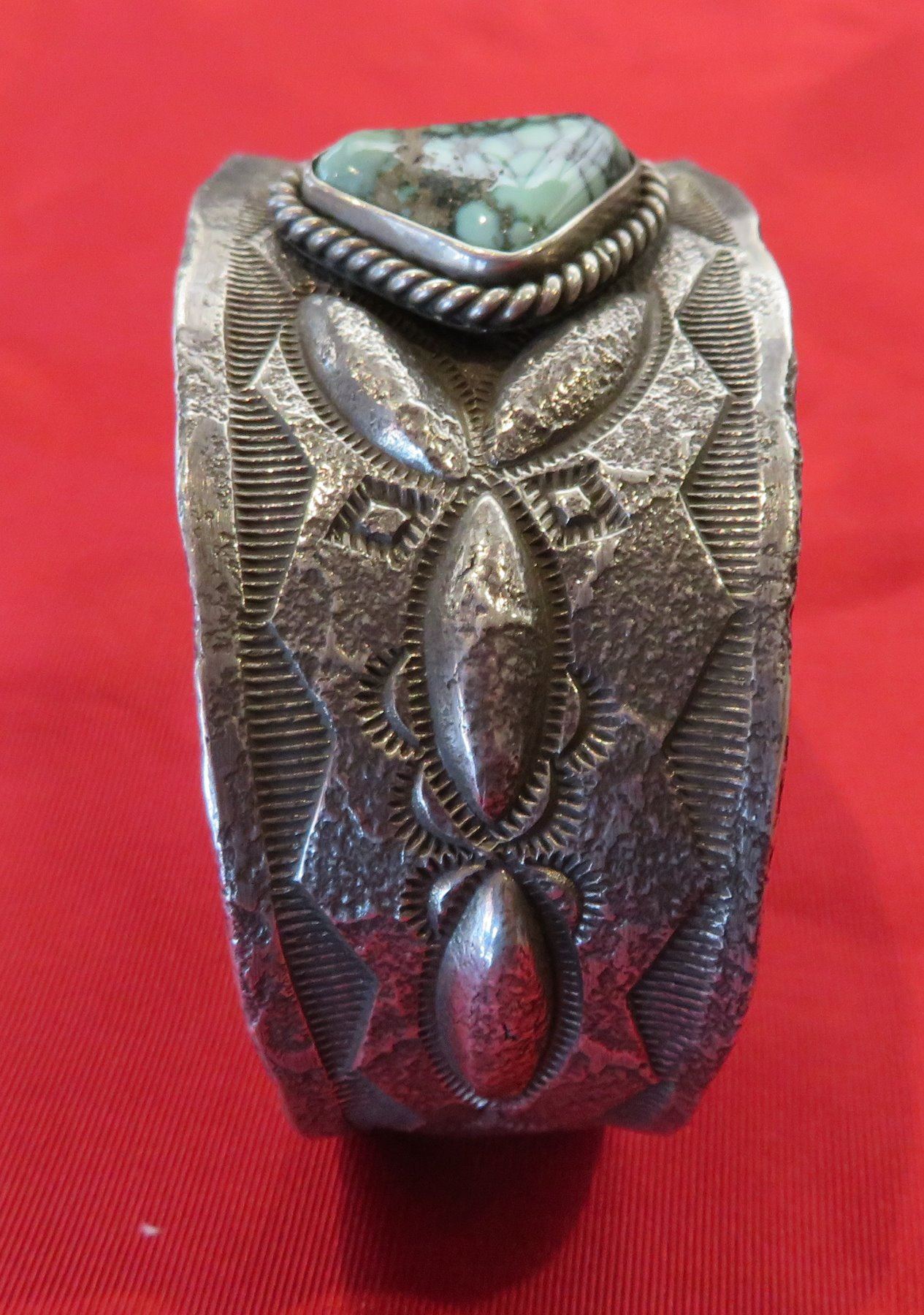 Navajo Tufa Cast Bracelet w/Turquoise, modern item. Made of sterilng silver and turquoise, the item measures 5 1/2" inside, with a 1 1/4" gap, and overall dimensions of 2 1/2" x 2" x 1 1/4". Navajo, believed to be made by Stewart Billie. Repousse cuff weighing approx. 55 grams. Condition: Good, see images. Shipping: $20.00 w/insurance and signature.