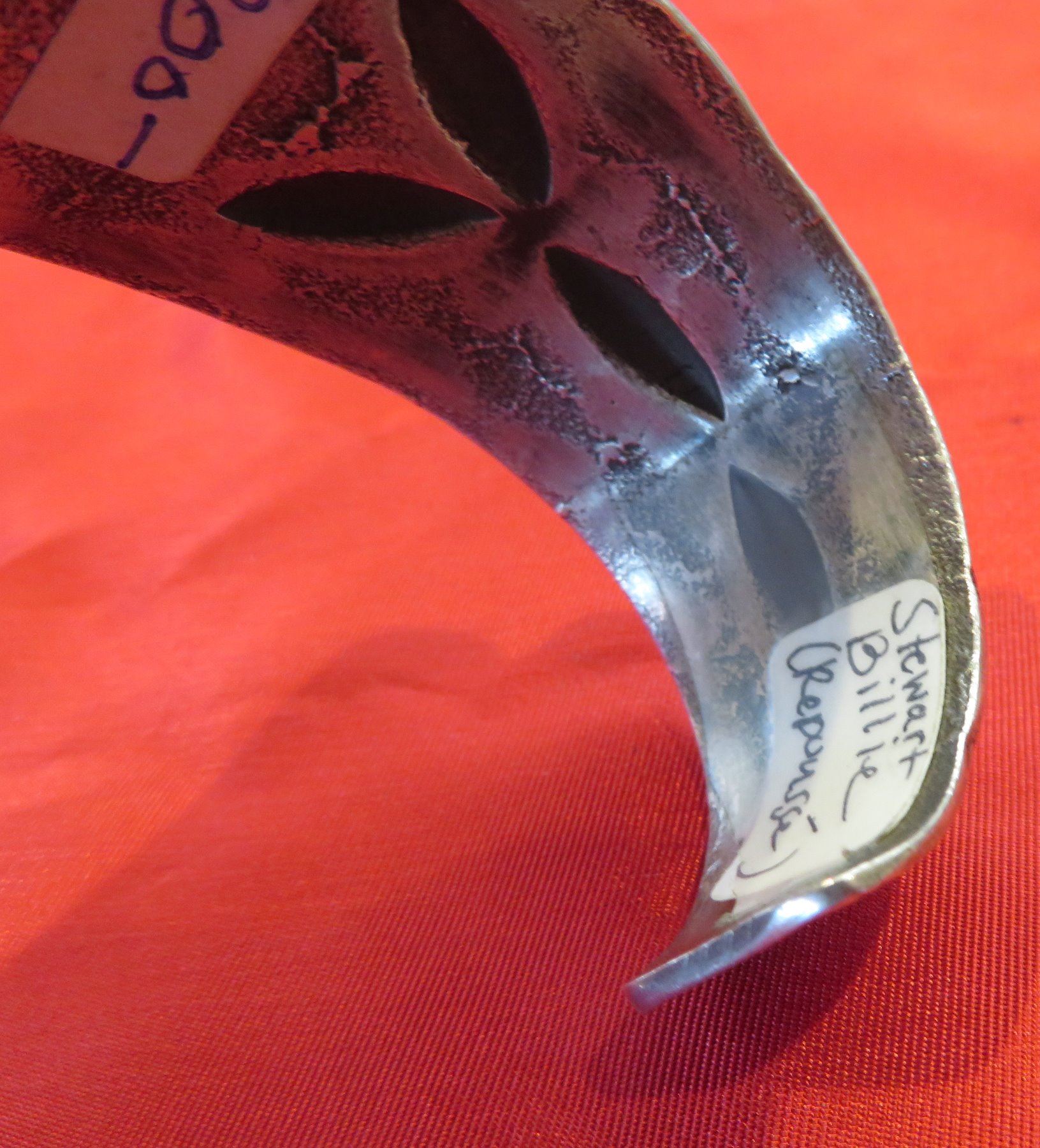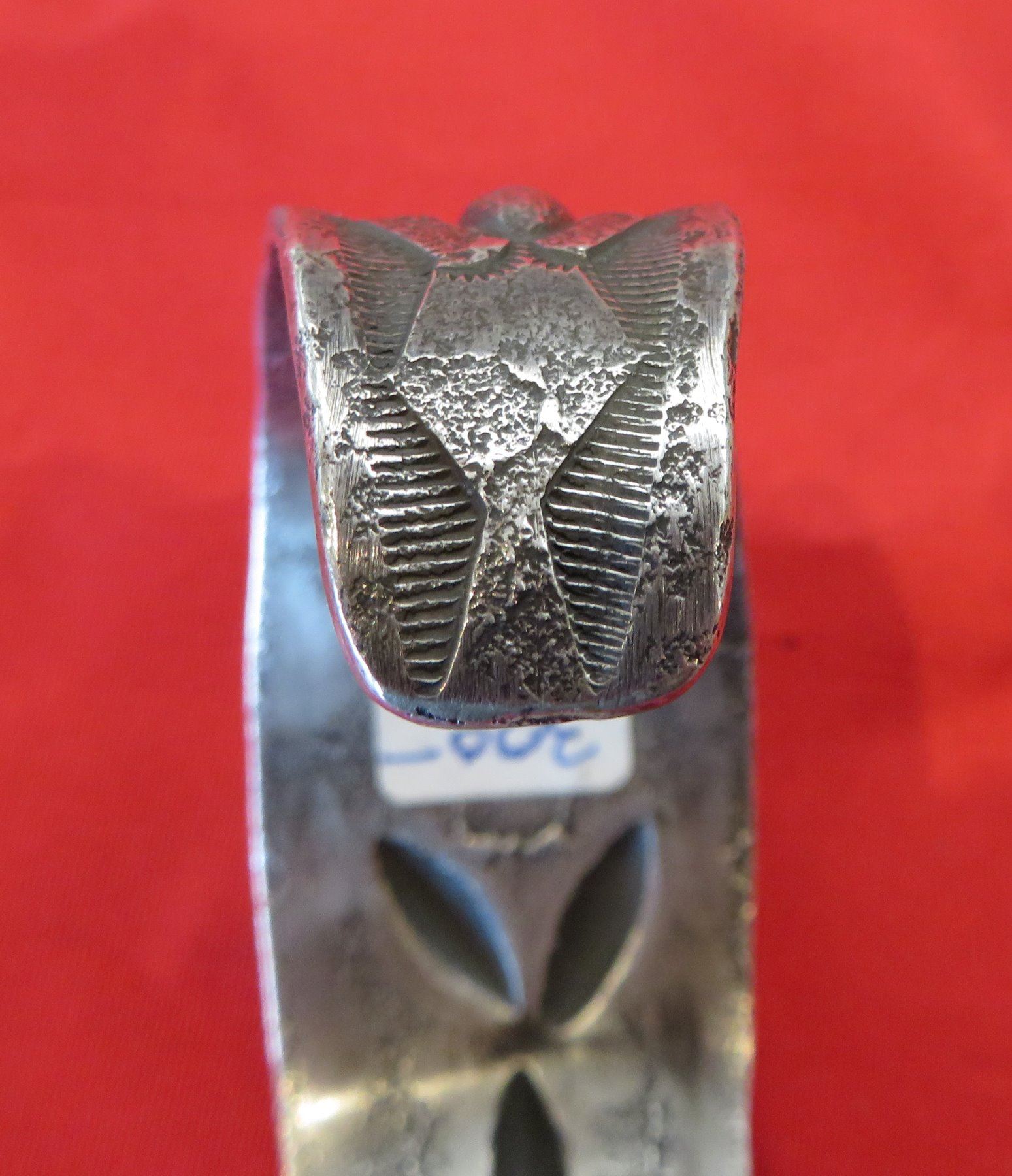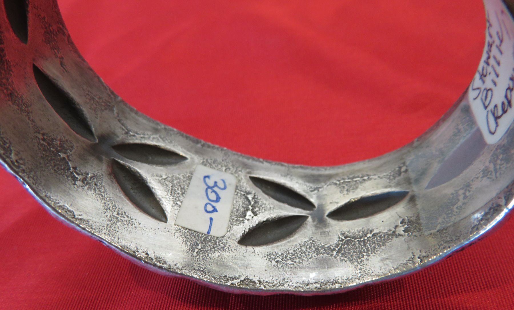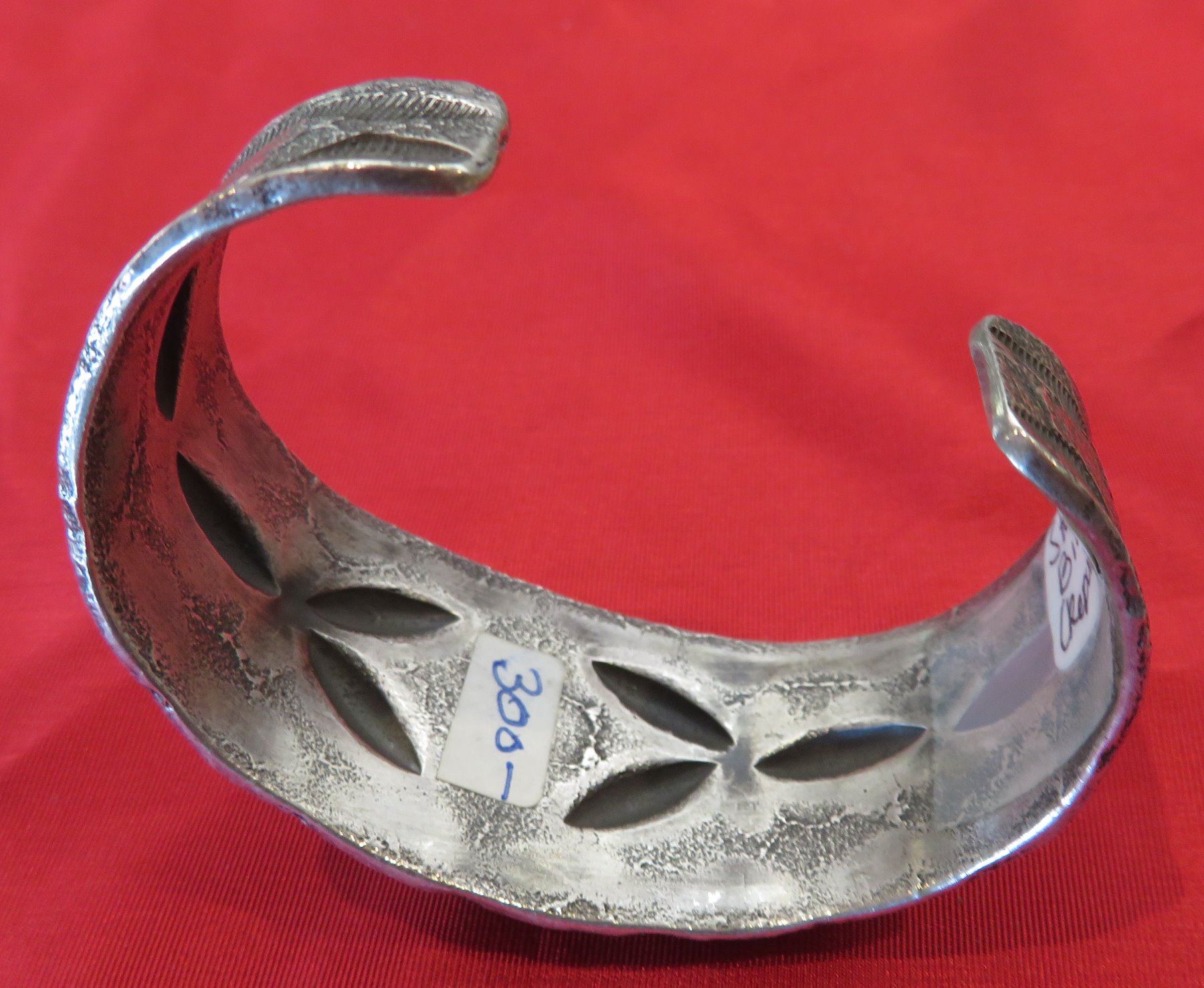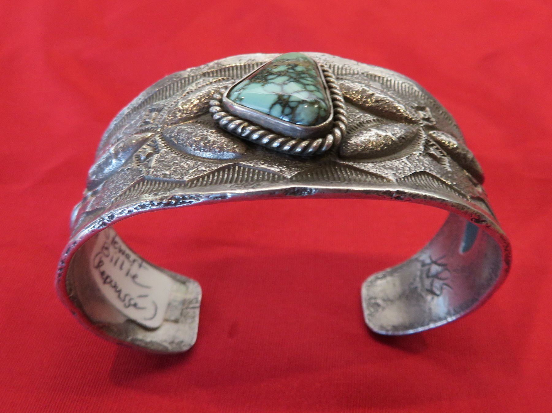 Navajo Tufa Cast Bracelet w/Turquoise, modern item. Made of sterilng silver and turquoise, the item measures 5 1/2" inside, with a 1 1/4" gap, and overall dimensions of 2 1/2" x 2" x 1 1/4". Navajo, believed to be made by Stewart Billie. Repousse cuff weighing approx. 55 grams. Condition: Good, see images. Shipping: $20.00 w/insurance and signature.
