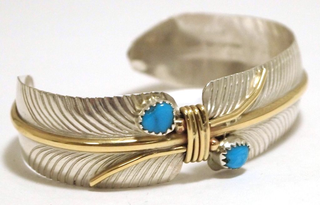 Navajo Turquoise & 12k Gold Fill over Sterling Silver Feather Cuff Bracelet - Virgil Reader