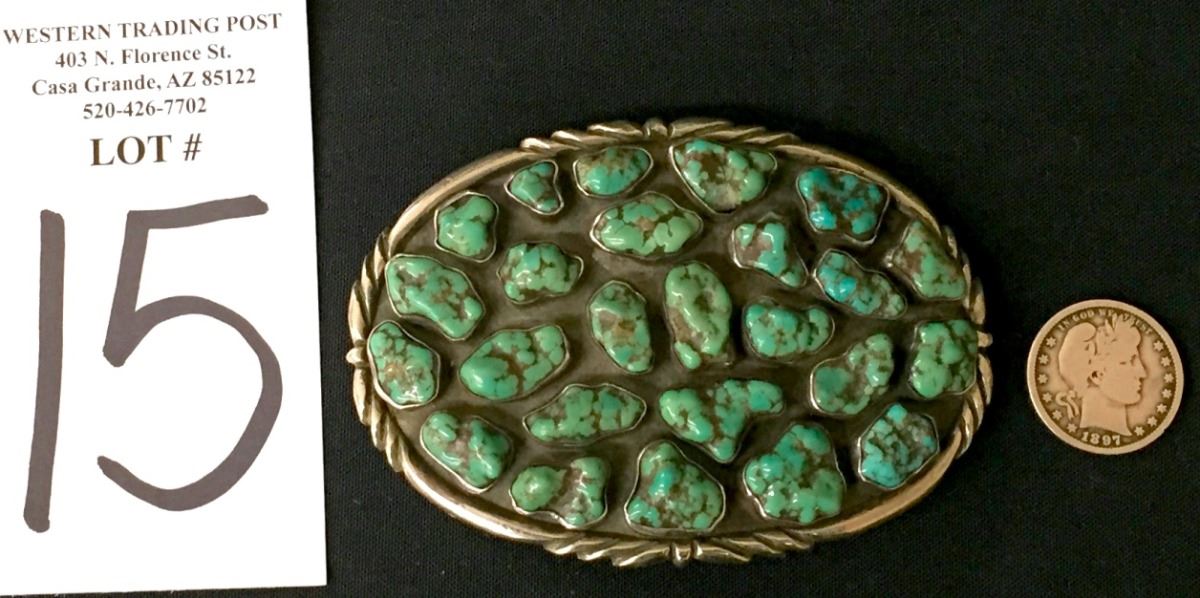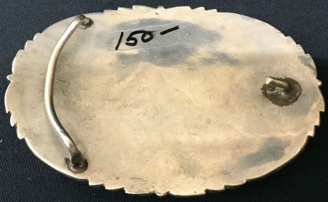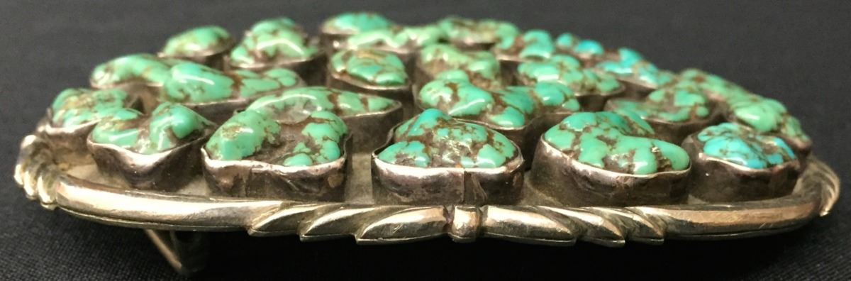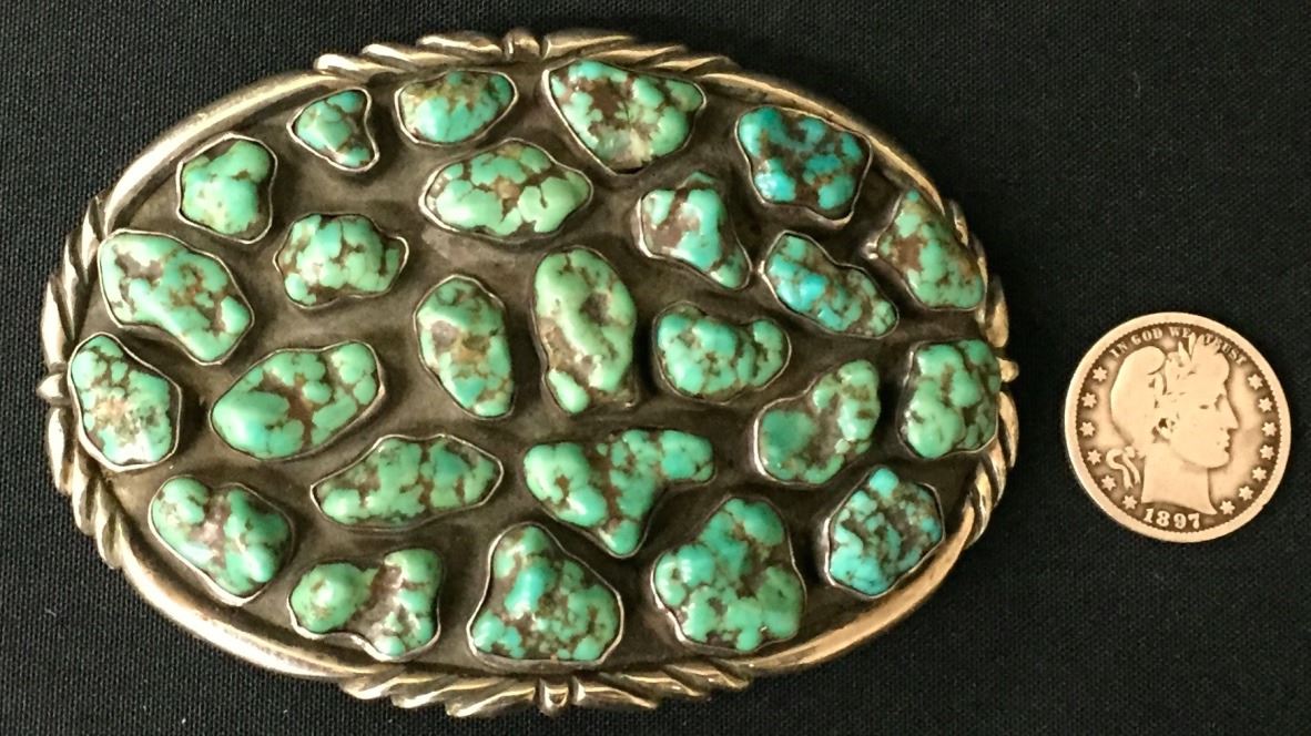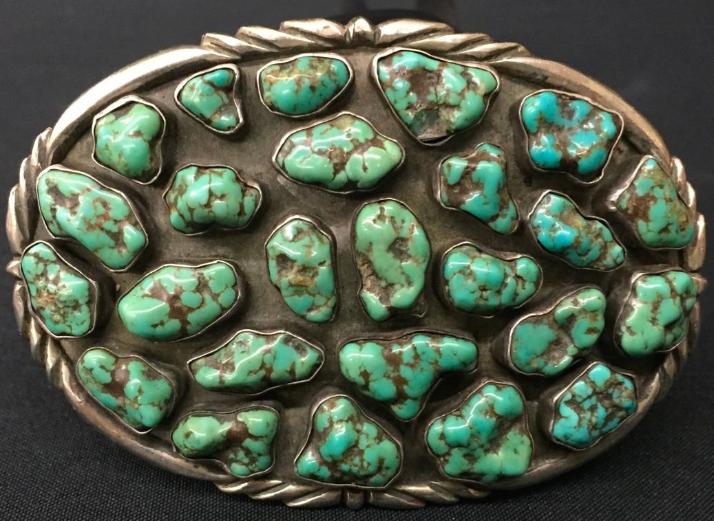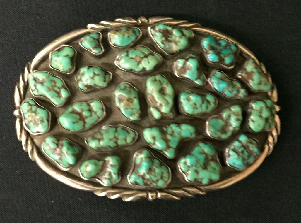 This buckle features 25 free-form cabochons. It measures 4” wide by 2.75” high and weighs 99g. Most likely made with nickel silver. Good condition. Please look closely at the pics as they are an important part of our description. Shipping: There will be a $5 handling / packaging fee for shipping this lot. The actual cost of postage will be added on top of that.